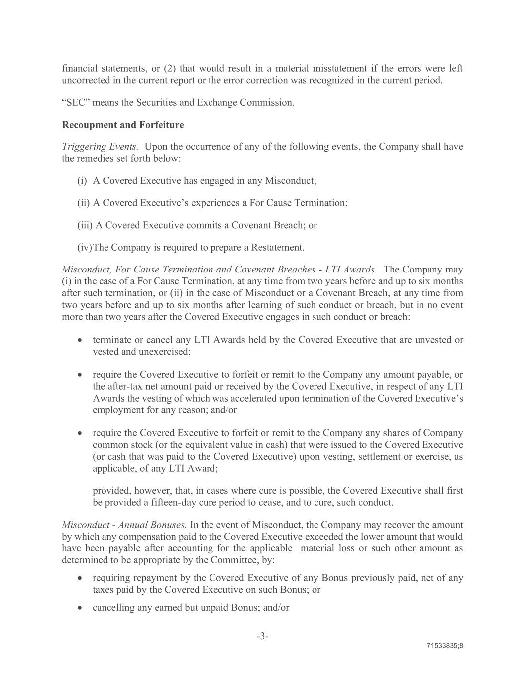 -3- 71533835;8 financial statements, or (2) that would result in a material misstatement if the errors were left uncorrected in the current report or the error correction was recognized in the current period. “SEC” means the Securities and Exchange Commission. Recoupment and Forfeiture Triggering Events. Upon the occurrence of any of the following events, the Company shall have the remedies set forth below: (i) A Covered Executive has engaged in any Misconduct; (ii) A Covered Executive’s experiences a For Cause Termination; (iii) A Covered Executive commits a Covenant Breach; or (iv) The Company is required to prepare a Restatement. Misconduct, For Cause Termination and Covenant Breaches - LTI Awards. The Company may (i) in the case of a For Cause Termination, at any time from two years before and up to six months after such termination, or (ii) in the case of Misconduct or a Covenant Breach, at any time from two years before and up to six months after learning of such conduct or breach, but in no event more than two years after the Covered Executive engages in such conduct or breach: terminate or cancel any LTI Awards held by the Covered Executive that are unvested or vested and unexercised; require the Covered Executive to forfeit or remit to the Company any amount payable, or the after-tax net amount paid or received by the Covered Executive, in respect of any LTI Awards the vesting of which was accelerated upon termination of the Covered Executive’s employment for any reason; and/or require the Covered Executive to forfeit or remit to the Company any shares of Company common stock (or the equivalent value in cash) that were issued to the Covered Executive (or cash that was paid to the Covered Executive) upon vesting, settlement or exercise, as applicable, of any LTI Award; provided, however, that, in cases where cure is possible, the Covered Executive shall first be provided a fifteen-day cure period to cease, and to cure, such conduct. Misconduct - Annual Bonuses. In the event of Misconduct, the Company may recover the amount by which any compensation paid to the Covered Executive exceeded the lower amount that would have been payable after accounting for the applicable material loss or such other amount as determined to be appropriate by the Committee, by: requiring repayment by the Covered Executive of any Bonus previously paid, net of any taxes paid by the Covered Executive on such Bonus; or cancelling any earned but unpaid Bonus; and/or