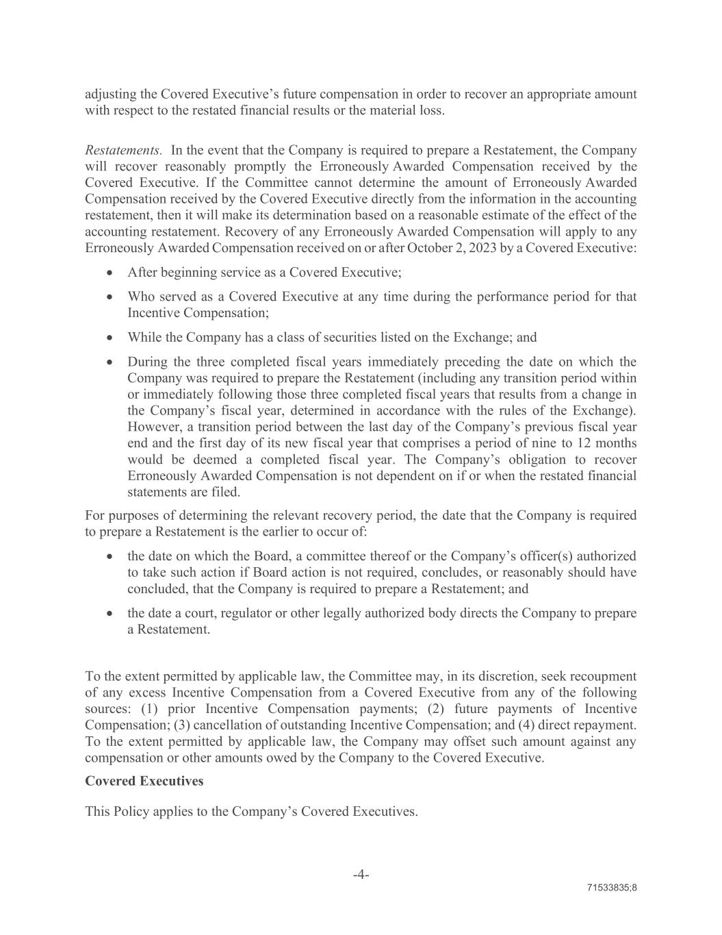 -4- 71533835;8 adjusting the Covered Executive’s future compensation in order to recover an appropriate amount with respect to the restated financial results or the material loss. Restatements. In the event that the Company is required to prepare a Restatement, the Company will recover reasonably promptly the Erroneously Awarded Compensation received by the Covered Executive. If the Committee cannot determine the amount of Erroneously Awarded Compensation received by the Covered Executive directly from the information in the accounting restatement, then it will make its determination based on a reasonable estimate of the effect of the accounting restatement. Recovery of any Erroneously Awarded Compensation will apply to any Erroneously Awarded Compensation received on or after October 2, 2023 by a Covered Executive: After beginning service as a Covered Executive; Who served as a Covered Executive at any time during the performance period for that Incentive Compensation; While the Company has a class of securities listed on the Exchange; and During the three completed fiscal years immediately preceding the date on which the Company was required to prepare the Restatement (including any transition period within or immediately following those three completed fiscal years that results from a change in the Company’s fiscal year, determined in accordance with the rules of the Exchange). However, a transition period between the last day of the Company’s previous fiscal year end and the first day of its new fiscal year that comprises a period of nine to 12 months would be deemed a completed fiscal year. The Company’s obligation to recover Erroneously Awarded Compensation is not dependent on if or when the restated financial statements are filed. For purposes of determining the relevant recovery period, the date that the Company is required to prepare a Restatement is the earlier to occur of: the date on which the Board, a committee thereof or the Company’s officer(s) authorized to take such action if Board action is not required, concludes, or reasonably should have concluded, that the Company is required to prepare a Restatement; and the date a court, regulator or other legally authorized body directs the Company to prepare a Restatement. To the extent permitted by applicable law, the Committee may, in its discretion, seek recoupment of any excess Incentive Compensation from a Covered Executive from any of the following sources: (1) prior Incentive Compensation payments; (2) future payments of Incentive Compensation; (3) cancellation of outstanding Incentive Compensation; and (4) direct repayment. To the extent permitted by applicable law, the Company may offset such amount against any compensation or other amounts owed by the Company to the Covered Executive. Covered Executives This Policy applies to the Company’s Covered Executives.