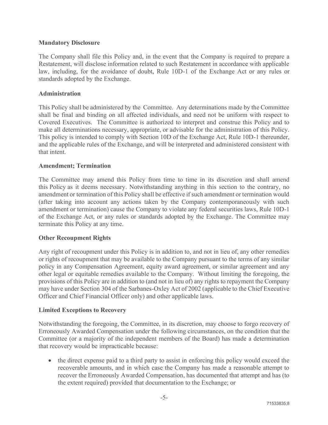 -5- 71533835;8 Mandatory Disclosure The Company shall file this Policy and, in the event that the Company is required to prepare a Restatement, will disclose information related to such Restatement in accordance with applicable law, including, for the avoidance of doubt, Rule 10D-1 of the Exchange Act or any rules or standards adopted by the Exchange. Administration This Policy shall be administered by the Committee. Any determinations made by the Committee shall be final and binding on all affected individuals, and need not be uniform with respect to Covered Executives. The Committee is authorized to interpret and construe this Policy and to make all determinations necessary, appropriate, or advisable for the administration of this Policy. This policy is intended to comply with Section 10D of the Exchange Act, Rule 10D-1 thereunder, and the applicable rules of the Exchange, and will be interpreted and administered consistent with that intent. Amendment; Termination The Committee may amend this Policy from time to time in its discretion and shall amend this Policy as it deems necessary. Notwithstanding anything in this section to the contrary, no amendment or termination of this Policy shall be effective if such amendment or termination would (after taking into account any actions taken by the Company contemporaneously with such amendment or termination) cause the Company to violate any federal securities laws, Rule 10D-1 of the Exchange Act, or any rules or standards adopted by the Exchange. The Committee may terminate this Policy at any time. Other Recoupment Rights Any right of recoupment under this Policy is in addition to, and not in lieu of, any other remedies or rights of recoupment that may be available to the Company pursuant to the terms of any similar policy in any Compensation Agreement, equity award agreement, or similar agreement and any other legal or equitable remedies available to the Company. Without limiting the foregoing, the provisions of this Policy are in addition to (and not in lieu of) any rights to repayment the Company may have under Section 304 of the Sarbanes-Oxley Act of 2002 (applicable to the Chief Executive Officer and Chief Financial Officer only) and other applicable laws. Limited Exceptions to Recovery Notwithstanding the foregoing, the Committee, in its discretion, may choose to forgo recovery of Erroneously Awarded Compensation under the following circumstances, on the condition that the Committee (or a majority of the independent members of the Board) has made a determination that recovery would be impracticable because: the direct expense paid to a third party to assist in enforcing this policy would exceed the recoverable amounts, and in which case the Company has made a reasonable attempt to recover the Erroneously Awarded Compensation, has documented that attempt and has (to the extent required) provided that documentation to the Exchange; or
