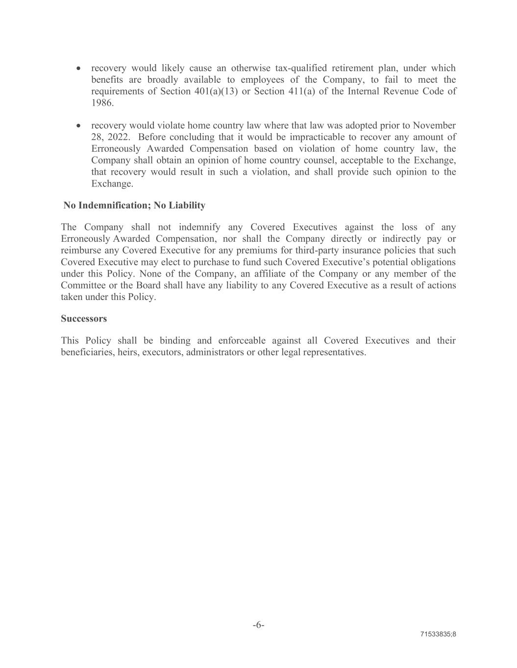 -6- 71533835;8 recovery would likely cause an otherwise tax‐qualified retirement plan, under which benefits are broadly available to employees of the Company, to fail to meet the requirements of Section 401(a)(13) or Section 411(a) of the Internal Revenue Code of 1986. recovery would violate home country law where that law was adopted prior to November 28, 2022. Before concluding that it would be impracticable to recover any amount of Erroneously Awarded Compensation based on violation of home country law, the Company shall obtain an opinion of home country counsel, acceptable to the Exchange, that recovery would result in such a violation, and shall provide such opinion to the Exchange. No Indemnification; No Liability The Company shall not indemnify any Covered Executives against the loss of any Erroneously Awarded Compensation, nor shall the Company directly or indirectly pay or reimburse any Covered Executive for any premiums for third-party insurance policies that such Covered Executive may elect to purchase to fund such Covered Executive’s potential obligations under this Policy. None of the Company, an affiliate of the Company or any member of the Committee or the Board shall have any liability to any Covered Executive as a result of actions taken under this Policy. Successors This Policy shall be binding and enforceable against all Covered Executives and their beneficiaries, heirs, executors, administrators or other legal representatives.