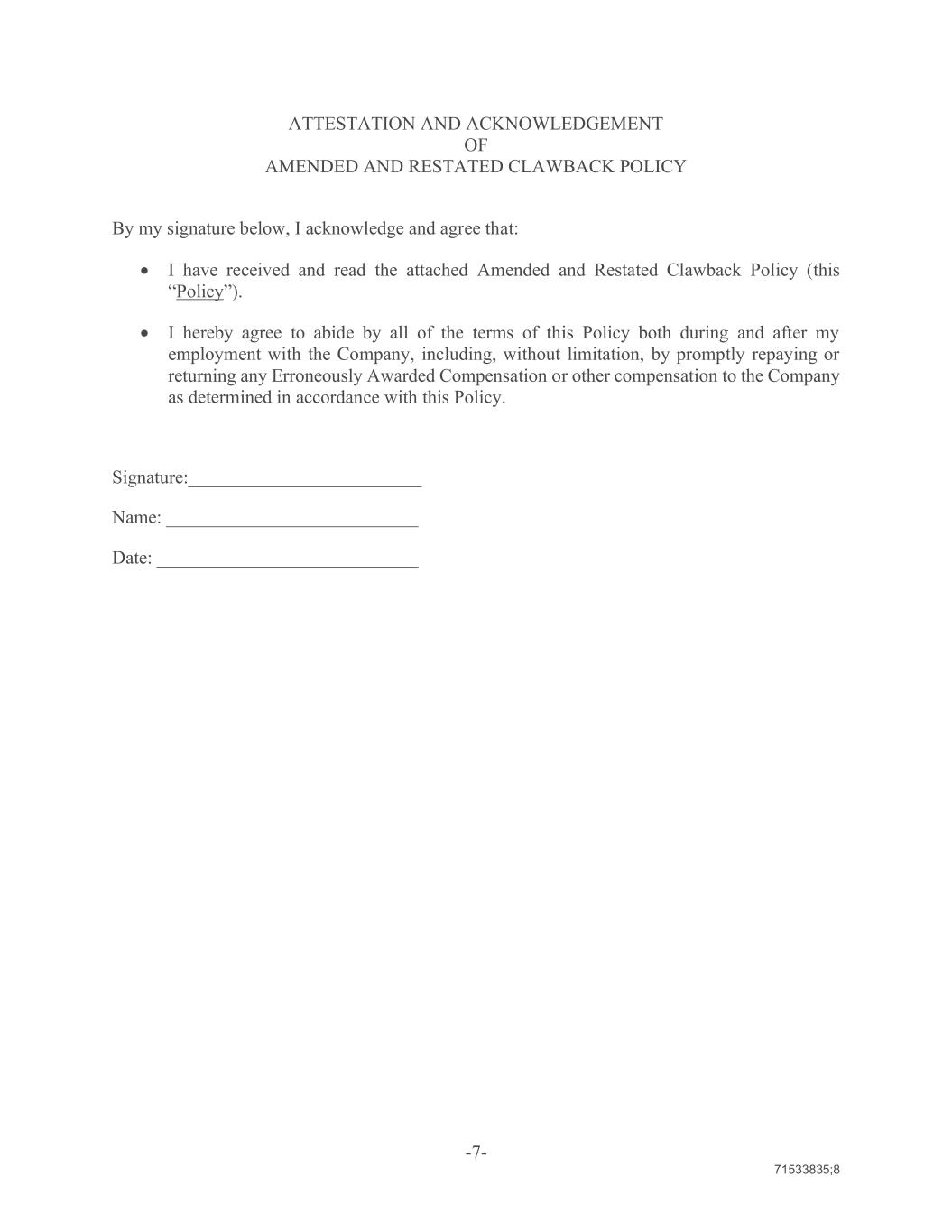 -7- 71533835;8 ATTESTATION AND ACKNOWLEDGEMENT OF AMENDED AND RESTATED CLAWBACK POLICY By my signature below, I acknowledge and agree that: I have received and read the attached Amended and Restated Clawback Policy (this “Policy”). I hereby agree to abide by all of the terms of this Policy both during and after my employment with the Company, including, without limitation, by promptly repaying or returning any Erroneously Awarded Compensation or other compensation to the Company as determined in accordance with this Policy. Signature:_________________________ Name: ___________________________ Date: ____________________________