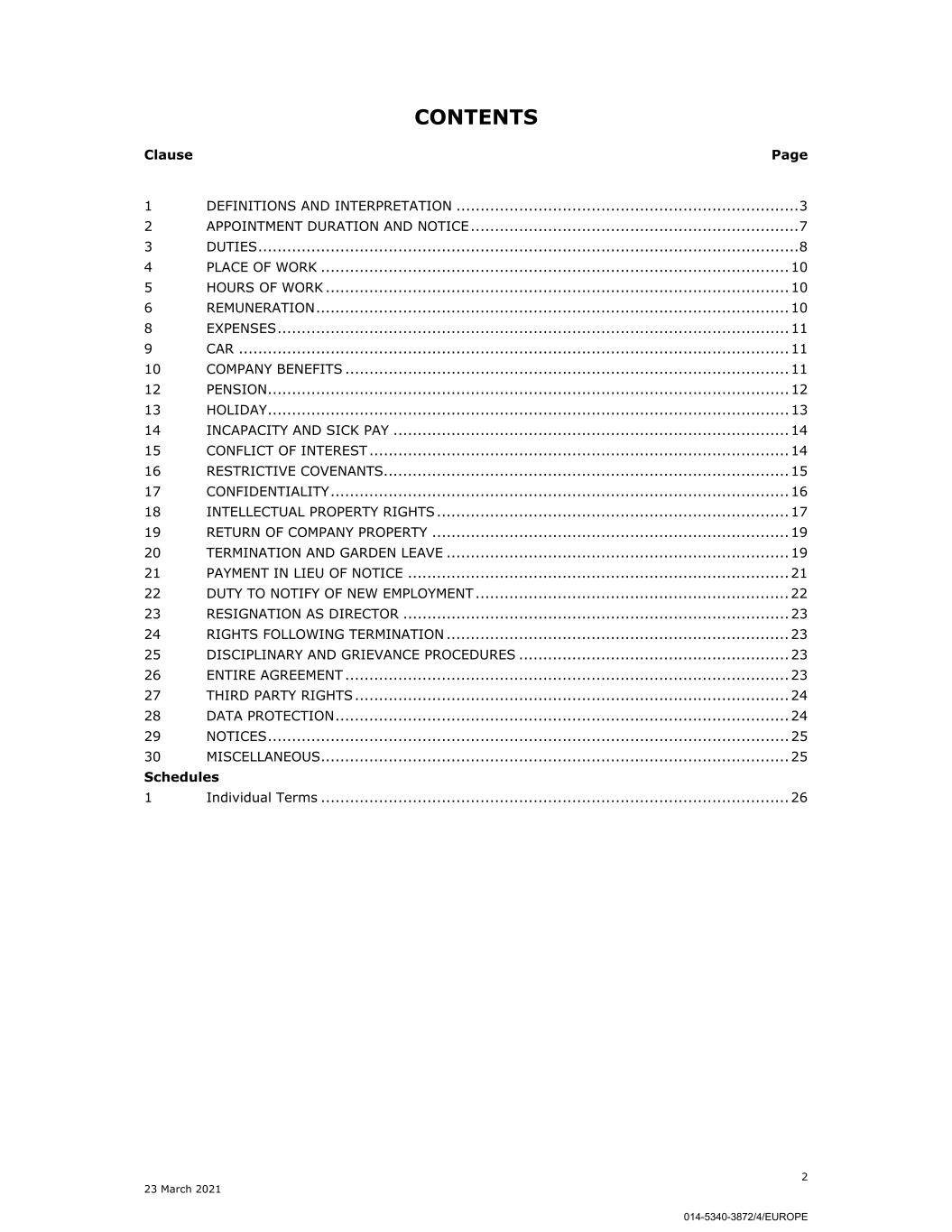 2 23 March 2021 014-5340-3872/4/EUROPE CONTENTS Clause Page 1  DEFINITIONS AND INTERPRETATION ....................................................................... 3  2  APPOINTMENT DURATION AND NOTICE .................................................................... 7  3  DUTIES ................................................................................................................ 8  4  PLACE OF WORK ................................................................................................. 10  5  HOURS OF WORK ................................................................................................ 10  6  REMUNERATION .................................................................................................. 10  8  EXPENSES .......................................................................................................... 11  9  CAR .................................................................................................................. 11  10  COMPANY BENEFITS ............................................................................................ 11  12  PENSION ............................................................................................................ 12  13  HOLIDAY ............................................................................................................ 13  14  INCAPACITY AND SICK PAY .................................................................................. 14  15  CONFLICT OF INTEREST ....................................................................................... 14  16  RESTRICTIVE COVENANTS .................................................................................... 15  17  CONFIDENTIALITY ............................................................................................... 16  18  INTELLECTUAL PROPERTY RIGHTS ......................................................................... 17  19  RETURN OF COMPANY PROPERTY .......................................................................... 19  20  TERMINATION AND GARDEN LEAVE ....................................................................... 19  21  PAYMENT IN LIEU OF NOTICE ............................................................................... 21  22  DUTY TO NOTIFY OF NEW EMPLOYMENT ................................................................. 22  23  RESIGNATION AS DIRECTOR ................................................................................ 23  24  RIGHTS FOLLOWING TERMINATION ....................................................................... 23  25  DISCIPLINARY AND GRIEVANCE PROCEDURES ........................................................ 23  26  ENTIRE AGREEMENT ............................................................................................ 23  27  THIRD PARTY RIGHTS .......................................................................................... 24  28  DATA PROTECTION .............................................................................................. 24  29  NOTICES ............................................................................................................ 25  30  MISCELLANEOUS ................................................................................................. 25  Schedules  1  Individual Terms ................................................................................................. 26