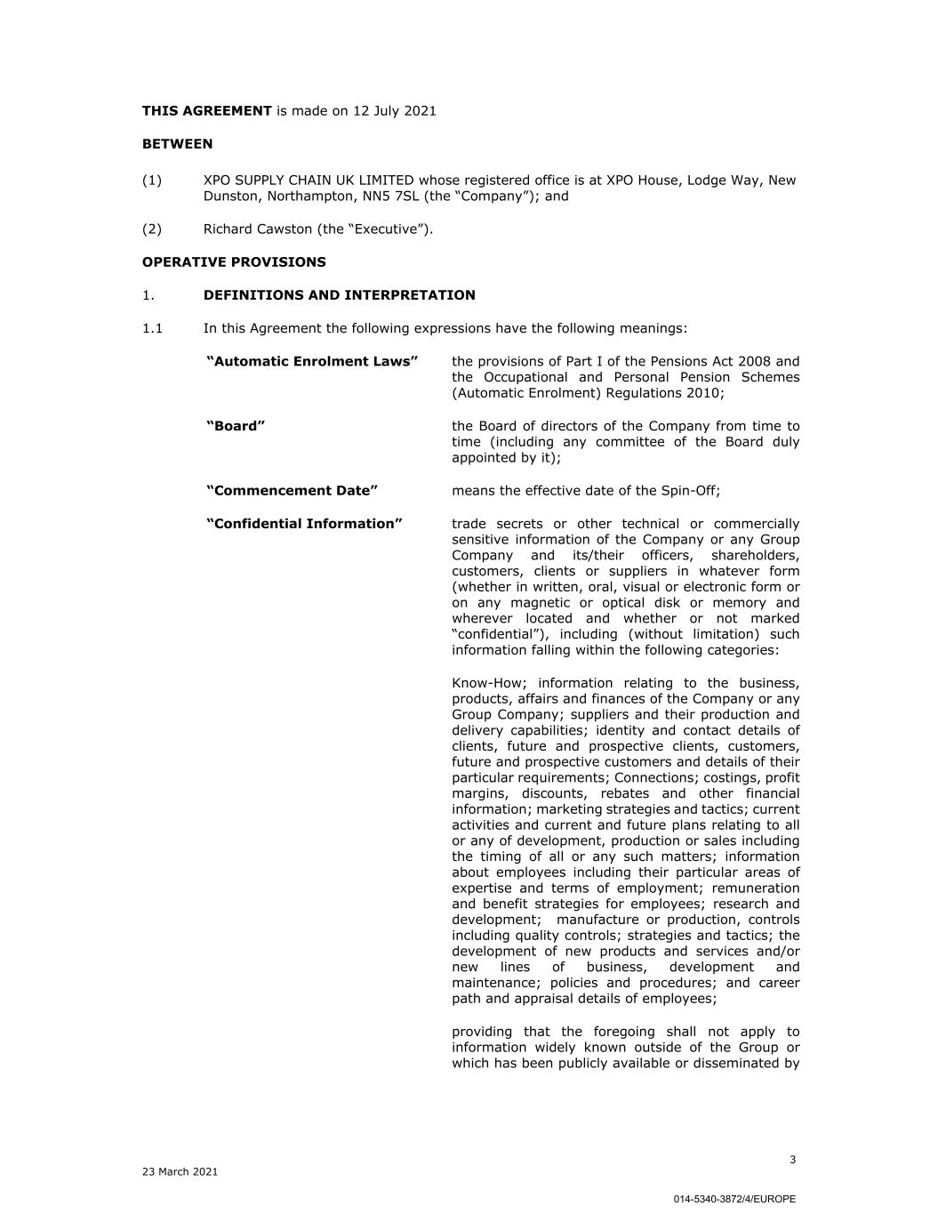 3 23 March 2021 014-5340-3872/4/EUROPE THIS AGREEMENT is made on 12 July 2021 BETWEEN (1) XPO SUPPLY CHAIN UK LIMITED whose registered office is at XPO House, Lodge Way, New Dunston, Northampton, NN5 7SL (the “Company”); and (2) Richard Cawston (the “Executive”). OPERATIVE PROVISIONS 1. DEFINITIONS AND INTERPRETATION 1.1 In this Agreement the following expressions have the following meanings: “Automatic Enrolment Laws” the provisions of Part I of the Pensions Act 2008 and the Occupational and Personal Pension Schemes (Automatic Enrolment) Regulations 2010; “Board” the Board of directors of the Company from time to time (including any committee of the Board duly appointed by it); “Commencement Date” means the effective date of the Spin-Off; “Confidential Information” trade secrets or other technical or commercially sensitive information of the Company or any Group Company and its/their officers, shareholders, customers, clients or suppliers in whatever form (whether in written, oral, visual or electronic form or on any magnetic or optical disk or memory and wherever located and whether or not marked “confidential”), including (without limitation) such information falling within the following categories: Know-How; information relating to the business, products, affairs and finances of the Company or any Group Company; suppliers and their production and delivery capabilities; identity and contact details of clients, future and prospective clients, customers, future and prospective customers and details of their particular requirements; Connections; costings, profit margins, discounts, rebates and other financial information; marketing strategies and tactics; current activities and current and future plans relating to all or any of development, production or sales including the timing of all or any such matters; information about employees including their particular areas of expertise and terms of employment; remuneration and benefit strategies for employees; research and development; manufacture or production, controls including quality controls; strategies and tactics; the development of new products and services and/or new lines of business, development and maintenance; policies and procedures; and career path and appraisal details of employees; providing that the foregoing shall not apply to information widely known outside of the Group or which has been publicly available or disseminated by