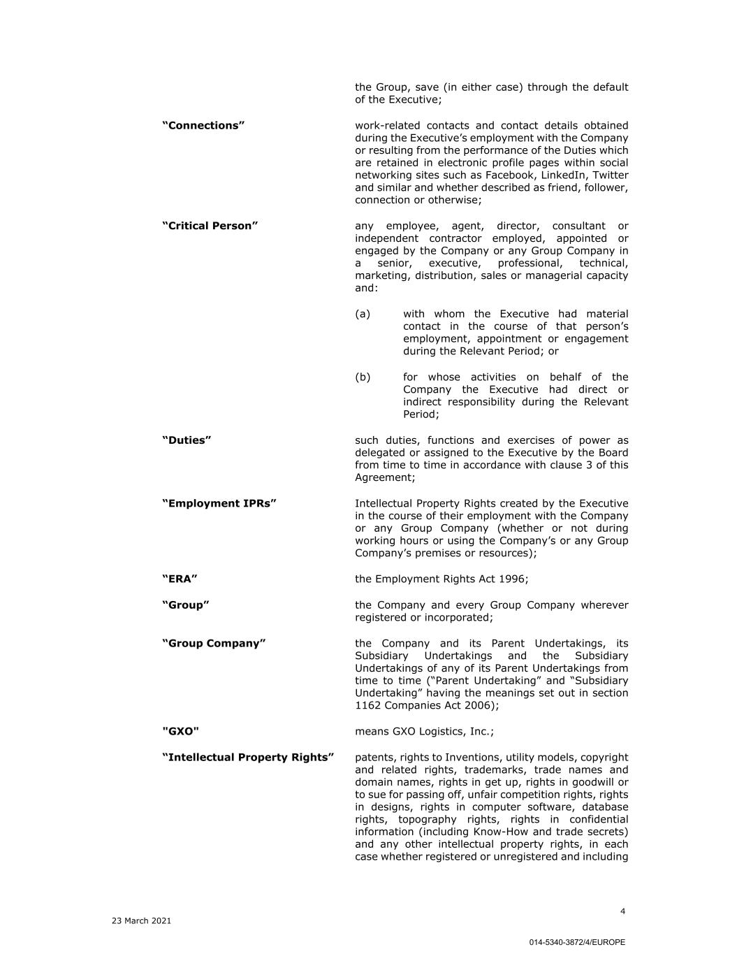 4 23 March 2021 014-5340-3872/4/EUROPE the Group, save (in either case) through the default of the Executive; “Connections” work-related contacts and contact details obtained during the Executive’s employment with the Company or resulting from the performance of the Duties which are retained in electronic profile pages within social networking sites such as Facebook, LinkedIn, Twitter and similar and whether described as friend, follower, connection or otherwise; “Critical Person” any employee, agent, director, consultant or independent contractor employed, appointed or engaged by the Company or any Group Company in a senior, executive, professional, technical, marketing, distribution, sales or managerial capacity and: (a) with whom the Executive had material contact in the course of that person’s employment, appointment or engagement during the Relevant Period; or (b) for whose activities on behalf of the Company the Executive had direct or indirect responsibility during the Relevant Period; “Duties” such duties, functions and exercises of power as delegated or assigned to the Executive by the Board from time to time in accordance with clause 3 of this Agreement; “Employment IPRs” Intellectual Property Rights created by the Executive in the course of their employment with the Company or any Group Company (whether or not during working hours or using the Company’s or any Group Company’s premises or resources); “ERA” the Employment Rights Act 1996; “Group” the Company and every Group Company wherever registered or incorporated; “Group Company” the Company and its Parent Undertakings, its Subsidiary Undertakings and the Subsidiary Undertakings of any of its Parent Undertakings from time to time (“Parent Undertaking” and “Subsidiary Undertaking” having the meanings set out in section 1162 Companies Act 2006); "GXO" means GXO Logistics, Inc.; “Intellectual Property Rights” patents, rights to Inventions, utility models, copyright and related rights, trademarks, trade names and domain names, rights in get up, rights in goodwill or to sue for passing off, unfair competition rights, rights in designs, rights in computer software, database rights, topography rights, rights in confidential information (including Know-How and trade secrets) and any other intellectual property rights, in each case whether registered or unregistered and including