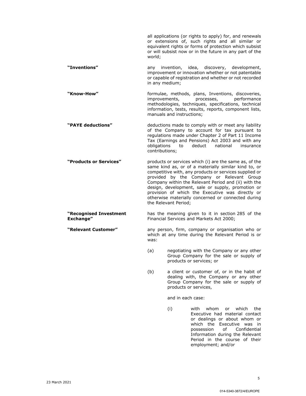 5 23 March 2021 014-5340-3872/4/EUROPE all applications (or rights to apply) for, and renewals or extensions of, such rights and all similar or equivalent rights or forms of protection which subsist or will subsist now or in the future in any part of the world; “Inventions” any invention, idea, discovery, development, improvement or innovation whether or not patentable or capable of registration and whether or not recorded in any medium; “Know-How” formulae, methods, plans, Inventions, discoveries, improvements, processes, performance methodologies, techniques, specifications, technical information, tests, results, reports, component lists, manuals and instructions; “PAYE deductions” deductions made to comply with or meet any liability of the Company to account for tax pursuant to regulations made under Chapter 2 of Part 11 Income Tax (Earnings and Pensions) Act 2003 and with any obligations to deduct national insurance contributions; “Products or Services” products or services which (i) are the same as, of the same kind as, or of a materially similar kind to, or competitive with, any products or services supplied or provided by the Company or Relevant Group Company within the Relevant Period and (ii) with the design, development, sale or supply, promotion or provision of which the Executive was directly or otherwise materially concerned or connected during the Relevant Period; “Recognised Investment Exchange” has the meaning given to it in section 285 of the Financial Services and Markets Act 2000; “Relevant Customer” any person, firm, company or organisation who or which at any time during the Relevant Period is or was: (a) negotiating with the Company or any other Group Company for the sale or supply of products or services; or (b) a client or customer of, or in the habit of dealing with, the Company or any other Group Company for the sale or supply of products or services, and in each case: (i) with whom or which the Executive had material contact or dealings or about whom or which the Executive was in possession of Confidential Information during the Relevant Period in the course of their employment; and/or