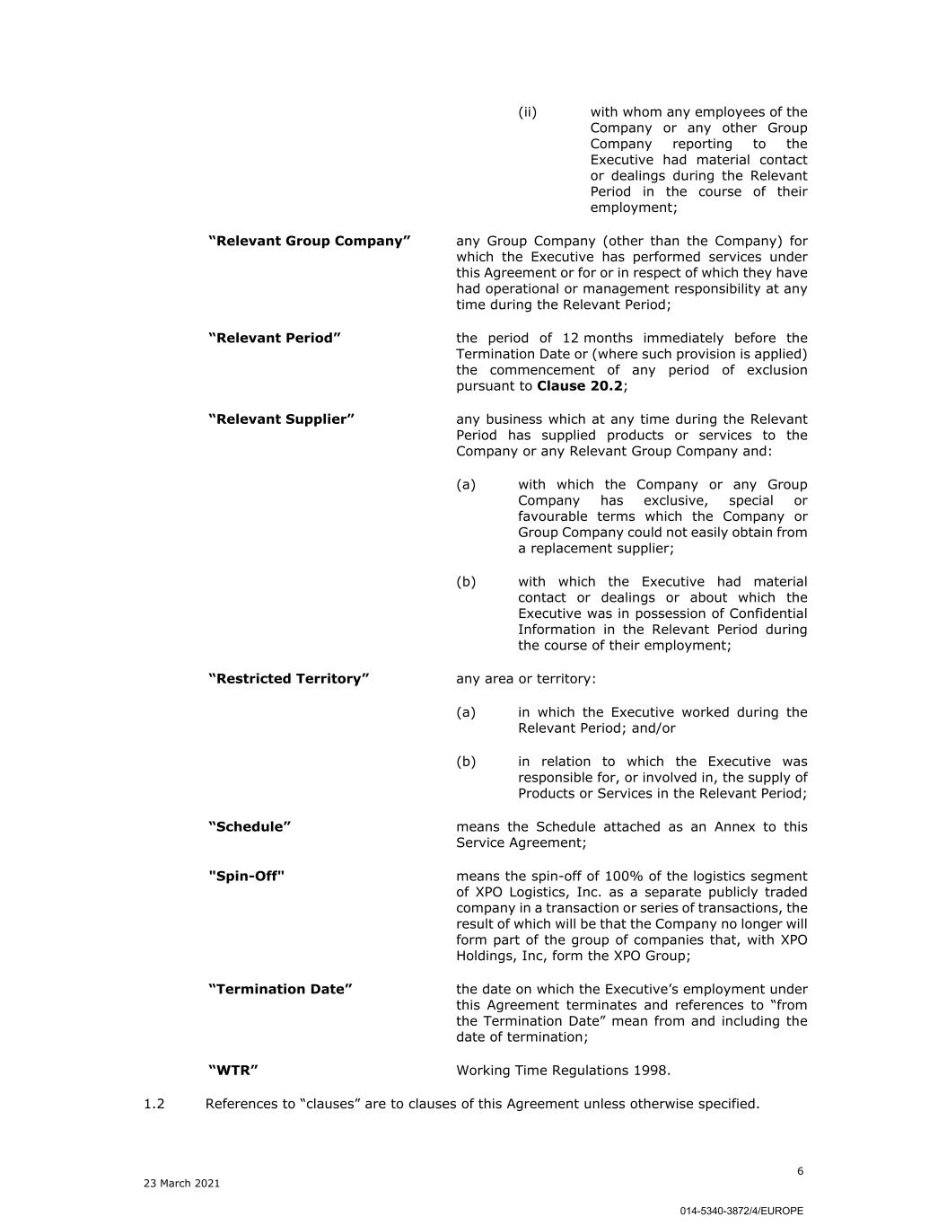 6 23 March 2021 014-5340-3872/4/EUROPE (ii) with whom any employees of the Company or any other Group Company reporting to the Executive had material contact or dealings during the Relevant Period in the course of their employment; “Relevant Group Company” any Group Company (other than the Company) for which the Executive has performed services under this Agreement or for or in respect of which they have had operational or management responsibility at any time during the Relevant Period; “Relevant Period” the period of 12 months immediately before the Termination Date or (where such provision is applied) the commencement of any period of exclusion pursuant to Clause 20.2; “Relevant Supplier” any business which at any time during the Relevant Period has supplied products or services to the Company or any Relevant Group Company and: (a) with which the Company or any Group Company has exclusive, special or favourable terms which the Company or Group Company could not easily obtain from a replacement supplier; (b) with which the Executive had material contact or dealings or about which the Executive was in possession of Confidential Information in the Relevant Period during the course of their employment; “Restricted Territory” any area or territory: (a) in which the Executive worked during the Relevant Period; and/or (b) in relation to which the Executive was responsible for, or involved in, the supply of Products or Services in the Relevant Period; “Schedule” means the Schedule attached as an Annex to this Service Agreement; "Spin-Off" means the spin-off of 100% of the logistics segment of XPO Logistics, Inc. as a separate publicly traded company in a transaction or series of transactions, the result of which will be that the Company no longer will form part of the group of companies that, with XPO Holdings, Inc, form the XPO Group; “Termination Date” the date on which the Executive’s employment under this Agreement terminates and references to “from the Termination Date” mean from and including the date of termination; “WTR” Working Time Regulations 1998. 1.2 References to “clauses” are to clauses of this Agreement unless otherwise specified.