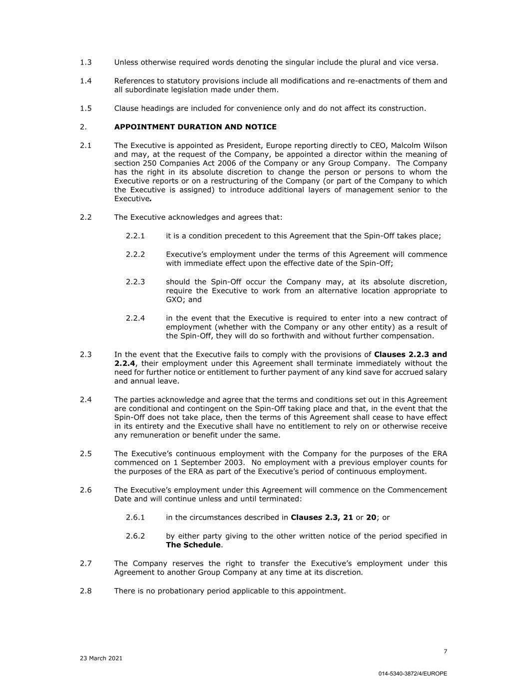 7 23 March 2021 014-5340-3872/4/EUROPE 1.3 Unless otherwise required words denoting the singular include the plural and vice versa. 1.4 References to statutory provisions include all modifications and re-enactments of them and all subordinate legislation made under them. 1.5 Clause headings are included for convenience only and do not affect its construction. 2. APPOINTMENT DURATION AND NOTICE 2.1 The Executive is appointed as President, Europe reporting directly to CEO, Malcolm Wilson and may, at the request of the Company, be appointed a director within the meaning of section 250 Companies Act 2006 of the Company or any Group Company. The Company has the right in its absolute discretion to change the person or persons to whom the Executive reports or on a restructuring of the Company (or part of the Company to which the Executive is assigned) to introduce additional layers of management senior to the Executive. 2.2 The Executive acknowledges and agrees that: 2.2.1 it is a condition precedent to this Agreement that the Spin-Off takes place; 2.2.2 Executive’s employment under the terms of this Agreement will commence with immediate effect upon the effective date of the Spin-Off; 2.2.3 should the Spin-Off occur the Company may, at its absolute discretion, require the Executive to work from an alternative location appropriate to GXO; and 2.2.4 in the event that the Executive is required to enter into a new contract of employment (whether with the Company or any other entity) as a result of the Spin-Off, they will do so forthwith and without further compensation. 2.3 In the event that the Executive fails to comply with the provisions of Clauses 2.2.3 and 2.2.4, their employment under this Agreement shall terminate immediately without the need for further notice or entitlement to further payment of any kind save for accrued salary and annual leave. 2.4 The parties acknowledge and agree that the terms and conditions set out in this Agreement are conditional and contingent on the Spin-Off taking place and that, in the event that the Spin-Off does not take place, then the terms of this Agreement shall cease to have effect in its entirety and the Executive shall have no entitlement to rely on or otherwise receive any remuneration or benefit under the same. 2.5 The Executive’s continuous employment with the Company for the purposes of the ERA commenced on 1 September 2003. No employment with a previous employer counts for the purposes of the ERA as part of the Executive’s period of continuous employment. 2.6 The Executive’s employment under this Agreement will commence on the Commencement Date and will continue unless and until terminated: 2.6.1 in the circumstances described in Clauses 2.3, 21 or 20; or 2.6.2 by either party giving to the other written notice of the period specified in The Schedule. 2.7 The Company reserves the right to transfer the Executive’s employment under this Agreement to another Group Company at any time at its discretion. 2.8 There is no probationary period applicable to this appointment.