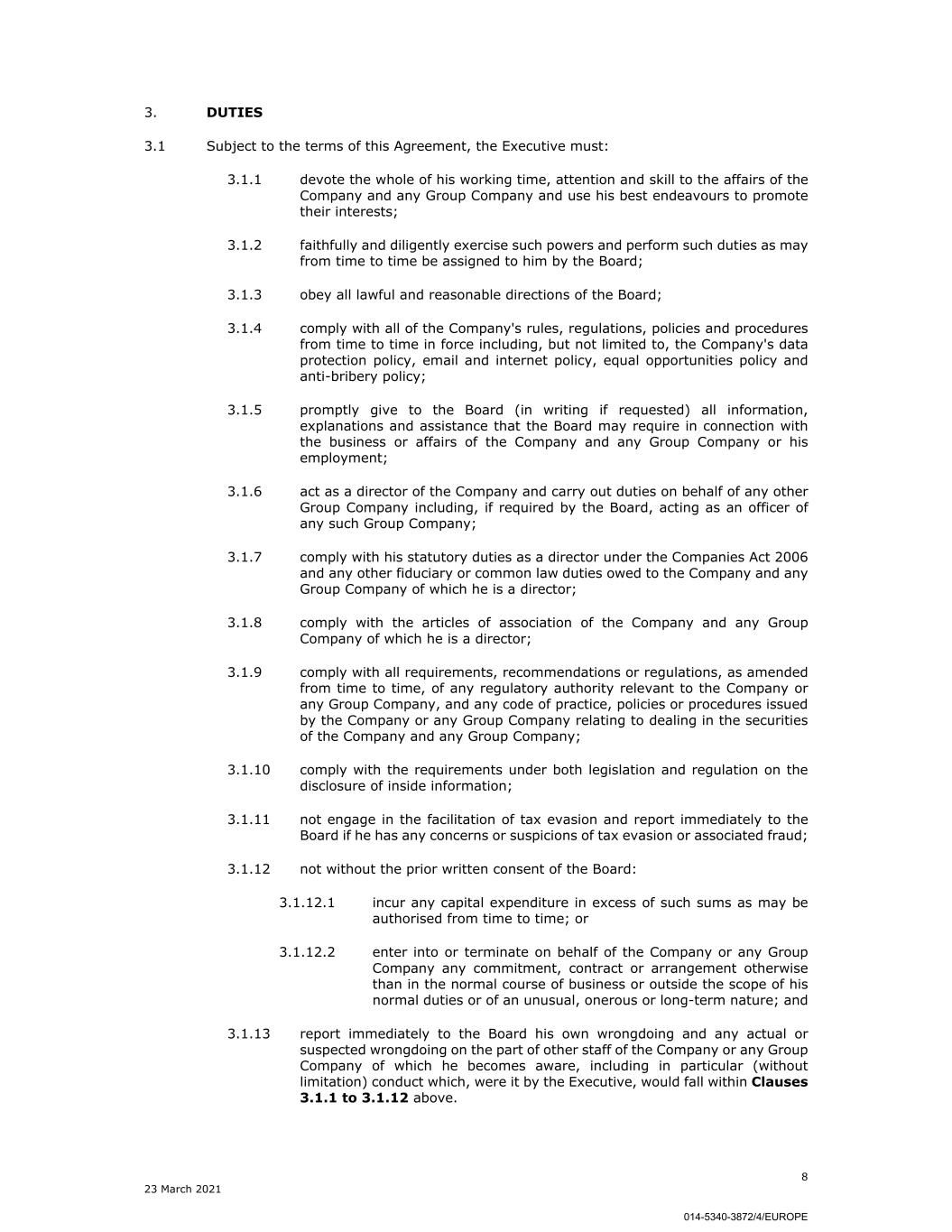 8 23 March 2021 014-5340-3872/4/EUROPE 3. DUTIES 3.1 Subject to the terms of this Agreement, the Executive must: 3.1.1 devote the whole of his working time, attention and skill to the affairs of the Company and any Group Company and use his best endeavours to promote their interests; 3.1.2 faithfully and diligently exercise such powers and perform such duties as may from time to time be assigned to him by the Board; 3.1.3 obey all lawful and reasonable directions of the Board; 3.1.4 comply with all of the Company's rules, regulations, policies and procedures from time to time in force including, but not limited to, the Company's data protection policy, email and internet policy, equal opportunities policy and anti-bribery policy; 3.1.5 promptly give to the Board (in writing if requested) all information, explanations and assistance that the Board may require in connection with the business or affairs of the Company and any Group Company or his employment; 3.1.6 act as a director of the Company and carry out duties on behalf of any other Group Company including, if required by the Board, acting as an officer of any such Group Company; 3.1.7 comply with his statutory duties as a director under the Companies Act 2006 and any other fiduciary or common law duties owed to the Company and any Group Company of which he is a director; 3.1.8 comply with the articles of association of the Company and any Group Company of which he is a director; 3.1.9 comply with all requirements, recommendations or regulations, as amended from time to time, of any regulatory authority relevant to the Company or any Group Company, and any code of practice, policies or procedures issued by the Company or any Group Company relating to dealing in the securities of the Company and any Group Company; 3.1.10 comply with the requirements under both legislation and regulation on the disclosure of inside information; 3.1.11 not engage in the facilitation of tax evasion and report immediately to the Board if he has any concerns or suspicions of tax evasion or associated fraud; 3.1.12 not without the prior written consent of the Board: 3.1.12.1 incur any capital expenditure in excess of such sums as may be authorised from time to time; or 3.1.12.2 enter into or terminate on behalf of the Company or any Group Company any commitment, contract or arrangement otherwise than in the normal course of business or outside the scope of his normal duties or of an unusual, onerous or long-term nature; and 3.1.13 report immediately to the Board his own wrongdoing and any actual or suspected wrongdoing on the part of other staff of the Company or any Group Company of which he becomes aware, including in particular (without limitation) conduct which, were it by the Executive, would fall within Clauses 3.1.1 to 3.1.12 above.