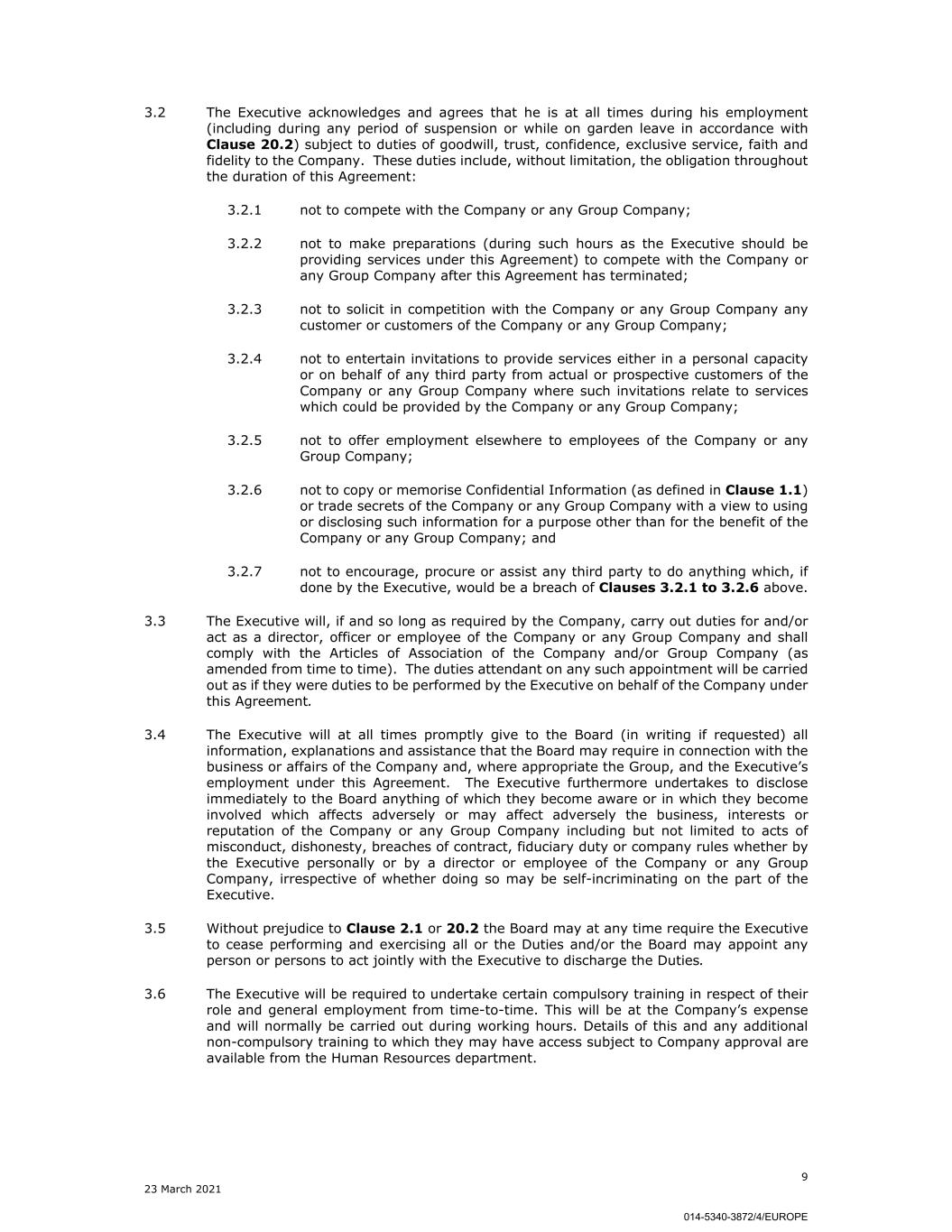 9 23 March 2021 014-5340-3872/4/EUROPE 3.2 The Executive acknowledges and agrees that he is at all times during his employment (including during any period of suspension or while on garden leave in accordance with Clause 20.2) subject to duties of goodwill, trust, confidence, exclusive service, faith and fidelity to the Company. These duties include, without limitation, the obligation throughout the duration of this Agreement: 3.2.1 not to compete with the Company or any Group Company; 3.2.2 not to make preparations (during such hours as the Executive should be providing services under this Agreement) to compete with the Company or any Group Company after this Agreement has terminated; 3.2.3 not to solicit in competition with the Company or any Group Company any customer or customers of the Company or any Group Company; 3.2.4 not to entertain invitations to provide services either in a personal capacity or on behalf of any third party from actual or prospective customers of the Company or any Group Company where such invitations relate to services which could be provided by the Company or any Group Company; 3.2.5 not to offer employment elsewhere to employees of the Company or any Group Company; 3.2.6 not to copy or memorise Confidential Information (as defined in Clause 1.1) or trade secrets of the Company or any Group Company with a view to using or disclosing such information for a purpose other than for the benefit of the Company or any Group Company; and 3.2.7 not to encourage, procure or assist any third party to do anything which, if done by the Executive, would be a breach of Clauses 3.2.1 to 3.2.6 above. 3.3 The Executive will, if and so long as required by the Company, carry out duties for and/or act as a director, officer or employee of the Company or any Group Company and shall comply with the Articles of Association of the Company and/or Group Company (as amended from time to time). The duties attendant on any such appointment will be carried out as if they were duties to be performed by the Executive on behalf of the Company under this Agreement. 3.4 The Executive will at all times promptly give to the Board (in writing if requested) all information, explanations and assistance that the Board may require in connection with the business or affairs of the Company and, where appropriate the Group, and the Executive’s employment under this Agreement. The Executive furthermore undertakes to disclose immediately to the Board anything of which they become aware or in which they become involved which affects adversely or may affect adversely the business, interests or reputation of the Company or any Group Company including but not limited to acts of misconduct, dishonesty, breaches of contract, fiduciary duty or company rules whether by the Executive personally or by a director or employee of the Company or any Group Company, irrespective of whether doing so may be self-incriminating on the part of the Executive. 3.5 Without prejudice to Clause 2.1 or 20.2 the Board may at any time require the Executive to cease performing and exercising all or the Duties and/or the Board may appoint any person or persons to act jointly with the Executive to discharge the Duties. 3.6 The Executive will be required to undertake certain compulsory training in respect of their role and general employment from time-to-time. This will be at the Company’s expense and will normally be carried out during working hours. Details of this and any additional non-compulsory training to which they may have access subject to Company approval are available from the Human Resources department.