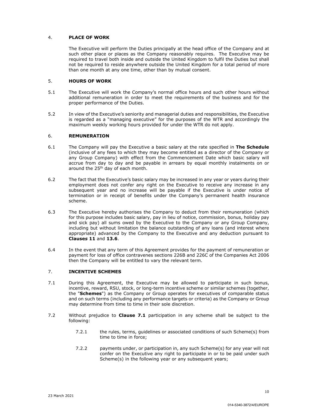 10 23 March 2021 014-5340-3872/4/EUROPE 4. PLACE OF WORK The Executive will perform the Duties principally at the head office of the Company and at such other place or places as the Company reasonably requires. The Executive may be required to travel both inside and outside the United Kingdom to fulfil the Duties but shall not be required to reside anywhere outside the United Kingdom for a total period of more than one month at any one time, other than by mutual consent. 5. HOURS OF WORK 5.1 The Executive will work the Company’s normal office hours and such other hours without additional remuneration in order to meet the requirements of the business and for the proper performance of the Duties. 5.2 In view of the Executive’s seniority and managerial duties and responsibilities, the Executive is regarded as a “managing executive” for the purposes of the WTR and accordingly the maximum weekly working hours provided for under the WTR do not apply. 6. REMUNERATION 6.1 The Company will pay the Executive a basic salary at the rate specified in The Schedule (inclusive of any fees to which they may become entitled as a director of the Company or any Group Company) with effect from the Commencement Date which basic salary will accrue from day to day and be payable in arrears by equal monthly instalments on or around the 25th day of each month. 6.2 The fact that the Executive’s basic salary may be increased in any year or years during their employment does not confer any right on the Executive to receive any increase in any subsequent year and no increase will be payable if the Executive is under notice of termination or in receipt of benefits under the Company’s permanent health insurance scheme. 6.3 The Executive hereby authorises the Company to deduct from their remuneration (which for this purpose includes basic salary, pay in lieu of notice, commission, bonus, holiday pay and sick pay) all sums owed by the Executive to the Company or any Group Company, including but without limitation the balance outstanding of any loans (and interest where appropriate) advanced by the Company to the Executive and any deduction pursuant to Clauses 11 and 13.6. 6.4 In the event that any term of this Agreement provides for the payment of remuneration or payment for loss of office contravenes sections 226B and 226C of the Companies Act 2006 then the Company will be entitled to vary the relevant term. 7. INCENTIVE SCHEMES 7.1 During this Agreement, the Executive may be allowed to participate in such bonus, incentive, reward, RSU, stock, or long-term incentive scheme or similar schemes (together, the "Schemes") as the Company or Group operates for executives of comparable status and on such terms (including any performance targets or criteria) as the Company or Group may determine from time to time in their sole discretion. 7.2 Without prejudice to Clause 7.1 participation in any scheme shall be subject to the following: 7.2.1 the rules, terms, guidelines or associated conditions of such Scheme(s) from time to time in force; 7.2.2 payments under, or participation in, any such Scheme(s) for any year will not confer on the Executive any right to participate in or to be paid under such Scheme(s) in the following year or any subsequent years;