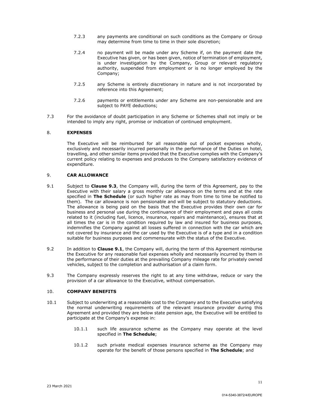 11 23 March 2021 014-5340-3872/4/EUROPE 7.2.3 any payments are conditional on such conditions as the Company or Group may determine from time to time in their sole discretion; 7.2.4 no payment will be made under any Scheme if, on the payment date the Executive has given, or has been given, notice of termination of employment, is under investigation by the Company, Group or relevant regulatory authority, suspended from employment or is no longer employed by the Company; 7.2.5 any Scheme is entirely discretionary in nature and is not incorporated by reference into this Agreement; 7.2.6 payments or entitlements under any Scheme are non-pensionable and are subject to PAYE deductions; 7.3 For the avoidance of doubt participation in any Scheme or Schemes shall not imply or be intended to imply any right, promise or indication of continued employment. 8. EXPENSES The Executive will be reimbursed for all reasonable out of pocket expenses wholly, exclusively and necessarily incurred personally in the performance of the Duties on hotel, travelling, and other similar items provided that the Executive complies with the Company’s current policy relating to expenses and produces to the Company satisfactory evidence of expenditure. 9. CAR ALLOWANCE 9.1 Subject to Clause 9.3, the Company will, during the term of this Agreement, pay to the Executive with their salary a gross monthly car allowance on the terms and at the rate specified in The Schedule (or such higher rate as may from time to time be notified to them). The car allowance is non pensionable and will be subject to statutory deductions. The allowance is being paid on the basis that the Executive provides their own car for business and personal use during the continuance of their employment and pays all costs related to it (including fuel, licence, insurance, repairs and maintenance), ensures that at all times the car is in the condition required by law and insured for business purposes, indemnifies the Company against all losses suffered in connection with the car which are not covered by insurance and the car used by the Executive is of a type and in a condition suitable for business purposes and commensurate with the status of the Executive. 9.2 In addition to Clause 9.1, the Company will, during the term of this Agreement reimburse the Executive for any reasonable fuel expenses wholly and necessarily incurred by them in the performance of their duties at the prevailing Company mileage rate for privately owned vehicles, subject to the completion and authorisation of a claim form. 9.3 The Company expressly reserves the right to at any time withdraw, reduce or vary the provision of a car allowance to the Executive, without compensation. 10. COMPANY BENEFITS 10.1 Subject to underwriting at a reasonable cost to the Company and to the Executive satisfying the normal underwriting requirements of the relevant insurance provider during this Agreement and provided they are below state pension age, the Executive will be entitled to participate at the Company’s expense in: 10.1.1 such life assurance scheme as the Company may operate at the level specified in The Schedule; 10.1.2 such private medical expenses insurance scheme as the Company may operate for the benefit of those persons specified in The Schedule; and