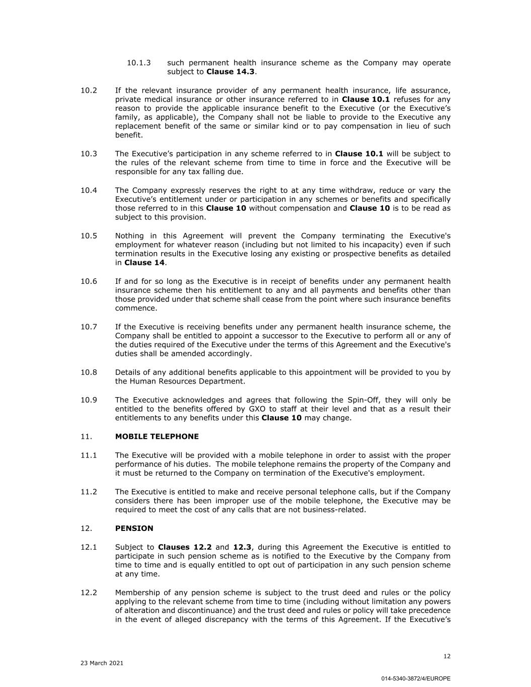 12 23 March 2021 014-5340-3872/4/EUROPE 10.1.3 such permanent health insurance scheme as the Company may operate subject to Clause 14.3. 10.2 If the relevant insurance provider of any permanent health insurance, life assurance, private medical insurance or other insurance referred to in Clause 10.1 refuses for any reason to provide the applicable insurance benefit to the Executive (or the Executive’s family, as applicable), the Company shall not be liable to provide to the Executive any replacement benefit of the same or similar kind or to pay compensation in lieu of such benefit. 10.3 The Executive’s participation in any scheme referred to in Clause 10.1 will be subject to the rules of the relevant scheme from time to time in force and the Executive will be responsible for any tax falling due. 10.4 The Company expressly reserves the right to at any time withdraw, reduce or vary the Executive’s entitlement under or participation in any schemes or benefits and specifically those referred to in this Clause 10 without compensation and Clause 10 is to be read as subject to this provision. 10.5 Nothing in this Agreement will prevent the Company terminating the Executive's employment for whatever reason (including but not limited to his incapacity) even if such termination results in the Executive losing any existing or prospective benefits as detailed in Clause 14. 10.6 If and for so long as the Executive is in receipt of benefits under any permanent health insurance scheme then his entitlement to any and all payments and benefits other than those provided under that scheme shall cease from the point where such insurance benefits commence. 10.7 If the Executive is receiving benefits under any permanent health insurance scheme, the Company shall be entitled to appoint a successor to the Executive to perform all or any of the duties required of the Executive under the terms of this Agreement and the Executive's duties shall be amended accordingly. 10.8 Details of any additional benefits applicable to this appointment will be provided to you by the Human Resources Department. 10.9 The Executive acknowledges and agrees that following the Spin-Off, they will only be entitled to the benefits offered by GXO to staff at their level and that as a result their entitlements to any benefits under this Clause 10 may change. 11. MOBILE TELEPHONE 11.1 The Executive will be provided with a mobile telephone in order to assist with the proper performance of his duties. The mobile telephone remains the property of the Company and it must be returned to the Company on termination of the Executive's employment. 11.2 The Executive is entitled to make and receive personal telephone calls, but if the Company considers there has been improper use of the mobile telephone, the Executive may be required to meet the cost of any calls that are not business-related. 12. PENSION 12.1 Subject to Clauses 12.2 and 12.3, during this Agreement the Executive is entitled to participate in such pension scheme as is notified to the Executive by the Company from time to time and is equally entitled to opt out of participation in any such pension scheme at any time. 12.2 Membership of any pension scheme is subject to the trust deed and rules or the policy applying to the relevant scheme from time to time (including without limitation any powers of alteration and discontinuance) and the trust deed and rules or policy will take precedence in the event of alleged discrepancy with the terms of this Agreement. If the Executive’s
