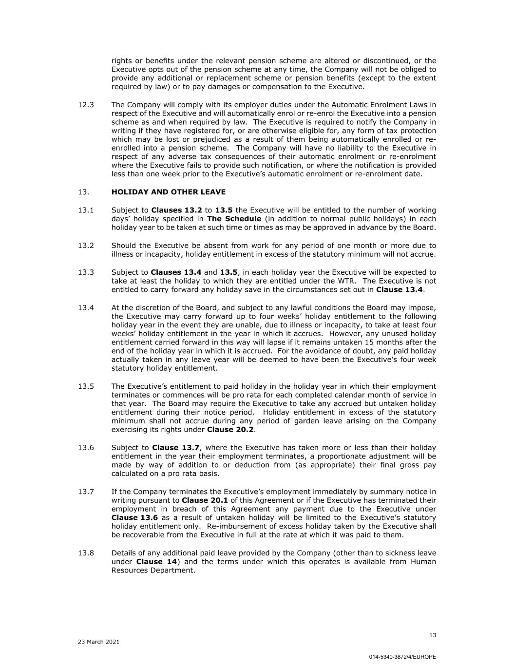 13 23 March 2021 014-5340-3872/4/EUROPE rights or benefits under the relevant pension scheme are altered or discontinued, or the Executive opts out of the pension scheme at any time, the Company will not be obliged to provide any additional or replacement scheme or pension benefits (except to the extent required by law) or to pay damages or compensation to the Executive. 12.3 The Company will comply with its employer duties under the Automatic Enrolment Laws in respect of the Executive and will automatically enrol or re-enrol the Executive into a pension scheme as and when required by law. The Executive is required to notify the Company in writing if they have registered for, or are otherwise eligible for, any form of tax protection which may be lost or prejudiced as a result of them being automatically enrolled or re- enrolled into a pension scheme. The Company will have no liability to the Executive in respect of any adverse tax consequences of their automatic enrolment or re-enrolment where the Executive fails to provide such notification, or where the notification is provided less than one week prior to the Executive’s automatic enrolment or re-enrolment date. 13. HOLIDAY AND OTHER LEAVE 13.1 Subject to Clauses 13.2 to 13.5 the Executive will be entitled to the number of working days’ holiday specified in The Schedule (in addition to normal public holidays) in each holiday year to be taken at such time or times as may be approved in advance by the Board. 13.2 Should the Executive be absent from work for any period of one month or more due to illness or incapacity, holiday entitlement in excess of the statutory minimum will not accrue. 13.3 Subject to Clauses 13.4 and 13.5, in each holiday year the Executive will be expected to take at least the holiday to which they are entitled under the WTR. The Executive is not entitled to carry forward any holiday save in the circumstances set out in Clause 13.4. 13.4 At the discretion of the Board, and subject to any lawful conditions the Board may impose, the Executive may carry forward up to four weeks’ holiday entitlement to the following holiday year in the event they are unable, due to illness or incapacity, to take at least four weeks’ holiday entitlement in the year in which it accrues. However, any unused holiday entitlement carried forward in this way will lapse if it remains untaken 15 months after the end of the holiday year in which it is accrued. For the avoidance of doubt, any paid holiday actually taken in any leave year will be deemed to have been the Executive’s four week statutory holiday entitlement. 13.5 The Executive’s entitlement to paid holiday in the holiday year in which their employment terminates or commences will be pro rata for each completed calendar month of service in that year. The Board may require the Executive to take any accrued but untaken holiday entitlement during their notice period. Holiday entitlement in excess of the statutory minimum shall not accrue during any period of garden leave arising on the Company exercising its rights under Clause 20.2. 13.6 Subject to Clause 13.7, where the Executive has taken more or less than their holiday entitlement in the year their employment terminates, a proportionate adjustment will be made by way of addition to or deduction from (as appropriate) their final gross pay calculated on a pro rata basis. 13.7 If the Company terminates the Executive’s employment immediately by summary notice in writing pursuant to Clause 20.1 of this Agreement or if the Executive has terminated their employment in breach of this Agreement any payment due to the Executive under Clause 13.6 as a result of untaken holiday will be limited to the Executive’s statutory holiday entitlement only. Re-imbursement of excess holiday taken by the Executive shall be recoverable from the Executive in full at the rate at which it was paid to them. 13.8 Details of any additional paid leave provided by the Company (other than to sickness leave under Clause 14) and the terms under which this operates is available from Human Resources Department.