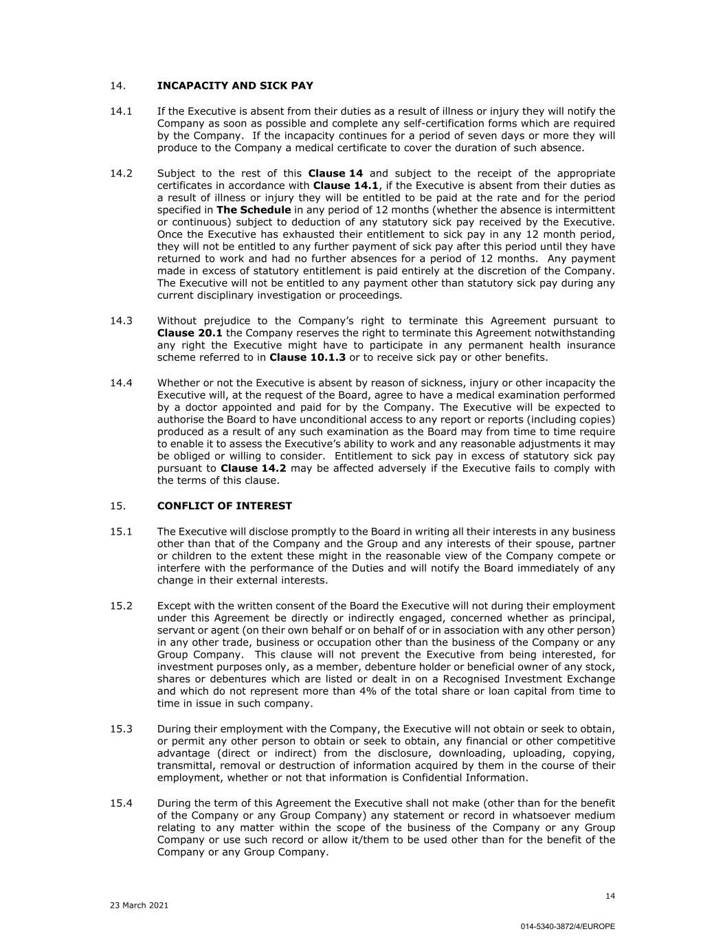 14 23 March 2021 014-5340-3872/4/EUROPE 14. INCAPACITY AND SICK PAY 14.1 If the Executive is absent from their duties as a result of illness or injury they will notify the Company as soon as possible and complete any self-certification forms which are required by the Company. If the incapacity continues for a period of seven days or more they will produce to the Company a medical certificate to cover the duration of such absence. 14.2 Subject to the rest of this Clause 14 and subject to the receipt of the appropriate certificates in accordance with Clause 14.1, if the Executive is absent from their duties as a result of illness or injury they will be entitled to be paid at the rate and for the period specified in The Schedule in any period of 12 months (whether the absence is intermittent or continuous) subject to deduction of any statutory sick pay received by the Executive. Once the Executive has exhausted their entitlement to sick pay in any 12 month period, they will not be entitled to any further payment of sick pay after this period until they have returned to work and had no further absences for a period of 12 months. Any payment made in excess of statutory entitlement is paid entirely at the discretion of the Company. The Executive will not be entitled to any payment other than statutory sick pay during any current disciplinary investigation or proceedings. 14.3 Without prejudice to the Company’s right to terminate this Agreement pursuant to Clause 20.1 the Company reserves the right to terminate this Agreement notwithstanding any right the Executive might have to participate in any permanent health insurance scheme referred to in Clause 10.1.3 or to receive sick pay or other benefits. 14.4 Whether or not the Executive is absent by reason of sickness, injury or other incapacity the Executive will, at the request of the Board, agree to have a medical examination performed by a doctor appointed and paid for by the Company. The Executive will be expected to authorise the Board to have unconditional access to any report or reports (including copies) produced as a result of any such examination as the Board may from time to time require to enable it to assess the Executive’s ability to work and any reasonable adjustments it may be obliged or willing to consider. Entitlement to sick pay in excess of statutory sick pay pursuant to Clause 14.2 may be affected adversely if the Executive fails to comply with the terms of this clause. 15. CONFLICT OF INTEREST 15.1 The Executive will disclose promptly to the Board in writing all their interests in any business other than that of the Company and the Group and any interests of their spouse, partner or children to the extent these might in the reasonable view of the Company compete or interfere with the performance of the Duties and will notify the Board immediately of any change in their external interests. 15.2 Except with the written consent of the Board the Executive will not during their employment under this Agreement be directly or indirectly engaged, concerned whether as principal, servant or agent (on their own behalf or on behalf of or in association with any other person) in any other trade, business or occupation other than the business of the Company or any Group Company. This clause will not prevent the Executive from being interested, for investment purposes only, as a member, debenture holder or beneficial owner of any stock, shares or debentures which are listed or dealt in on a Recognised Investment Exchange and which do not represent more than 4% of the total share or loan capital from time to time in issue in such company. 15.3 During their employment with the Company, the Executive will not obtain or seek to obtain, or permit any other person to obtain or seek to obtain, any financial or other competitive advantage (direct or indirect) from the disclosure, downloading, uploading, copying, transmittal, removal or destruction of information acquired by them in the course of their employment, whether or not that information is Confidential Information. 15.4 During the term of this Agreement the Executive shall not make (other than for the benefit of the Company or any Group Company) any statement or record in whatsoever medium relating to any matter within the scope of the business of the Company or any Group Company or use such record or allow it/them to be used other than for the benefit of the Company or any Group Company.
