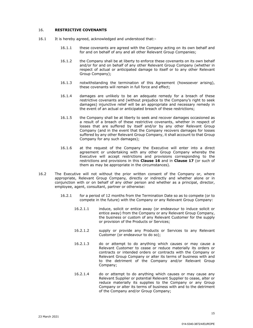 15 23 March 2021 014-5340-3872/4/EUROPE 16. RESTRICTIVE COVENANTS 16.1 It is hereby agreed, acknowledged and understood that:- 16.1.1 these covenants are agreed with the Company acting on its own behalf and for and on behalf of any and all other Relevant Group Companies; 16.1.2 the Company shall be at liberty to enforce these covenants on its own behalf and/or for and on behalf of any other Relevant Group Company (whether in respect of actual or anticipated damage to itself or to any other Relevant Group Company); 16.1.3 notwithstanding the termination of this Agreement (howsoever arising), these covenants will remain in full force and effect; 16.1.4 damages are unlikely to be an adequate remedy for a breach of these restrictive covenants and (without prejudice to the Company’s right to seek damages) injunctive relief will be an appropriate and necessary remedy in the event of an actual or anticipated breach of these restrictions; 16.1.5 the Company shall be at liberty to seek and recover damages occasioned as a result of a breach of these restrictive covenants, whether in respect of losses that are suffered by itself and/or by any other Relevant Group Company (and in the event that the Company recovers damages for losses suffered by any other Relevant Group Company, it shall account to that Group Company for any such damages); 16.1.6 at the request of the Company the Executive will enter into a direct agreement or undertaking with any other Group Company whereby the Executive will accept restrictions and provisions corresponding to the restrictions and provisions in this Clause 16 and in Clause 17 (or such of them as may be appropriate in the circumstances). 16.2 The Executive will not without the prior written consent of the Company or, where appropriate, Relevant Group Company, directly or indirectly and whether alone or in conjunction with or on behalf of any other person and whether as a principal, director, employee, agent, consultant, partner or otherwise: 16.2.1 for a period of 12 months from the Termination Date so as to compete (or to compete in the future) with the Company or any Relevant Group Company: 16.2.1.1 induce, solicit or entice away (or endeavour to induce solicit or entice away) from the Company or any Relevant Group Company, the business or custom of any Relevant Customer for the supply or provision of the Products or Services; 16.2.1.2 supply or provide any Products or Services to any Relevant Customer (or endeavour to do so); 16.2.1.3 do or attempt to do anything which causes or may cause a Relevant Customer to cease or reduce materially its orders or contracts or intended orders or contracts with the Company or Relevant Group Company or alter its terms of business with and to the detriment of the Company and/or Relevant Group Company; 16.2.1.4 do or attempt to do anything which causes or may cause any Relevant Supplier or potential Relevant Supplier to cease, alter or reduce materially its supplies to the Company or any Group Company or alter its terms of business with and to the detriment of the Company and/or Group Company;