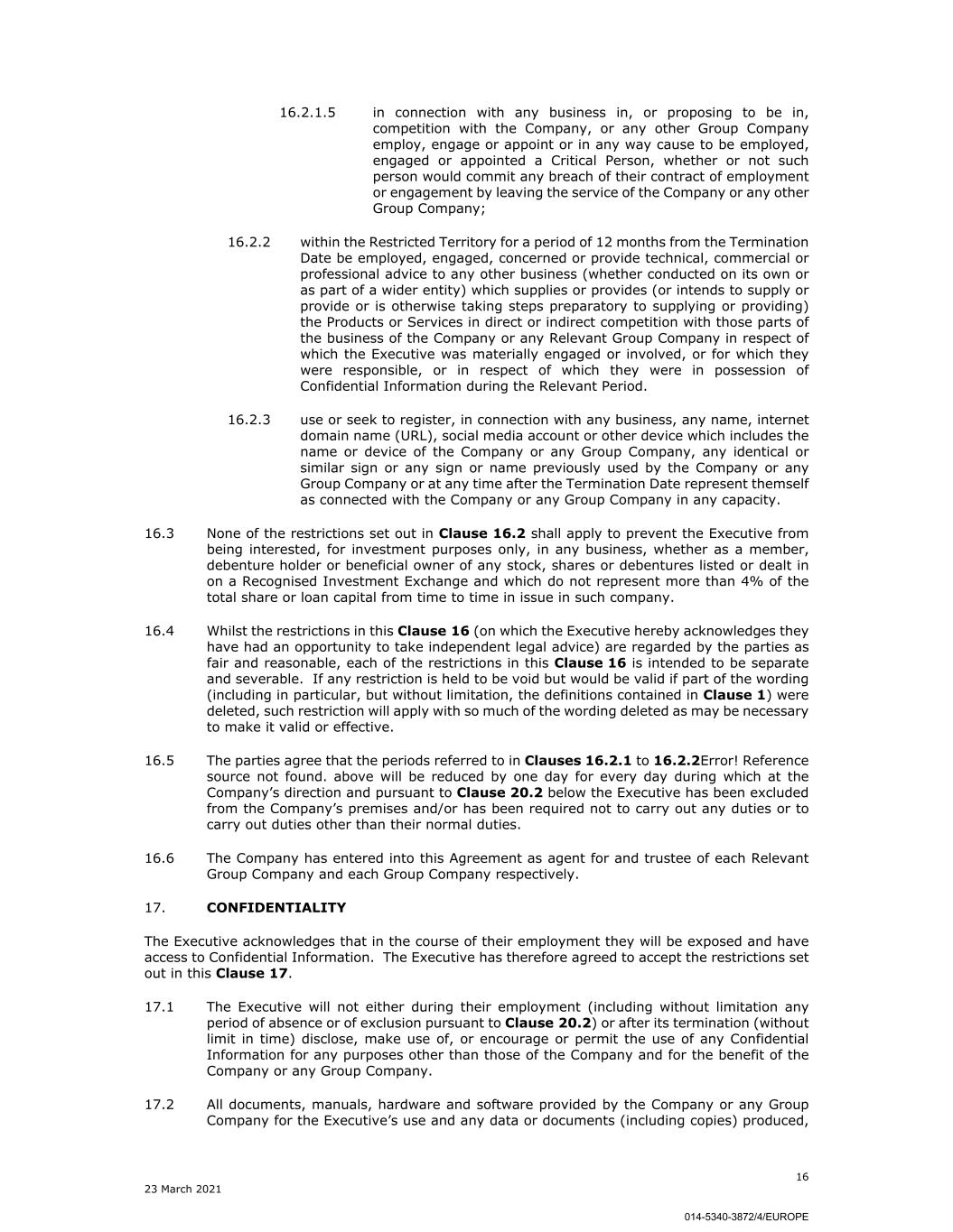 16 23 March 2021 014-5340-3872/4/EUROPE 16.2.1.5 in connection with any business in, or proposing to be in, competition with the Company, or any other Group Company employ, engage or appoint or in any way cause to be employed, engaged or appointed a Critical Person, whether or not such person would commit any breach of their contract of employment or engagement by leaving the service of the Company or any other Group Company; 16.2.2 within the Restricted Territory for a period of 12 months from the Termination Date be employed, engaged, concerned or provide technical, commercial or professional advice to any other business (whether conducted on its own or as part of a wider entity) which supplies or provides (or intends to supply or provide or is otherwise taking steps preparatory to supplying or providing) the Products or Services in direct or indirect competition with those parts of the business of the Company or any Relevant Group Company in respect of which the Executive was materially engaged or involved, or for which they were responsible, or in respect of which they were in possession of Confidential Information during the Relevant Period. 16.2.3 use or seek to register, in connection with any business, any name, internet domain name (URL), social media account or other device which includes the name or device of the Company or any Group Company, any identical or similar sign or any sign or name previously used by the Company or any Group Company or at any time after the Termination Date represent themself as connected with the Company or any Group Company in any capacity. 16.3 None of the restrictions set out in Clause 16.2 shall apply to prevent the Executive from being interested, for investment purposes only, in any business, whether as a member, debenture holder or beneficial owner of any stock, shares or debentures listed or dealt in on a Recognised Investment Exchange and which do not represent more than 4% of the total share or loan capital from time to time in issue in such company. 16.4 Whilst the restrictions in this Clause 16 (on which the Executive hereby acknowledges they have had an opportunity to take independent legal advice) are regarded by the parties as fair and reasonable, each of the restrictions in this Clause 16 is intended to be separate and severable. If any restriction is held to be void but would be valid if part of the wording (including in particular, but without limitation, the definitions contained in Clause 1) were deleted, such restriction will apply with so much of the wording deleted as may be necessary to make it valid or effective. 16.5 The parties agree that the periods referred to in Clauses 16.2.1 to 16.2.2Error! Reference source not found. above will be reduced by one day for every day during which at the Company’s direction and pursuant to Clause 20.2 below the Executive has been excluded from the Company’s premises and/or has been required not to carry out any duties or to carry out duties other than their normal duties. 16.6 The Company has entered into this Agreement as agent for and trustee of each Relevant Group Company and each Group Company respectively. 17. CONFIDENTIALITY The Executive acknowledges that in the course of their employment they will be exposed and have access to Confidential Information. The Executive has therefore agreed to accept the restrictions set out in this Clause 17. 17.1 The Executive will not either during their employment (including without limitation any period of absence or of exclusion pursuant to Clause 20.2) or after its termination (without limit in time) disclose, make use of, or encourage or permit the use of any Confidential Information for any purposes other than those of the Company and for the benefit of the Company or any Group Company. 17.2 All documents, manuals, hardware and software provided by the Company or any Group Company for the Executive’s use and any data or documents (including copies) produced,