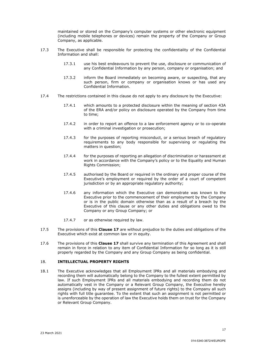 17 23 March 2021 014-5340-3872/4/EUROPE maintained or stored on the Company’s computer systems or other electronic equipment (including mobile telephones or devices) remain the property of the Company or Group Company, as applicable. 17.3 The Executive shall be responsible for protecting the confidentiality of the Confidential Information and shall: 17.3.1 use his best endeavours to prevent the use, disclosure or communication of any Confidential Information by any person, company or organisation; and 17.3.2 inform the Board immediately on becoming aware, or suspecting, that any such person, firm or company or organisation knows or has used any Confidential Information. 17.4 The restrictions contained in this clause do not apply to any disclosure by the Executive: 17.4.1 which amounts to a protected disclosure within the meaning of section 43A of the ERA and/or policy on disclosure operated by the Company from time to time; 17.4.2 in order to report an offence to a law enforcement agency or to co-operate with a criminal investigation or prosecution; 17.4.3 for the purposes of reporting misconduct, or a serious breach of regulatory requirements to any body responsible for supervising or regulating the matters in question; 17.4.4 for the purposes of reporting an allegation of discrimination or harassment at work in accordance with the Company’s policy or to the Equality and Human Rights Commission; 17.4.5 authorised by the Board or required in the ordinary and proper course of the Executive’s employment or required by the order of a court of competent jurisdiction or by an appropriate regulatory authority; 17.4.6 any information which the Executive can demonstrate was known to the Executive prior to the commencement of their employment by the Company or is in the public domain otherwise than as a result of a breach by the Executive of this clause or any other duties and obligations owed to the Company or any Group Company; or 17.4.7 or as otherwise required by law. 17.5 The provisions of this Clause 17 are without prejudice to the duties and obligations of the Executive which exist at common law or in equity. 17.6 The provisions of this Clause 17 shall survive any termination of this Agreement and shall remain in force in relation to any item of Confidential Information for so long as it is still properly regarded by the Company and any Group Company as being confidential. 18. INTELLECTUAL PROPERTY RIGHTS 18.1 The Executive acknowledges that all Employment IPRs and all materials embodying and recording them will automatically belong to the Company to the fullest extent permitted by law. If such Employment IPRs and all materials embodying and recording them do not automatically vest in the Company or a Relevant Group Company, the Executive hereby assigns (including by way of present assignment of future rights) to the Company all such rights with full title guarantee. To the extent that such an assignment is not permitted or is unenforceable by the operation of law the Executive holds them on trust for the Company or Relevant Group Company.