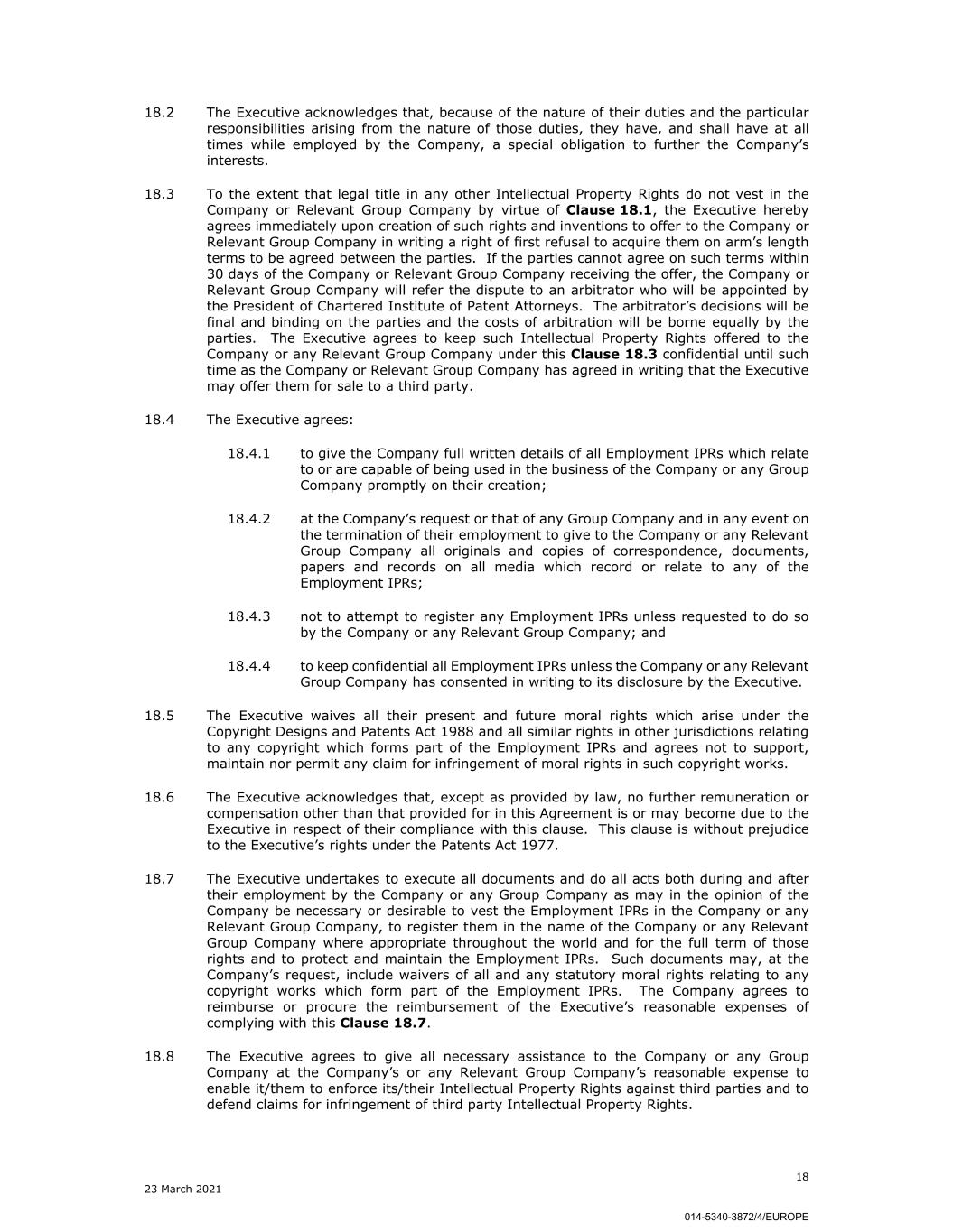 18 23 March 2021 014-5340-3872/4/EUROPE 18.2 The Executive acknowledges that, because of the nature of their duties and the particular responsibilities arising from the nature of those duties, they have, and shall have at all times while employed by the Company, a special obligation to further the Company’s interests. 18.3 To the extent that legal title in any other Intellectual Property Rights do not vest in the Company or Relevant Group Company by virtue of Clause 18.1, the Executive hereby agrees immediately upon creation of such rights and inventions to offer to the Company or Relevant Group Company in writing a right of first refusal to acquire them on arm’s length terms to be agreed between the parties. If the parties cannot agree on such terms within 30 days of the Company or Relevant Group Company receiving the offer, the Company or Relevant Group Company will refer the dispute to an arbitrator who will be appointed by the President of Chartered Institute of Patent Attorneys. The arbitrator’s decisions will be final and binding on the parties and the costs of arbitration will be borne equally by the parties. The Executive agrees to keep such Intellectual Property Rights offered to the Company or any Relevant Group Company under this Clause 18.3 confidential until such time as the Company or Relevant Group Company has agreed in writing that the Executive may offer them for sale to a third party. 18.4 The Executive agrees: 18.4.1 to give the Company full written details of all Employment IPRs which relate to or are capable of being used in the business of the Company or any Group Company promptly on their creation; 18.4.2 at the Company’s request or that of any Group Company and in any event on the termination of their employment to give to the Company or any Relevant Group Company all originals and copies of correspondence, documents, papers and records on all media which record or relate to any of the Employment IPRs; 18.4.3 not to attempt to register any Employment IPRs unless requested to do so by the Company or any Relevant Group Company; and 18.4.4 to keep confidential all Employment IPRs unless the Company or any Relevant Group Company has consented in writing to its disclosure by the Executive. 18.5 The Executive waives all their present and future moral rights which arise under the Copyright Designs and Patents Act 1988 and all similar rights in other jurisdictions relating to any copyright which forms part of the Employment IPRs and agrees not to support, maintain nor permit any claim for infringement of moral rights in such copyright works. 18.6 The Executive acknowledges that, except as provided by law, no further remuneration or compensation other than that provided for in this Agreement is or may become due to the Executive in respect of their compliance with this clause. This clause is without prejudice to the Executive’s rights under the Patents Act 1977. 18.7 The Executive undertakes to execute all documents and do all acts both during and after their employment by the Company or any Group Company as may in the opinion of the Company be necessary or desirable to vest the Employment IPRs in the Company or any Relevant Group Company, to register them in the name of the Company or any Relevant Group Company where appropriate throughout the world and for the full term of those rights and to protect and maintain the Employment IPRs. Such documents may, at the Company’s request, include waivers of all and any statutory moral rights relating to any copyright works which form part of the Employment IPRs. The Company agrees to reimburse or procure the reimbursement of the Executive’s reasonable expenses of complying with this Clause 18.7. 18.8 The Executive agrees to give all necessary assistance to the Company or any Group Company at the Company’s or any Relevant Group Company’s reasonable expense to enable it/them to enforce its/their Intellectual Property Rights against third parties and to defend claims for infringement of third party Intellectual Property Rights.
