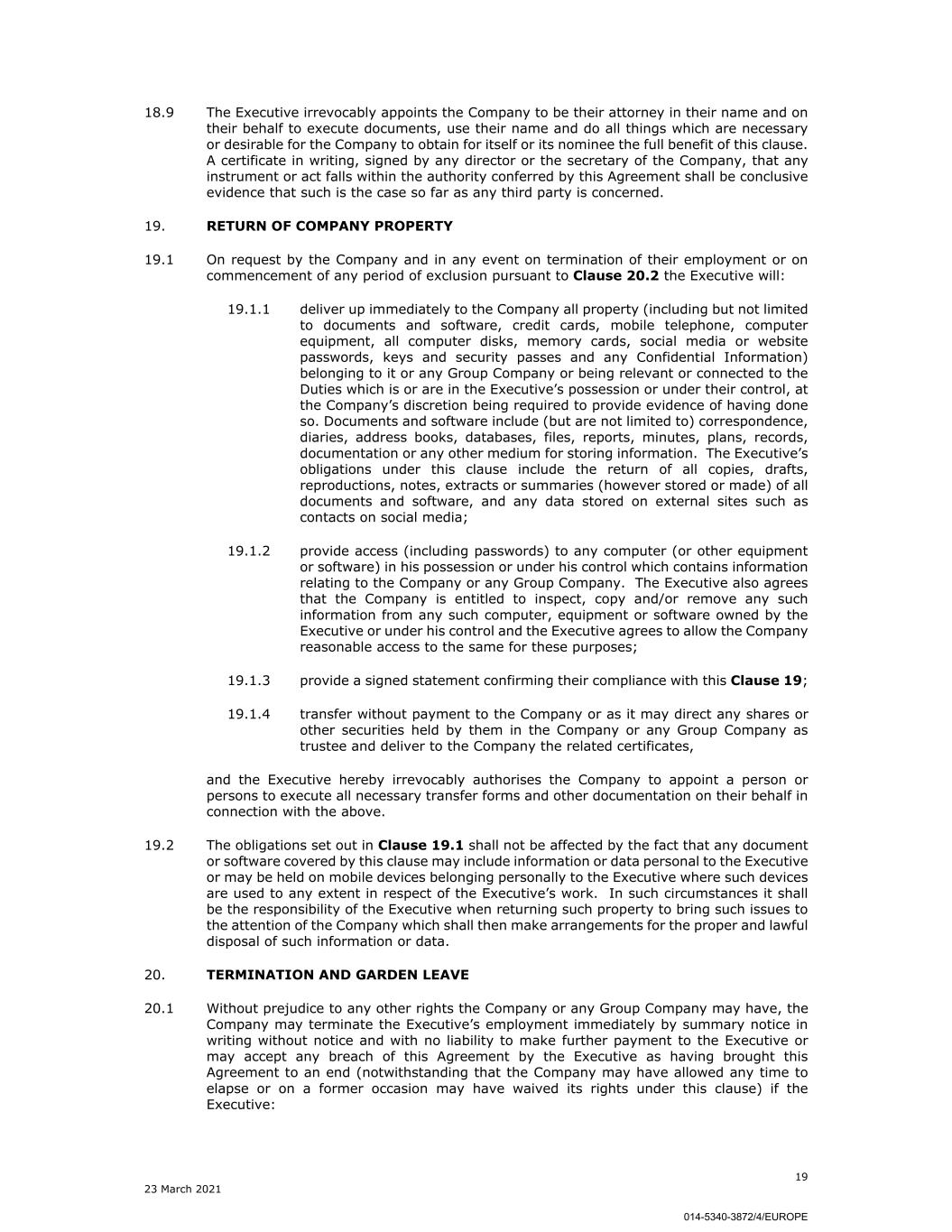 19 23 March 2021 014-5340-3872/4/EUROPE 18.9 The Executive irrevocably appoints the Company to be their attorney in their name and on their behalf to execute documents, use their name and do all things which are necessary or desirable for the Company to obtain for itself or its nominee the full benefit of this clause. A certificate in writing, signed by any director or the secretary of the Company, that any instrument or act falls within the authority conferred by this Agreement shall be conclusive evidence that such is the case so far as any third party is concerned. 19. RETURN OF COMPANY PROPERTY 19.1 On request by the Company and in any event on termination of their employment or on commencement of any period of exclusion pursuant to Clause 20.2 the Executive will: 19.1.1 deliver up immediately to the Company all property (including but not limited to documents and software, credit cards, mobile telephone, computer equipment, all computer disks, memory cards, social media or website passwords, keys and security passes and any Confidential Information) belonging to it or any Group Company or being relevant or connected to the Duties which is or are in the Executive’s possession or under their control, at the Company’s discretion being required to provide evidence of having done so. Documents and software include (but are not limited to) correspondence, diaries, address books, databases, files, reports, minutes, plans, records, documentation or any other medium for storing information. The Executive’s obligations under this clause include the return of all copies, drafts, reproductions, notes, extracts or summaries (however stored or made) of all documents and software, and any data stored on external sites such as contacts on social media; 19.1.2 provide access (including passwords) to any computer (or other equipment or software) in his possession or under his control which contains information relating to the Company or any Group Company. The Executive also agrees that the Company is entitled to inspect, copy and/or remove any such information from any such computer, equipment or software owned by the Executive or under his control and the Executive agrees to allow the Company reasonable access to the same for these purposes; 19.1.3 provide a signed statement confirming their compliance with this Clause 19; 19.1.4 transfer without payment to the Company or as it may direct any shares or other securities held by them in the Company or any Group Company as trustee and deliver to the Company the related certificates, and the Executive hereby irrevocably authorises the Company to appoint a person or persons to execute all necessary transfer forms and other documentation on their behalf in connection with the above. 19.2 The obligations set out in Clause 19.1 shall not be affected by the fact that any document or software covered by this clause may include information or data personal to the Executive or may be held on mobile devices belonging personally to the Executive where such devices are used to any extent in respect of the Executive’s work. In such circumstances it shall be the responsibility of the Executive when returning such property to bring such issues to the attention of the Company which shall then make arrangements for the proper and lawful disposal of such information or data. 20. TERMINATION AND GARDEN LEAVE 20.1 Without prejudice to any other rights the Company or any Group Company may have, the Company may terminate the Executive’s employment immediately by summary notice in writing without notice and with no liability to make further payment to the Executive or may accept any breach of this Agreement by the Executive as having brought this Agreement to an end (notwithstanding that the Company may have allowed any time to elapse or on a former occasion may have waived its rights under this clause) if the Executive: