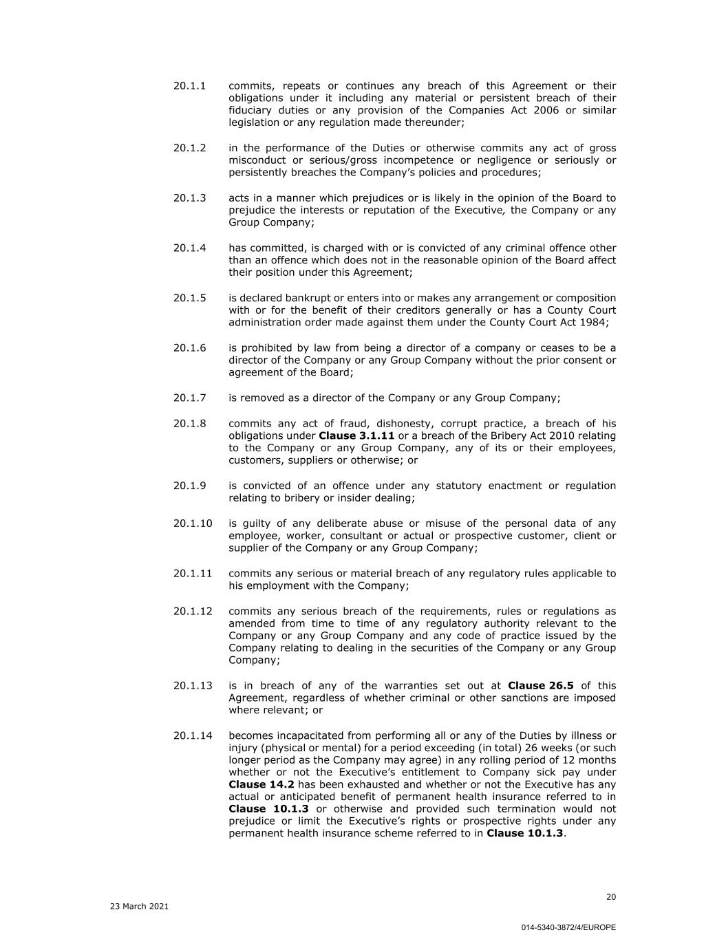 20 23 March 2021 014-5340-3872/4/EUROPE 20.1.1 commits, repeats or continues any breach of this Agreement or their obligations under it including any material or persistent breach of their fiduciary duties or any provision of the Companies Act 2006 or similar legislation or any regulation made thereunder; 20.1.2 in the performance of the Duties or otherwise commits any act of gross misconduct or serious/gross incompetence or negligence or seriously or persistently breaches the Company’s policies and procedures; 20.1.3 acts in a manner which prejudices or is likely in the opinion of the Board to prejudice the interests or reputation of the Executive, the Company or any Group Company; 20.1.4 has committed, is charged with or is convicted of any criminal offence other than an offence which does not in the reasonable opinion of the Board affect their position under this Agreement; 20.1.5 is declared bankrupt or enters into or makes any arrangement or composition with or for the benefit of their creditors generally or has a County Court administration order made against them under the County Court Act 1984; 20.1.6 is prohibited by law from being a director of a company or ceases to be a director of the Company or any Group Company without the prior consent or agreement of the Board; 20.1.7 is removed as a director of the Company or any Group Company; 20.1.8 commits any act of fraud, dishonesty, corrupt practice, a breach of his obligations under Clause 3.1.11 or a breach of the Bribery Act 2010 relating to the Company or any Group Company, any of its or their employees, customers, suppliers or otherwise; or 20.1.9 is convicted of an offence under any statutory enactment or regulation relating to bribery or insider dealing; 20.1.10 is guilty of any deliberate abuse or misuse of the personal data of any employee, worker, consultant or actual or prospective customer, client or supplier of the Company or any Group Company; 20.1.11 commits any serious or material breach of any regulatory rules applicable to his employment with the Company; 20.1.12 commits any serious breach of the requirements, rules or regulations as amended from time to time of any regulatory authority relevant to the Company or any Group Company and any code of practice issued by the Company relating to dealing in the securities of the Company or any Group Company; 20.1.13 is in breach of any of the warranties set out at Clause 26.5 of this Agreement, regardless of whether criminal or other sanctions are imposed where relevant; or 20.1.14 becomes incapacitated from performing all or any of the Duties by illness or injury (physical or mental) for a period exceeding (in total) 26 weeks (or such longer period as the Company may agree) in any rolling period of 12 months whether or not the Executive’s entitlement to Company sick pay under Clause 14.2 has been exhausted and whether or not the Executive has any actual or anticipated benefit of permanent health insurance referred to in Clause 10.1.3 or otherwise and provided such termination would not prejudice or limit the Executive’s rights or prospective rights under any permanent health insurance scheme referred to in Clause 10.1.3.