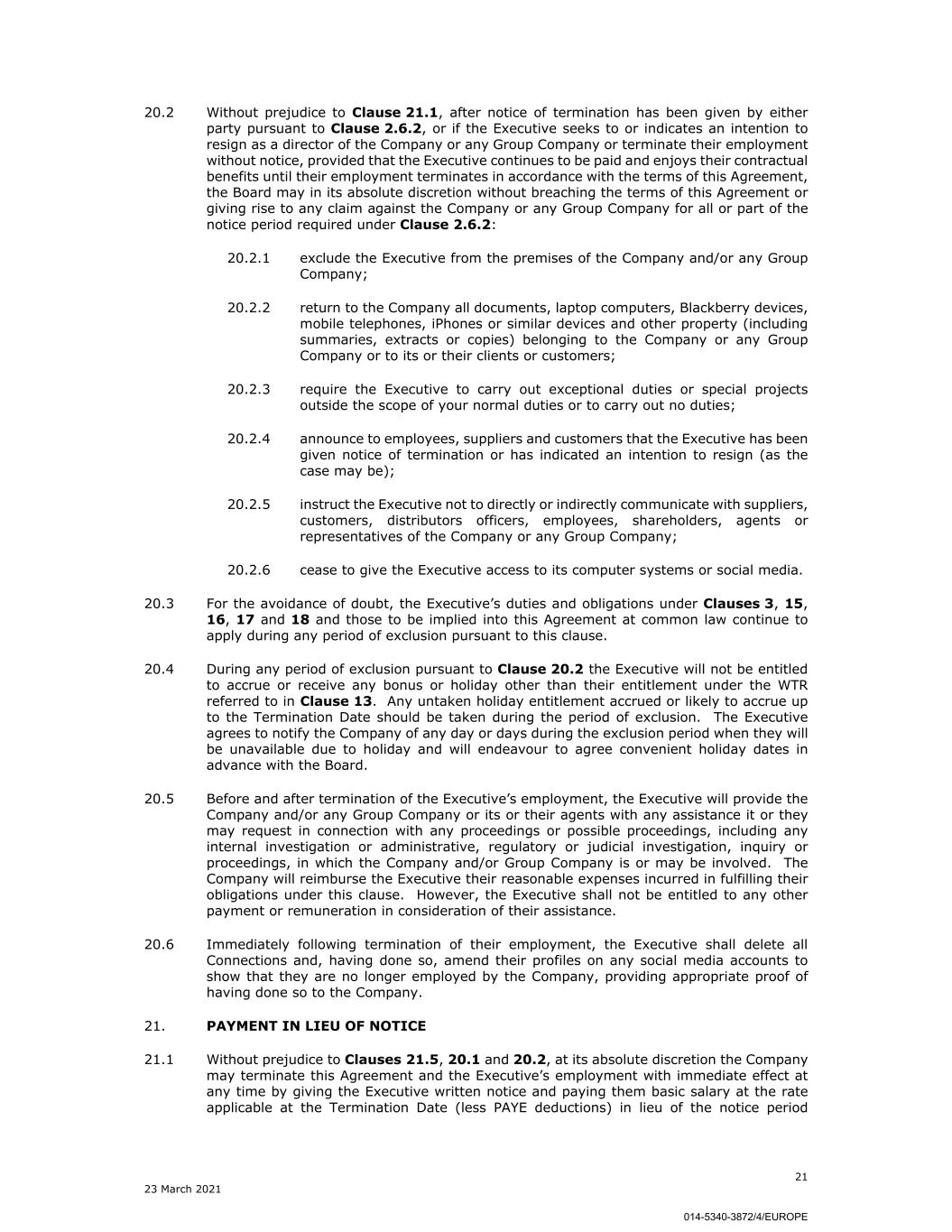 21 23 March 2021 014-5340-3872/4/EUROPE 20.2 Without prejudice to Clause 21.1, after notice of termination has been given by either party pursuant to Clause 2.6.2, or if the Executive seeks to or indicates an intention to resign as a director of the Company or any Group Company or terminate their employment without notice, provided that the Executive continues to be paid and enjoys their contractual benefits until their employment terminates in accordance with the terms of this Agreement, the Board may in its absolute discretion without breaching the terms of this Agreement or giving rise to any claim against the Company or any Group Company for all or part of the notice period required under Clause 2.6.2: 20.2.1 exclude the Executive from the premises of the Company and/or any Group Company; 20.2.2 return to the Company all documents, laptop computers, Blackberry devices, mobile telephones, iPhones or similar devices and other property (including summaries, extracts or copies) belonging to the Company or any Group Company or to its or their clients or customers; 20.2.3 require the Executive to carry out exceptional duties or special projects outside the scope of your normal duties or to carry out no duties; 20.2.4 announce to employees, suppliers and customers that the Executive has been given notice of termination or has indicated an intention to resign (as the case may be); 20.2.5 instruct the Executive not to directly or indirectly communicate with suppliers, customers, distributors officers, employees, shareholders, agents or representatives of the Company or any Group Company; 20.2.6 cease to give the Executive access to its computer systems or social media. 20.3 For the avoidance of doubt, the Executive’s duties and obligations under Clauses 3, 15, 16, 17 and 18 and those to be implied into this Agreement at common law continue to apply during any period of exclusion pursuant to this clause. 20.4 During any period of exclusion pursuant to Clause 20.2 the Executive will not be entitled to accrue or receive any bonus or holiday other than their entitlement under the WTR referred to in Clause 13. Any untaken holiday entitlement accrued or likely to accrue up to the Termination Date should be taken during the period of exclusion. The Executive agrees to notify the Company of any day or days during the exclusion period when they will be unavailable due to holiday and will endeavour to agree convenient holiday dates in advance with the Board. 20.5 Before and after termination of the Executive’s employment, the Executive will provide the Company and/or any Group Company or its or their agents with any assistance it or they may request in connection with any proceedings or possible proceedings, including any internal investigation or administrative, regulatory or judicial investigation, inquiry or proceedings, in which the Company and/or Group Company is or may be involved. The Company will reimburse the Executive their reasonable expenses incurred in fulfilling their obligations under this clause. However, the Executive shall not be entitled to any other payment or remuneration in consideration of their assistance. 20.6 Immediately following termination of their employment, the Executive shall delete all Connections and, having done so, amend their profiles on any social media accounts to show that they are no longer employed by the Company, providing appropriate proof of having done so to the Company. 21. PAYMENT IN LIEU OF NOTICE 21.1 Without prejudice to Clauses 21.5, 20.1 and 20.2, at its absolute discretion the Company may terminate this Agreement and the Executive’s employment with immediate effect at any time by giving the Executive written notice and paying them basic salary at the rate applicable at the Termination Date (less PAYE deductions) in lieu of the notice period