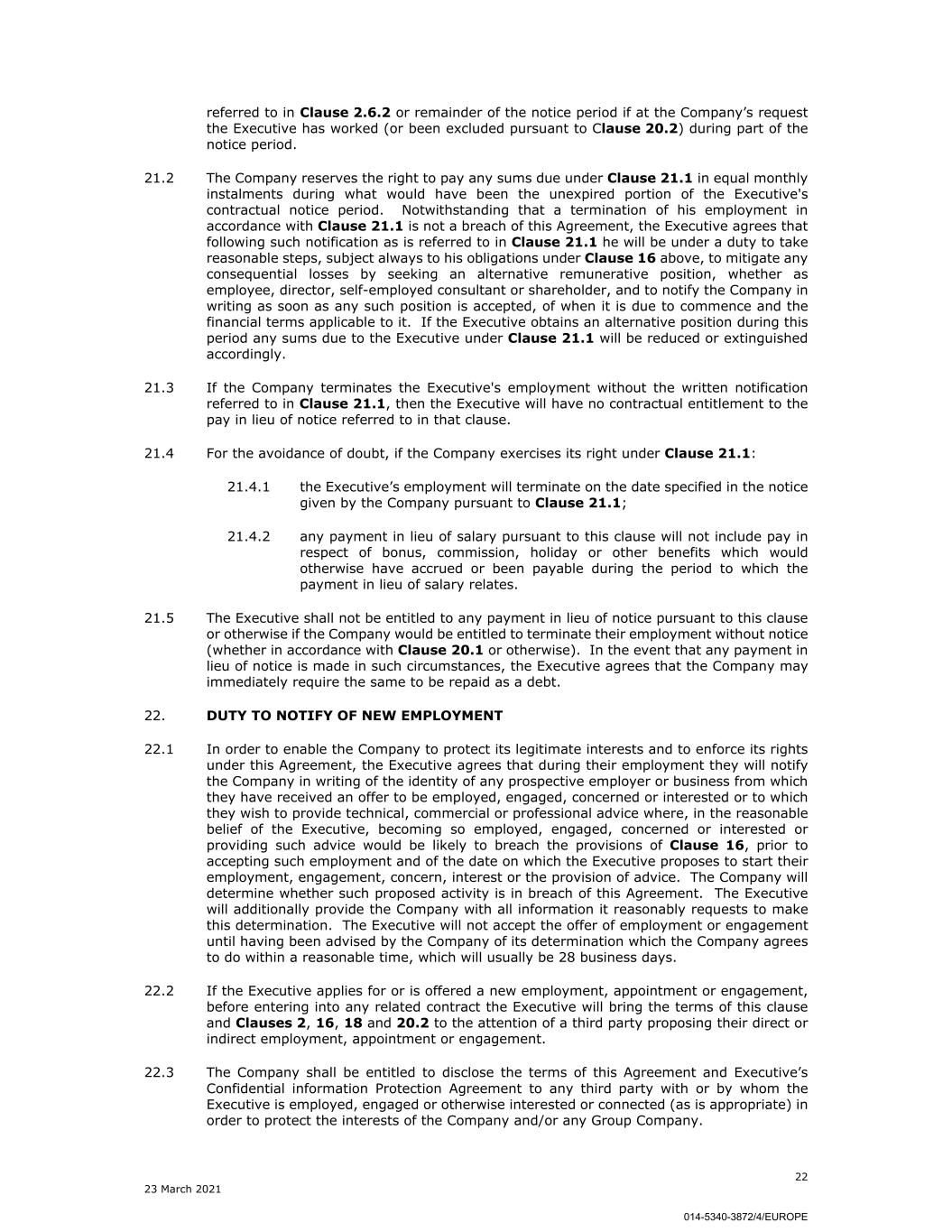 22 23 March 2021 014-5340-3872/4/EUROPE referred to in Clause 2.6.2 or remainder of the notice period if at the Company’s request the Executive has worked (or been excluded pursuant to Clause 20.2) during part of the notice period. 21.2 The Company reserves the right to pay any sums due under Clause 21.1 in equal monthly instalments during what would have been the unexpired portion of the Executive's contractual notice period. Notwithstanding that a termination of his employment in accordance with Clause 21.1 is not a breach of this Agreement, the Executive agrees that following such notification as is referred to in Clause 21.1 he will be under a duty to take reasonable steps, subject always to his obligations under Clause 16 above, to mitigate any consequential losses by seeking an alternative remunerative position, whether as employee, director, self-employed consultant or shareholder, and to notify the Company in writing as soon as any such position is accepted, of when it is due to commence and the financial terms applicable to it. If the Executive obtains an alternative position during this period any sums due to the Executive under Clause 21.1 will be reduced or extinguished accordingly. 21.3 If the Company terminates the Executive's employment without the written notification referred to in Clause 21.1, then the Executive will have no contractual entitlement to the pay in lieu of notice referred to in that clause. 21.4 For the avoidance of doubt, if the Company exercises its right under Clause 21.1: 21.4.1 the Executive’s employment will terminate on the date specified in the notice given by the Company pursuant to Clause 21.1; 21.4.2 any payment in lieu of salary pursuant to this clause will not include pay in respect of bonus, commission, holiday or other benefits which would otherwise have accrued or been payable during the period to which the payment in lieu of salary relates. 21.5 The Executive shall not be entitled to any payment in lieu of notice pursuant to this clause or otherwise if the Company would be entitled to terminate their employment without notice (whether in accordance with Clause 20.1 or otherwise). In the event that any payment in lieu of notice is made in such circumstances, the Executive agrees that the Company may immediately require the same to be repaid as a debt. 22. DUTY TO NOTIFY OF NEW EMPLOYMENT 22.1 In order to enable the Company to protect its legitimate interests and to enforce its rights under this Agreement, the Executive agrees that during their employment they will notify the Company in writing of the identity of any prospective employer or business from which they have received an offer to be employed, engaged, concerned or interested or to which they wish to provide technical, commercial or professional advice where, in the reasonable belief of the Executive, becoming so employed, engaged, concerned or interested or providing such advice would be likely to breach the provisions of Clause 16, prior to accepting such employment and of the date on which the Executive proposes to start their employment, engagement, concern, interest or the provision of advice. The Company will determine whether such proposed activity is in breach of this Agreement. The Executive will additionally provide the Company with all information it reasonably requests to make this determination. The Executive will not accept the offer of employment or engagement until having been advised by the Company of its determination which the Company agrees to do within a reasonable time, which will usually be 28 business days. 22.2 If the Executive applies for or is offered a new employment, appointment or engagement, before entering into any related contract the Executive will bring the terms of this clause and Clauses 2, 16, 18 and 20.2 to the attention of a third party proposing their direct or indirect employment, appointment or engagement. 22.3 The Company shall be entitled to disclose the terms of this Agreement and Executive’s Confidential information Protection Agreement to any third party with or by whom the Executive is employed, engaged or otherwise interested or connected (as is appropriate) in order to protect the interests of the Company and/or any Group Company.