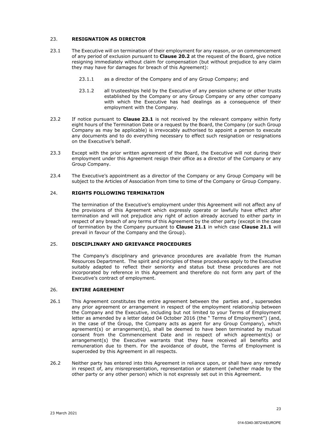 23 23 March 2021 014-5340-3872/4/EUROPE 23. RESIGNATION AS DIRECTOR 23.1 The Executive will on termination of their employment for any reason, or on commencement of any period of exclusion pursuant to Clause 20.2 at the request of the Board, give notice resigning immediately without claim for compensation (but without prejudice to any claim they may have for damages for breach of this Agreement): 23.1.1 as a director of the Company and of any Group Company; and 23.1.2 all trusteeships held by the Executive of any pension scheme or other trusts established by the Company or any Group Company or any other company with which the Executive has had dealings as a consequence of their employment with the Company. 23.2 If notice pursuant to Clause 23.1 is not received by the relevant company within forty eight hours of the Termination Date or a request by the Board, the Company (or such Group Company as may be applicable) is irrevocably authorised to appoint a person to execute any documents and to do everything necessary to effect such resignation or resignations on the Executive’s behalf. 23.3 Except with the prior written agreement of the Board, the Executive will not during their employment under this Agreement resign their office as a director of the Company or any Group Company. 23.4 The Executive’s appointment as a director of the Company or any Group Company will be subject to the Articles of Association from time to time of the Company or Group Company. 24. RIGHTS FOLLOWING TERMINATION The termination of the Executive’s employment under this Agreement will not affect any of the provisions of this Agreement which expressly operate or lawfully have effect after termination and will not prejudice any right of action already accrued to either party in respect of any breach of any terms of this Agreement by the other party (except in the case of termination by the Company pursuant to Clause 21.1 in which case Clause 21.1 will prevail in favour of the Company and the Group). 25. DISCIPLINARY AND GRIEVANCE PROCEDURES The Company’s disciplinary and grievance procedures are available from the Human Resources Department. The spirit and principles of these procedures apply to the Executive suitably adapted to reflect their seniority and status but these procedures are not incorporated by reference in this Agreement and therefore do not form any part of the Executive’s contract of employment. 26. ENTIRE AGREEMENT 26.1 This Agreement constitutes the entire agreement between the parties and , supersedes any prior agreement or arrangement in respect of the employment relationship between the Company and the Executive, including but not limited to your Terms of Employment letter as amended by a letter dated 04 October 2016 (the “ Terms of Employment”) (and, in the case of the Group, the Company acts as agent for any Group Company), which agreement(s) or arrangement(s), shall be deemed to have been terminated by mutual consent from the Commencement Date and in respect of which agreement(s) or arrangement(s) the Executive warrants that they have received all benefits and remuneration due to them. For the avoidance of doubt, the Terms of Employment is superceded by this Agreement in all respects. 26.2 Neither party has entered into this Agreement in reliance upon, or shall have any remedy in respect of, any misrepresentation, representation or statement (whether made by the other party or any other person) which is not expressly set out in this Agreement.