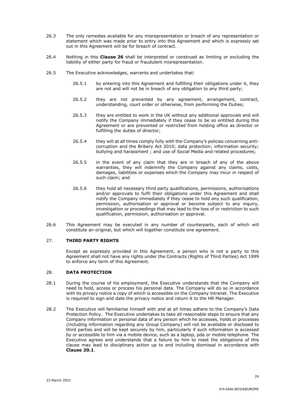 24 23 March 2021 014-5340-3872/4/EUROPE 26.3 The only remedies available for any misrepresentation or breach of any representation or statement which was made prior to entry into this Agreement and which is expressly set out in this Agreement will be for breach of contract. 26.4 Nothing in this Clause 26 shall be interpreted or construed as limiting or excluding the liability of either party for fraud or fraudulent misrepresentation. 26.5 The Executive acknowledges, warrants and undertakes that: 26.5.1 by entering into this Agreement and fulfilling their obligations under it, they are not and will not be in breach of any obligation to any third party; 26.5.2 they are not prevented by any agreement, arrangement, contract, understanding, court order or otherwise, from performing the Duties; 26.5.3 they are entitled to work in the UK without any additional approvals and will notify the Company immediately if they cease to be so entitled during this Agreement or are prevented or restricted from holding office as director or fulfilling the duties of director; 26.5.4 they will at all times comply fully with the Company’s policies concerning anti- corruption and the Bribery Act 2010; data protection; information security; bullying and harassment ; and use of Social Media and related procedures; 26.5.5 in the event of any claim that they are in breach of any of the above warranties, they will indemnify the Company against any claims, costs, damages, liabilities or expenses which the Company may incur in respect of such claim; and 26.5.6 they hold all necessary third party qualifications, permissions, authorisations and/or approvals to fulfil their obligations under this Agreement and shall notify the Company immediately if they cease to hold any such qualification, permission, authorisation or approval or become subject to any inquiry, investigation or proceedings that may lead to the loss of or restriction to such qualification, permission, authorisation or approval. 26.6 This Agreement may be executed in any number of counterparts, each of which will constitute an original, but which will together constitute one agreement. 27. THIRD PARTY RIGHTS Except as expressly provided in this Agreement, a person who is not a party to this Agreement shall not have any rights under the Contracts (Rights of Third Parties) Act 1999 to enforce any term of this Agreement. 28. DATA PROTECTION 28.1 During the course of his employment, the Executive understands that the Company will need to hold, access or process his personal data. The Company will do so in accordance with its privacy notice a copy of which is accessible on the Company intranet. The Executive is required to sign and date the privacy notice and return it to the HR Manager. 28.2 The Executive will familiarise himself with and at all times adhere to the Company’s Data Protection Policy. The Executive undertakes to take all reasonable steps to ensure that any Company information or personal data of any person which he accesses, holds or processes (including information regarding any Group Company) will not be available or disclosed to third parties and will be kept securely by him, particularly if such information is accessed by or accessible to him via a mobile device, such as a laptop, pda or mobile telephone. The Executive agrees and understands that a failure by him to meet the obligations of this clause may lead to disciplinary action up to and including dismissal in accordance with Clause 20.1.