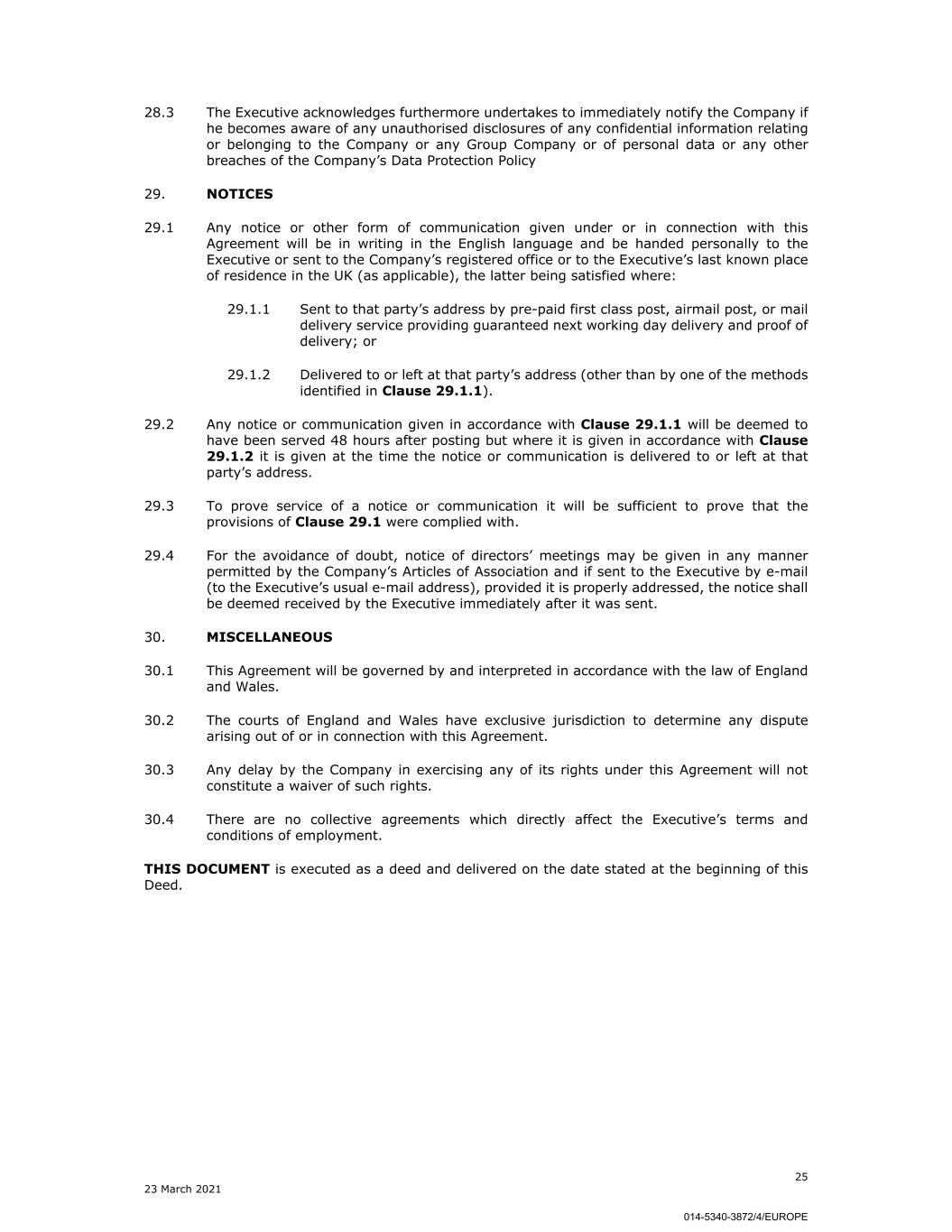 25 23 March 2021 014-5340-3872/4/EUROPE 28.3 The Executive acknowledges furthermore undertakes to immediately notify the Company if he becomes aware of any unauthorised disclosures of any confidential information relating or belonging to the Company or any Group Company or of personal data or any other breaches of the Company’s Data Protection Policy 29. NOTICES 29.1 Any notice or other form of communication given under or in connection with this Agreement will be in writing in the English language and be handed personally to the Executive or sent to the Company’s registered office or to the Executive’s last known place of residence in the UK (as applicable), the latter being satisfied where: 29.1.1 Sent to that party’s address by pre-paid first class post, airmail post, or mail delivery service providing guaranteed next working day delivery and proof of delivery; or 29.1.2 Delivered to or left at that party’s address (other than by one of the methods identified in Clause 29.1.1). 29.2 Any notice or communication given in accordance with Clause 29.1.1 will be deemed to have been served 48 hours after posting but where it is given in accordance with Clause 29.1.2 it is given at the time the notice or communication is delivered to or left at that party’s address. 29.3 To prove service of a notice or communication it will be sufficient to prove that the provisions of Clause 29.1 were complied with. 29.4 For the avoidance of doubt, notice of directors’ meetings may be given in any manner permitted by the Company’s Articles of Association and if sent to the Executive by e-mail (to the Executive’s usual e-mail address), provided it is properly addressed, the notice shall be deemed received by the Executive immediately after it was sent. 30. MISCELLANEOUS 30.1 This Agreement will be governed by and interpreted in accordance with the law of England and Wales. 30.2 The courts of England and Wales have exclusive jurisdiction to determine any dispute arising out of or in connection with this Agreement. 30.3 Any delay by the Company in exercising any of its rights under this Agreement will not constitute a waiver of such rights. 30.4 There are no collective agreements which directly affect the Executive’s terms and conditions of employment. THIS DOCUMENT is executed as a deed and delivered on the date stated at the beginning of this Deed.