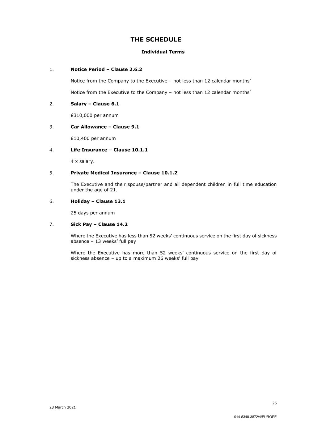 26 23 March 2021 014-5340-3872/4/EUROPE THE SCHEDULE Individual Terms 1. Notice Period – Clause 2.6.2 Notice from the Company to the Executive – not less than 12 calendar months’ Notice from the Executive to the Company – not less than 12 calendar months’ 2. Salary – Clause 6.1 £310,000 per annum 3. Car Allowance – Clause 9.1 £10,400 per annum 4. Life Insurance – Clause 10.1.1 4 x salary. 5. Private Medical Insurance – Clause 10.1.2 The Executive and their spouse/partner and all dependent children in full time education under the age of 21. 6. Holiday – Clause 13.1 25 days per annum 7. Sick Pay – Clause 14.2 Where the Executive has less than 52 weeks’ continuous service on the first day of sickness absence – 13 weeks’ full pay Where the Executive has more than 52 weeks’ continuous service on the first day of sickness absence – up to a maximum 26 weeks’ full pay
