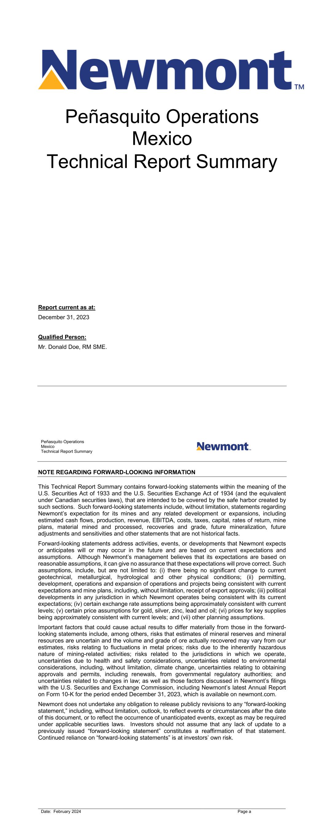 Peñasquito Operations Mexico Technical Report Summary Report current as at: December 31, 2023 Qualified Person: Mr. Donald Doe, RM SME. Peñasquito Operations Mexico Technical Report Summary Date: February 2024 Page a NOTE REGARDING FORWARD-LOOKING INFORMATION This Technical Report Summary contains forward-looking statements within the meaning of the U.S. Securities Act of 1933 and the U.S. Securities Exchange Act of 1934 (and the equivalent under Canadian securities laws), that are intended to be covered by the safe harbor created by such sections. Such forward-looking statements include, without limitation, statements regarding Newmont’s expectation for its mines and any related development or expansions, including estimated cash flows, production, revenue, EBITDA, costs, taxes, capital, rates of return, mine plans, material mined and processed, recoveries and grade, future mineralization, future adjustments and sensitivities and other statements that are not historical facts. Forward-looking statements address activities, events, or developments that Newmont expects or anticipates will or may occur in the future and are based on current expectations and assumptions. Although Newmont’s management believes that its expectations are based on reasonable assumptions, it can give no assurance that these expectations will prove correct. Such assumptions, include, but are not limited to: (i) there being no significant change to current geotechnical, metallurgical, hydrological and other physical conditions; (ii) permitting, development, operations and expansion of operations and projects being consistent with current expectations and mine plans, including, without limitation, receipt of export approvals; (iii) political developments in any jurisdiction in which Newmont operates being consistent with its current expectations; (iv) certain exchange rate assumptions being approximately consistent with current levels; (v) certain price assumptions for gold, silver, zinc, lead and oil; (vi) prices for key supplies being approximately consistent with current levels; and (vii) other planning assumptions. Important factors that could cause actual results to differ materially from those in the forward- looking statements include, among others, risks that estimates of mineral reserves and mineral resources are uncertain and the volume and grade of ore actually recovered may vary from our estimates, risks relating to fluctuations in metal prices; risks due to the inherently hazardous nature of mining-related activities; risks related to the jurisdictions in which we operate, uncertainties due to health and safety considerations, uncertainties related to environmental considerations, including, without limitation, climate change, uncertainties relating to obtaining approvals and permits, including renewals, from governmental regulatory authorities; and uncertainties related to changes in law; as well as those factors discussed in Newmont’s filings with the U.S. Securities and Exchange Commission, including Newmont’s latest Annual Report on Form 10-K for the period ended December 31, 2023, which is available on newmont.com. Newmont does not undertake any obligation to release publicly revisions to any “forward-looking statement,” including, without limitation, outlook, to reflect events or circumstances after the date of this document, or to reflect the occurrence of unanticipated events, except as may be required under applicable securities laws. Investors should not assume that any lack of update to a previously issued “forward-looking statement” constitutes a reaffirmation of that statement. Continued reliance on “forward-looking statements” is at investors’ own risk.