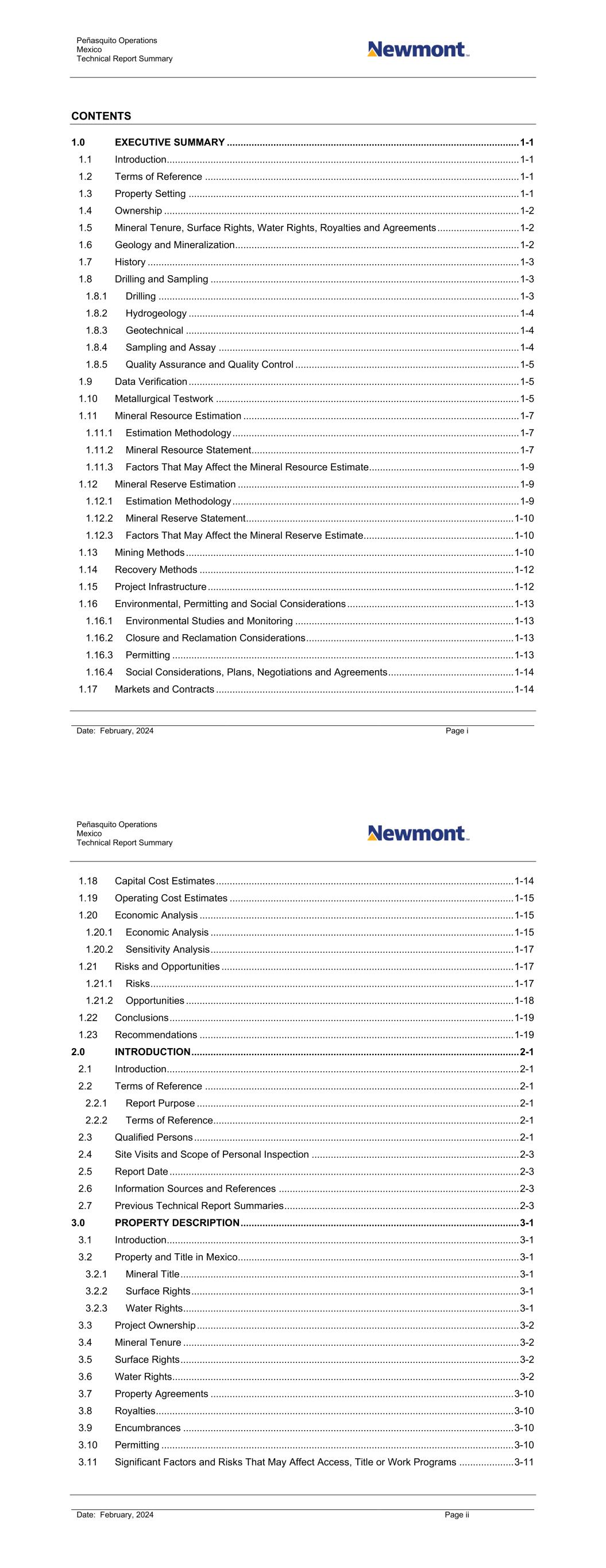 Peñasquito Operations Mexico Technical Report Summary Date: February, 2024 Page i CONTENTS 1.0 EXECUTIVE SUMMARY ........................................................................................................... 1-1 1.1 Introduction ................................................................................................................................. 1-1 1.2 Terms of Reference ................................................................................................................... 1-1 1.3 Property Setting ......................................................................................................................... 1-1 1.4 Ownership .................................................................................................................................. 1-2 1.5 Mineral Tenure, Surface Rights, Water Rights, Royalties and Agreements .............................. 1-2 1.6 Geology and Mineralization ........................................................................................................ 1-2 1.7 History ........................................................................................................................................ 1-3 1.8 Drilling and Sampling ................................................................................................................. 1-3 1.8.1 Drilling .................................................................................................................................... 1-3 1.8.2 Hydrogeology ......................................................................................................................... 1-4 1.8.3 Geotechnical .......................................................................................................................... 1-4 1.8.4 Sampling and Assay .............................................................................................................. 1-4 1.8.5 Quality Assurance and Quality Control .................................................................................. 1-5 1.9 Data Verification ......................................................................................................................... 1-5 1.10 Metallurgical Testwork ............................................................................................................... 1-5 1.11 Mineral Resource Estimation ..................................................................................................... 1-7 1.11.1 Estimation Methodology ......................................................................................................... 1-7 1.11.2 Mineral Resource Statement .................................................................................................. 1-7 1.11.3 Factors That May Affect the Mineral Resource Estimate....................................................... 1-9 1.12 Mineral Reserve Estimation ....................................................................................................... 1-9 1.12.1 Estimation Methodology ......................................................................................................... 1-9 1.12.2 Mineral Reserve Statement .................................................................................................. 1-10 1.12.3 Factors That May Affect the Mineral Reserve Estimate ....................................................... 1-10 1.13 Mining Methods ........................................................................................................................ 1-10 1.14 Recovery Methods ................................................................................................................... 1-12 1.15 Project Infrastructure ................................................................................................................ 1-12 1.16 Environmental, Permitting and Social Considerations ............................................................. 1-13 1.16.1 Environmental Studies and Monitoring ................................................................................ 1-13 1.16.2 Closure and Reclamation Considerations ............................................................................ 1-13 1.16.3 Permitting ............................................................................................................................. 1-13 1.16.4 Social Considerations, Plans, Negotiations and Agreements .............................................. 1-14 1.17 Markets and Contracts ............................................................................................................. 1-14 Peñasquito Operations Mexico Technical Report Summary Date: February, 2024 Page ii 1.18 Capital Cost Estimates ............................................................................................................. 1-14 1.19 Operating Cost Estimates ........................................................................................................ 1-15 1.20 Economic Analysis ................................................................................................................... 1-15 1.20.1 Economic Analysis ............................................................................................................... 1-15 1.20.2 Sensitivity Analysis ............................................................................................................... 1-17 1.21 Risks and Opportunities ........................................................................................................... 1-17 1.21.1 Risks ..................................................................................................................................... 1-17 1.21.2 Opportunities ........................................................................................................................ 1-18 1.22 Conclusions ............................................................................