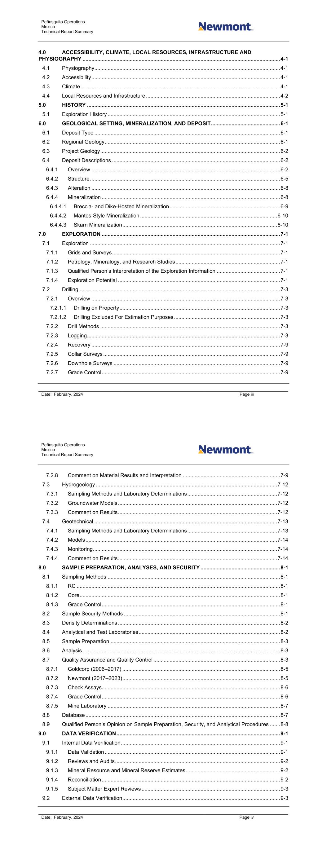 Peñasquito Operations Mexico Technical Report Summary Date: February, 2024 Page iii 4.0 ACCESSIBILITY, CLIMATE, LOCAL RESOURCES, INFRASTRUCTURE AND PHYSIOGRAPHY ...................................................................................................................................... 4-1 4.1 Physiography.............................................................................................................................. 4-1 4.2 Accessibility ................................................................................................................................ 4-1 4.3 Climate ....................................................................................................................................... 4-1 4.4 Local Resources and Infrastructure ........................................................................................... 4-2 5.0 HISTORY ................................................................................................................................... 5-1 5.1 Exploration History ..................................................................................................................... 5-1 6.0 GEOLOGICAL SETTING, MINERALIZATION, AND DEPOSIT ............................................... 6-1 6.1 Deposit Type .............................................................................................................................. 6-1 6.2 Regional Geology ....................................................................................................................... 6-1 6.3 Project Geology .......................................................................................................................... 6-2 6.4 Deposit Descriptions .................................................................................................................. 6-2 6.4.1 Overview ................................................................................................................................ 6-2 6.4.2 Structure ................................................................................................................................. 6-5 6.4.3 Alteration ................................................................................................................................ 6-8 6.4.4 Mineralization ......................................................................................................................... 6-8 6.4.4.1 Breccia- and Dike-Hosted Mineralization ........................................................................... 6-9 6.4.4.2 Mantos-Style Mineralization ............................................................................................. 6-10 6.4.4.3 Skarn Mineralization ......................................................................................................... 6-10 7.0 EXPLORATION ......................................................................................................................... 7-1 7.1 Exploration ................................................................................................................................. 7-1 7.1.1 Grids and Surveys .................................................................................................................. 7-1 7.1.2 Petrology, Mineralogy, and Research Studies ....................................................................... 7-1 7.1.3 Qualified Person’s Interpretation of the Exploration Information ........................................... 7-1 7.1.4 Exploration Potential .............................................................................................................. 7-1 7.2 Drilling ........................................................................................................................................ 7-3 7.2.1 Overview ................................................................................................................................ 7-3 7.2.1.1 Drilling on Property ............................................................................................................. 7-3 7.2.1.2 Drilling Excluded For Estimation Purposes ........................................................................ 7-3 7.2.2 Drill Methods .......................................................................................................................... 7-3 7.2.3 Logging ................................................................................................................................... 7-3 7.2.4 Recovery ................................................................................................................................ 7-9 7.2.5 Collar Surveys ........................................................................................................................ 7-9 7.2.6 Downhole Surveys ................................................................................................................. 7-9 7.2.7 Grade Control ......................................................................................................................... 7-9 Peñasquito Operations Mexico Technical Report Summary Date: February, 2024 Page iv 7.2.8 Comment on Material Results and Interpretation .................................................................. 7-9 7.3 Hydrogeology ........................................................................................................................... 7-12 7.3.1 Sampling Methods and Laboratory Determinations ............................................................. 7-12 7.3.2 Groundwater Models ............................................................................................................ 7-12 7.3.3 Comment on Results ............................................................................................................ 7-12 7.4 Geotechnical ..........................................................................................