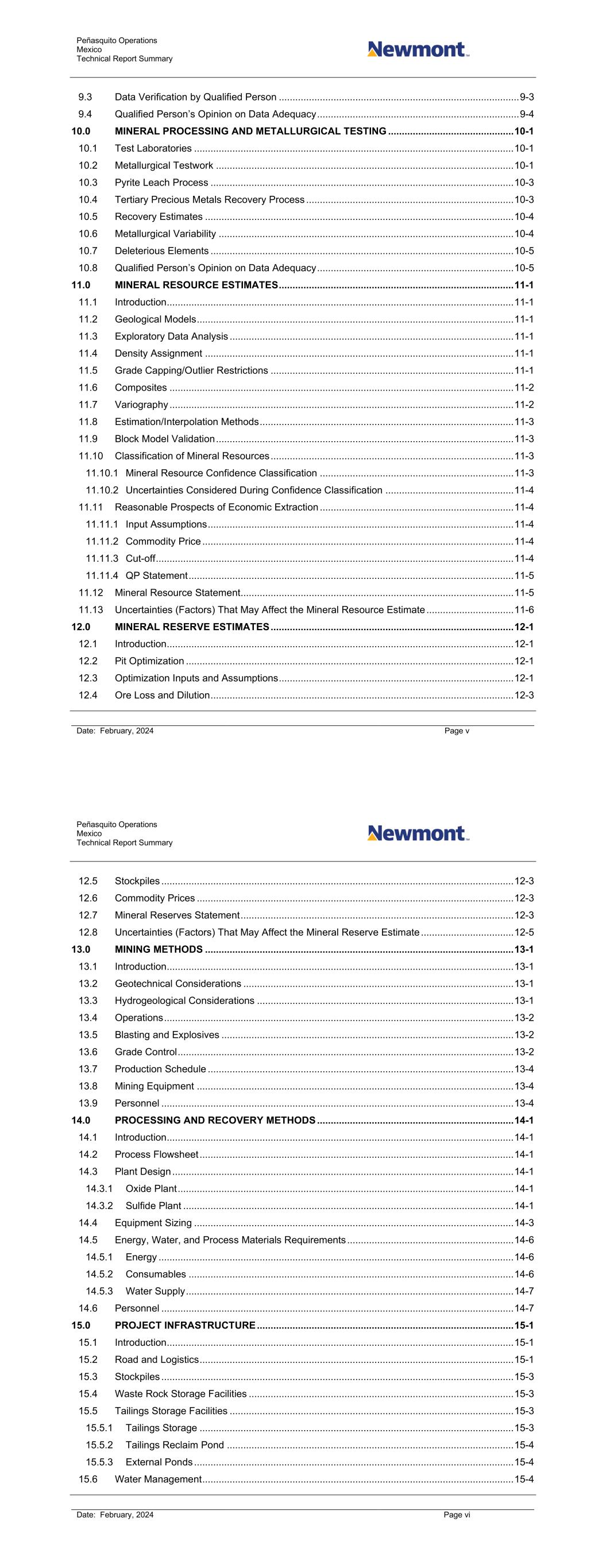 Peñasquito Operations Mexico Technical Report Summary Date: February, 2024 Page v 9.3 Data Verification by Qualified Person ........................................................................................ 9-3 9.4 Qualified Person’s Opinion on Data Adequacy .......................................................................... 9-4 10.0 MINERAL PROCESSING AND METALLURGICAL TESTING .............................................. 10-1 10.1 Test Laboratories ..................................................................................................................... 10-1 10.2 Metallurgical Testwork ............................................................................................................. 10-1 10.3 Pyrite Leach Process ............................................................................................................... 10-3 10.4 Tertiary Precious Metals Recovery Process ............................................................................ 10-3 10.5 Recovery Estimates ................................................................................................................. 10-4 10.6 Metallurgical Variability ............................................................................................................ 10-4 10.7 Deleterious Elements ............................................................................................................... 10-5 10.8 Qualified Person’s Opinion on Data Adequacy ........................................................................ 10-5 11.0 MINERAL RESOURCE ESTIMATES ...................................................................................... 11-1 11.1 Introduction ............................................................................................................................... 11-1 11.2 Geological Models .................................................................................................................... 11-1 11.3 Exploratory Data Analysis ........................................................................................................ 11-1 11.4 Density Assignment ................................................................................................................. 11-1 11.5 Grade Capping/Outlier Restrictions ......................................................................................... 11-1 11.6 Composites .............................................................................................................................. 11-2 11.7 Variography .............................................................................................................................. 11-2 11.8 Estimation/Interpolation Methods ............................................................................................. 11-3 11.9 Block Model Validation ............................................................................................................. 11-3 11.10 Classification of Mineral Resources ......................................................................................... 11-3 11.10.1 Mineral Resource Confidence Classification ....................................................................... 11-3 11.10.2 Uncertainties Considered During Confidence Classification ............................................... 11-4 11.11 Reasonable Prospects of Economic Extraction ....................................................................... 11-4 11.11.1 Input Assumptions ................................................................................................................ 11-4 11.11.2 Commodity Price .................................................................................................................. 11-4 11.11.3 Cut-off ................................................................................................................................... 11-4 11.11.4 QP Statement ....................................................................................................................... 11-5 11.12 Mineral Resource Statement.................................................................................................... 11-5 11.13 Uncertainties (Factors) That May Affect the Mineral Resource Estimate ................................ 11-6 12.0 MINERAL RESERVE ESTIMATES ......................................................................................... 12-1 12.1 Introduction ............................................................................................................................... 12-1 12.2 Pit Optimization ........................................................................................................................ 12-1 12.3 Optimization Inputs and Assumptions ...................................................................................... 12-1 12.4 Ore Loss and Dilution ............................................................................................................... 12-3 Peñasquito Operations Mexico Technical Report Summary Date: February, 2024 Page vi 12.5 Stockpiles ................................................................................................................................. 12-3 12.6 Commodity Prices .................................................................................................................... 12-3 12.7 Mineral Reserves Statement .................................................................................................... 12-3 12.8 Uncertainties (Factors) That May Affect the Mineral Reserve Estimate .................................. 12-5 13.0 MINING METHODS ................................................................................................................. 13-1 13.1 Introduction ............................................................................................................................... 13-1 13.2 Geotechnical Considerations ........