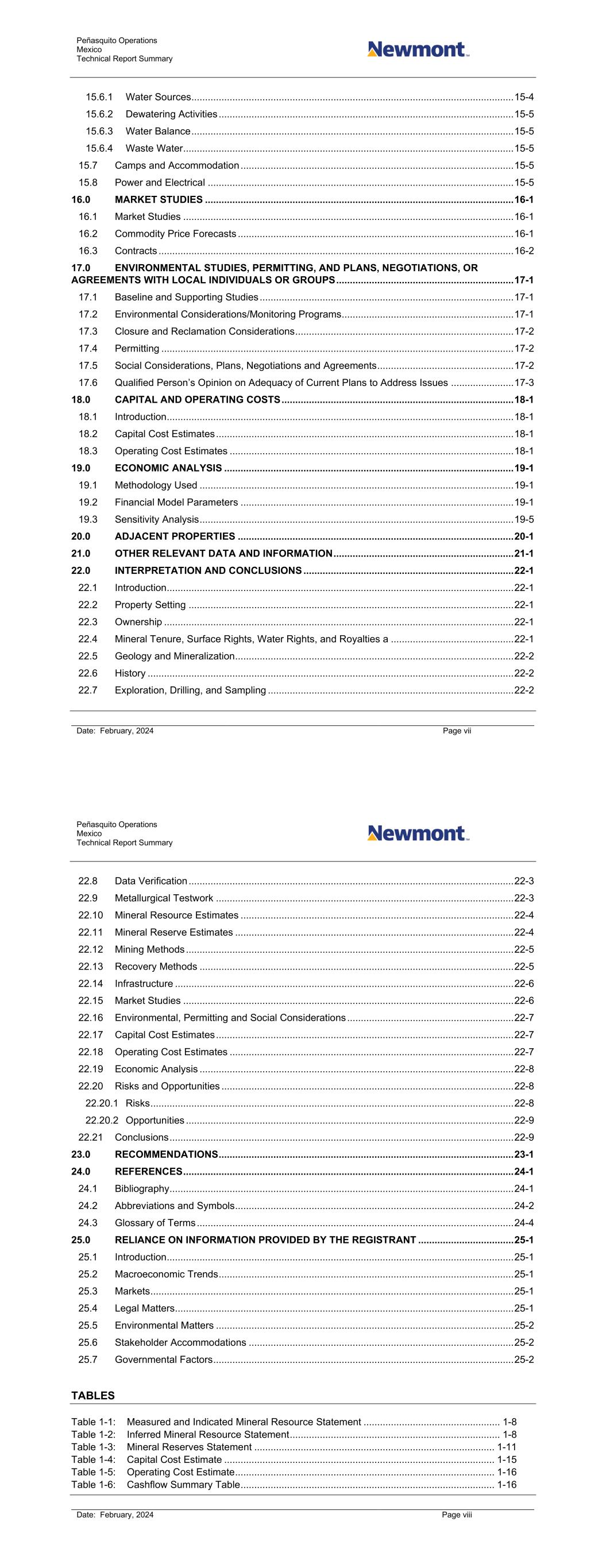 Peñasquito Operations Mexico Technical Report Summary Date: February, 2024 Page vii 15.6.1 Water Sources ...................................................................................................................... 15-4 15.6.2 Dewatering Activities ............................................................................................................ 15-5 15.6.3 Water Balance ...................................................................................................................... 15-5 15.6.4 Waste Water ......................................................................................................................... 15-5 15.7 Camps and Accommodation .................................................................................................... 15-5 15.8 Power and Electrical ................................................................................................................ 15-5 16.0 MARKET STUDIES ................................................................................................................. 16-1 16.1 Market Studies ......................................................................................................................... 16-1 16.2 Commodity Price Forecasts ..................................................................................................... 16-1 16.3 Contracts .................................................................................................................................. 16-2 17.0 ENVIRONMENTAL STUDIES, PERMITTING, AND PLANS, NEGOTIATIONS, OR AGREEMENTS WITH LOCAL INDIVIDUALS OR GROUPS ................................................................. 17-1 17.1 Baseline and Supporting Studies ............................................................................................. 17-1 17.2 Environmental Considerations/Monitoring Programs............................................................... 17-1 17.3 Closure and Reclamation Considerations ................................................................................ 17-2 17.4 Permitting ................................................................................................................................. 17-2 17.5 Social Considerations, Plans, Negotiations and Agreements .................................................. 17-2 17.6 Qualified Person’s Opinion on Adequacy of Current Plans to Address Issues ....................... 17-3 18.0 CAPITAL AND OPERATING COSTS ..................................................................................... 18-1 18.1 Introduction ............................................................................................................................... 18-1 18.2 Capital Cost Estimates ............................................................................................................. 18-1 18.3 Operating Cost Estimates ........................................................................................................ 18-1 19.0 ECONOMIC ANALYSIS .......................................................................................................... 19-1 19.1 Methodology Used ................................................................................................................... 19-1 19.2 Financial Model Parameters .................................................................................................... 19-1 19.3 Sensitivity Analysis ................................................................................................................... 19-5 20.0 ADJACENT PROPERTIES ..................................................................................................... 20-1 21.0 OTHER RELEVANT DATA AND INFORMATION .................................................................. 21-1 22.0 INTERPRETATION AND CONCLUSIONS ............................................................................. 22-1 22.1 Introduction ............................................................................................................................... 22-1 22.2 Property Setting ....................................................................................................................... 22-1 22.3 Ownership ................................................................................................................................ 22-1 22.4 Mineral Tenure, Surface Rights, Water Rights, and Royalties a ............................................. 22-1 22.5 Geology and Mineralization ...................................................................................................... 22-2 22.6 History ...................................................................................................................................... 22-2 22.7 Exploration, Drilling, and Sampling .......................................................................................... 22-2 Peñasquito Operations Mexico Technical Report Summary Date: February, 2024 Page viii 22.8 Data Verification ....................................................................................................................... 22-3 22.9 Metallurgical Testwork ............................................................................................................. 22-3 22.10 Mineral Resource Estimates .................................................................................................... 22-4 22.11 Mineral Reserve Estimates ...................................................................................................... 22-4 22.12 Mining Methods ........................................................................................................................ 22-5 22.13 Recovery Methods ................................................................................................................... 22-5 22.14 Infrastructure ...................................................................................