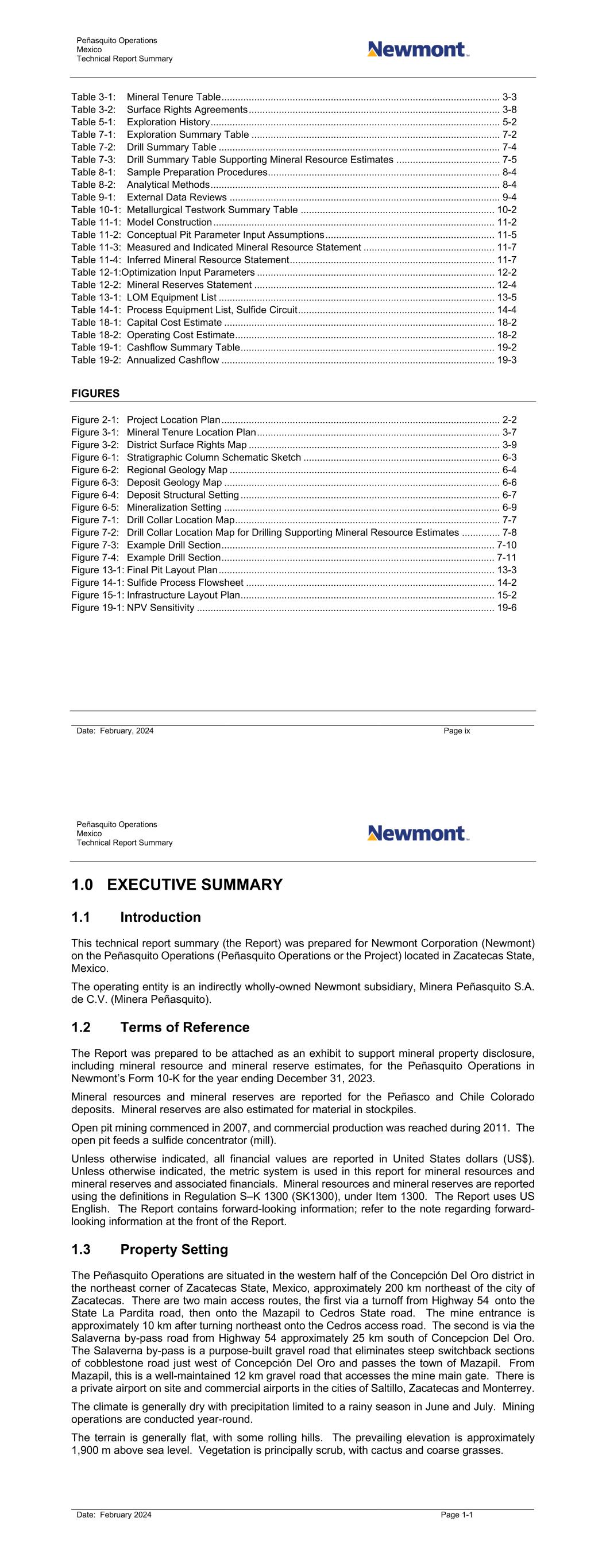 Peñasquito Operations Mexico Technical Report Summary Date: February, 2024 Page ix Table 3-1: Mineral Tenure Table ...................................................................................................... 3-3 Table 3-2: Surface Rights Agreements ............................................................................................ 3-8 Table 5-1: Exploration History .......................................................................................................... 5-2 Table 7-1: Exploration Summary Table ........................................................................................... 7-2 Table 7-2: Drill Summary Table ....................................................................................................... 7-4 Table 7-3: Drill Summary Table Supporting Mineral Resource Estimates ...................................... 7-5 Table 8-1: Sample Preparation Procedures ..................................................................................... 8-4 Table 8-2: Analytical Methods .......................................................................................................... 8-4 Table 9-1: External Data Reviews ................................................................................................... 9-4 Table 10-1: Metallurgical Testwork Summary Table ....................................................................... 10-2 Table 11-1: Model Construction ....................................................................................................... 11-2 Table 11-2: Conceptual Pit Parameter Input Assumptions .............................................................. 11-5 Table 11-3: Measured and Indicated Mineral Resource Statement ................................................ 11-7 Table 11-4: Inferred Mineral Resource Statement ........................................................................... 11-7 Table 12-1:Optimization Input Parameters ....................................................................................... 12-2 Table 12-2: Mineral Reserves Statement ........................................................................................ 12-4 Table 13-1: LOM Equipment List ..................................................................................................... 13-5 Table 14-1: Process Equipment List, Sulfide Circuit ........................................................................ 14-4 Table 18-1: Capital Cost Estimate ................................................................................................... 18-2 Table 18-2: Operating Cost Estimate ............................................................................................... 18-2 Table 19-1: Cashflow Summary Table ............................................................................................. 19-2 Table 19-2: Annualized Cashflow .................................................................................................... 19-3 FIGURES Figure 2-1: Project Location Plan ...................................................................................................... 2-2 Figure 3-1: Mineral Tenure Location Plan ......................................................................................... 3-7 Figure 3-2: District Surface Rights Map ............................................................................................ 3-9 Figure 6-1: Stratigraphic Column Schematic Sketch ........................................................................ 6-3 Figure 6-2: Regional Geology Map ................................................................................................... 6-4 Figure 6-3: Deposit Geology Map ..................................................................................................... 6-6 Figure 6-4: Deposit Structural Setting ............................................................................................... 6-7 Figure 6-5: Mineralization Setting ..................................................................................................... 6-9 Figure 7-1: Drill Collar Location Map ................................................................................................. 7-7 Figure 7-2: Drill Collar Location Map for Drilling Supporting Mineral Resource Estimates .............. 7-8 Figure 7-3: Example Drill Section .................................................................................................... 7-10 Figure 7-4: Example Drill Section .................................................................................................... 7-11 Figure 13-1: Final Pit Layout Plan ..................................................................................................... 13-3 Figure 14-1: Sulfide Process Flowsheet ........................................................................................... 14-2 Figure 15-1: Infrastructure Layout Plan ............................................................................................. 15-2 Figure 19-1: NPV Sensitivity ............................................................................................................. 19-6 Peñasquito Operations Mexico Technical Report Summary Date: February 2024 Page 1-1 1.0 EXECUTIVE SUMMARY 1.1 Introduction This technical report summary (the Report) was prepared for Newmont Corporation (Newmont) on the Peñasquito Operations (Peñasquito Operations or the Project) located in Zacatecas State, Mexico. The operating entity is an indirectly wholly-owned Newmont subsidiary, Minera Peñasquito S.A. de C.V. (Minera Peñasquito). 1.2 Terms of Reference The Report was prepared to be attached as an exhibit to support mineral property disclosure, including mineral resource and mineral reserve estimates, for the Peñasquito Operations in Newmont’s Form 10-K for the year ending December 31, 2023. Mineral resources and mineral reserves are reported for the Peñasco and Chile Colorad