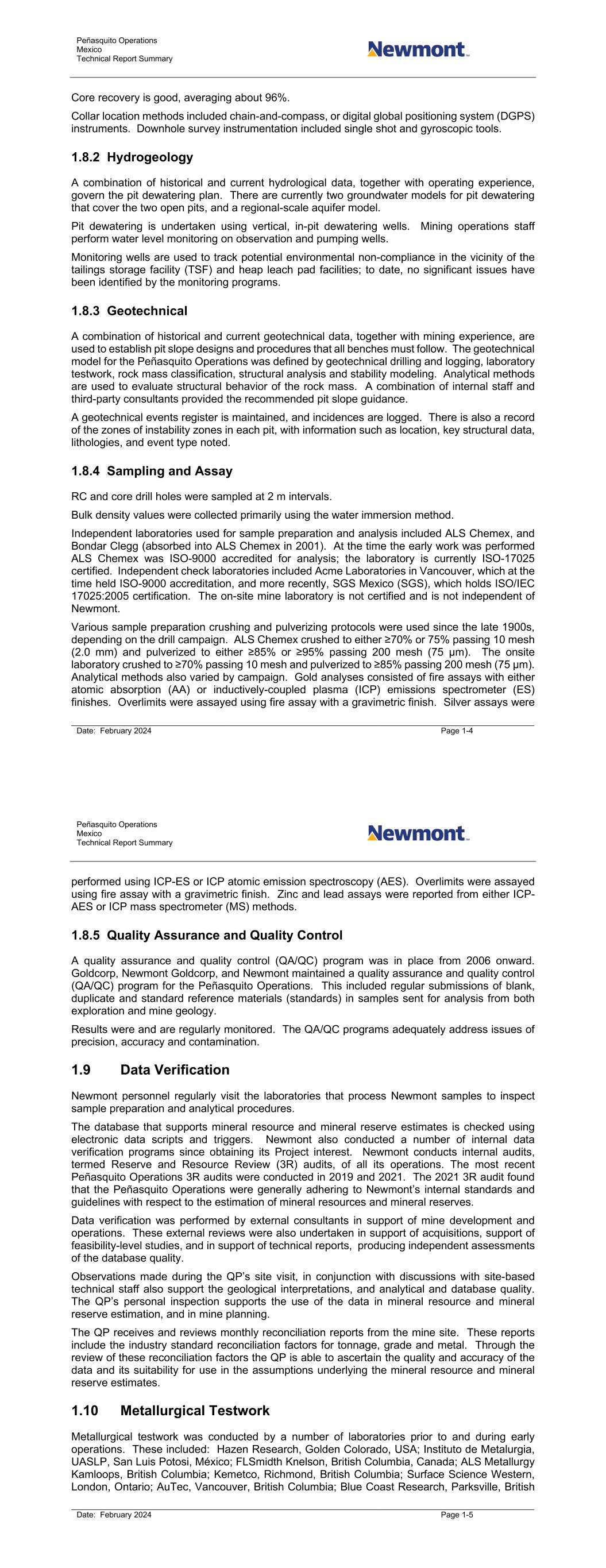 Peñasquito Operations Mexico Technical Report Summary Date: February 2024 Page 1-4 Core recovery is good, averaging about 96%. Collar location methods included chain-and-compass, or digital global positioning system (DGPS) instruments. Downhole survey instrumentation included single shot and gyroscopic tools. 1.8.2 Hydrogeology A combination of historical and current hydrological data, together with operating experience, govern the pit dewatering plan. There are currently two groundwater models for pit dewatering that cover the two open pits, and a regional-scale aquifer model. Pit dewatering is undertaken using vertical, in-pit dewatering wells. Mining operations staff perform water level monitoring on observation and pumping wells. Monitoring wells are used to track potential environmental non-compliance in the vicinity of the tailings storage facility (TSF) and heap leach pad facilities; to date, no significant issues have been identified by the monitoring programs. 1.8.3 Geotechnical A combination of historical and current geotechnical data, together with mining experience, are used to establish pit slope designs and procedures that all benches must follow. The geotechnical model for the Peñasquito Operations was defined by geotechnical drilling and logging, laboratory testwork, rock mass classification, structural analysis and stability modeling. Analytical methods are used to evaluate structural behavior of the rock mass. A combination of internal staff and third-party consultants provided the recommended pit slope guidance. A geotechnical events register is maintained, and incidences are logged. There is also a record of the zones of instability zones in each pit, with information such as location, key structural data, lithologies, and event type noted. 1.8.4 Sampling and Assay RC and core drill holes were sampled at 2 m intervals. Bulk density values were collected primarily using the water immersion method. Independent laboratories used for sample preparation and analysis included ALS Chemex, and Bondar Clegg (absorbed into ALS Chemex in 2001). At the time the early work was performed ALS Chemex was ISO-9000 accredited for analysis; the laboratory is currently ISO-17025 certified. Independent check laboratories included Acme Laboratories in Vancouver, which at the time held ISO-9000 accreditation, and more recently, SGS Mexico (SGS), which holds ISO/IEC 17025:2005 certification. The on-site mine laboratory is not certified and is not independent of Newmont. Various sample preparation crushing and pulverizing protocols were used since the late 1900s, depending on the drill campaign. ALS Chemex crushed to either ≥70% or 75% passing 10 mesh (2.0 mm) and pulverized to either ≥85% or ≥95% passing 200 mesh (75 µm). The onsite laboratory crushed to ≥70% passing 10 mesh and pulverized to ≥85% passing 200 mesh (75 µm). Analytical methods also varied by campaign. Gold analyses consisted of fire assays with either atomic absorption (AA) or inductively-coupled plasma (ICP) emissions spectrometer (ES) finishes. Overlimits were assayed using fire assay with a gravimetric finish. Silver assays were Peñasquito Operations Mexico Technical Report Summary Date: February 2024 Page 1-5 performed using ICP-ES or ICP atomic emission spectroscopy (AES). Overlimits were assayed using fire assay with a gravimetric finish. Zinc and lead assays were reported from either ICP- AES or ICP mass spectrometer (MS) methods. 1.8.5 Quality Assurance and Quality Control A quality assurance and quality control (QA/QC) program was in place from 2006 onward. Goldcorp, Newmont Goldcorp, and Newmont maintained a quality assurance and quality control (QA/QC) program for the Peñasquito Operations. This included regular submissions of blank, duplicate and standard reference materials (standards) in samples sent for analysis from both exploration and mine geology. Results were and are regularly monitored. The QA/QC programs adequately address issues of precision, accuracy and contamination. 1.9 Data Verification Newmont personnel regularly visit the laboratories that process Newmont samples to inspect sample preparation and analytical procedures. The database that supports mineral resource and mineral reserve estimates is checked using electronic data scripts and triggers. Newmont also conducted a number of internal data verification programs since obtaining its Project interest. Newmont conducts internal audits, termed Reserve and Resource Review (3R) audits, of all its operations. The most recent Peñasquito Operations 3R audits were conducted in 2019 and 2021. The 2021 3R audit found that the Peñasquito Operations were generally adhering to Newmont’s internal standards and guidelines with respect to the estimation of mineral resources and mineral reserves. Data verification was performed by external consultants in support of mine development and operations. These external reviews were also undertaken in support of acquisitions, support of feasibility-level studies, and in support of technical reports, producing independent assessments of the database quality. Observations made during the QP’s site visit, in conjunction with discussions with site-based technical staff also support the geological interpretations, and analytical and database quality. The QP’s personal inspection supports the use of the data in mineral resource and mineral reserve estimation, and in mine planning. The QP receives and reviews monthly reconciliation reports from the mine site. These reports include the industry standard reconciliation factors for tonnage, grade and metal. Through the review of these reconciliation factors the QP is able to ascertain the quality and accuracy of the data and its suitability for use in the assumptions underlying the mineral resource and mineral reserve estimates. 1.10 Metallurgical Testwork Metallurgical testwork was conducted by a number of laboratories prior to and during early operations.