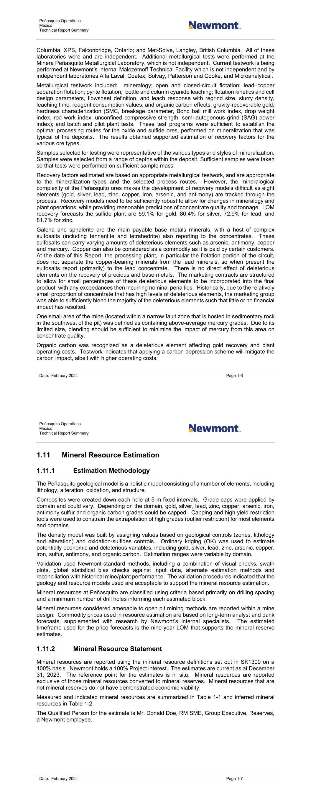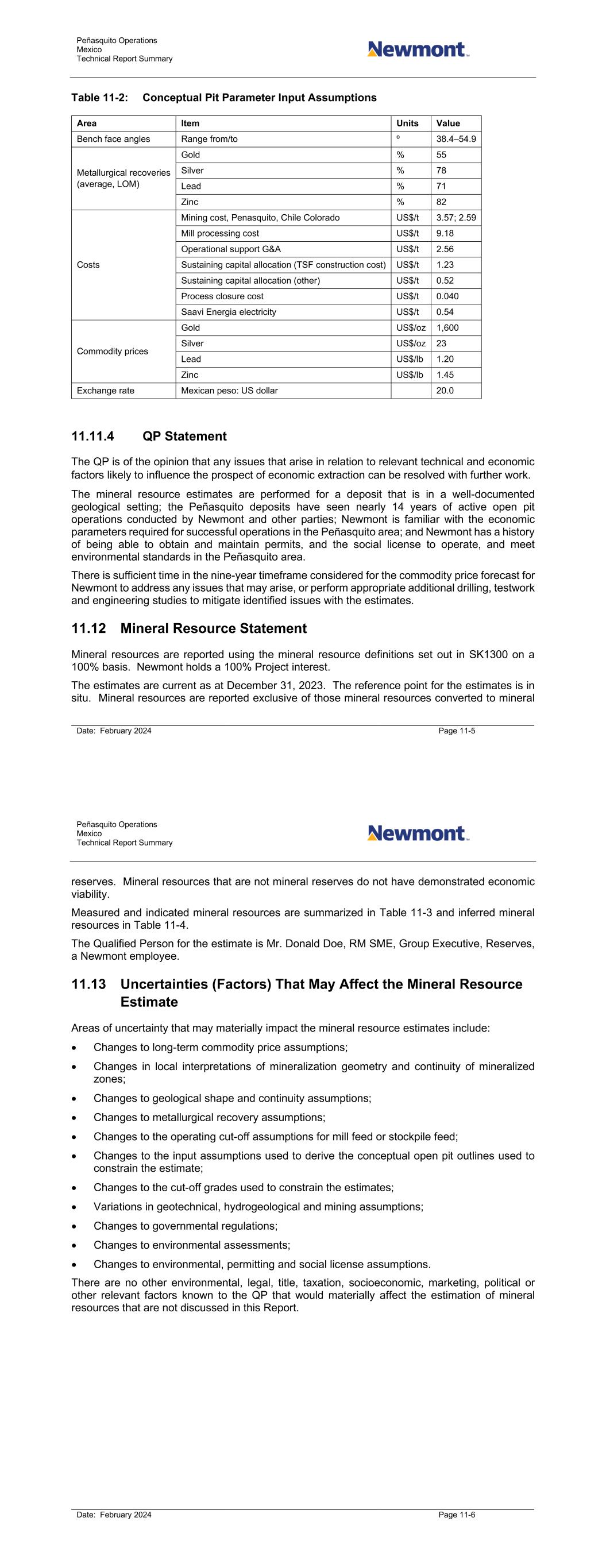 Peñasquito Operations Mexico Technical Report Summary Date: February 2024 Page 11-5 Table 11-2: Conceptual Pit Parameter Input Assumptions Area Item Units Value Bench face angles Range from/to º 38.4–54.9 Metallurgical recoveries (average, LOM) Gold % 55 Silver % 78 Lead % 71 Zinc % 82 Costs Mining cost, Penasquito, Chile Colorado US$/t 3.57; 2.59 Mill processing cost US$/t 9.18 Operational support G&A US$/t 2.56 Sustaining capital allocation (TSF construction cost) US$/t 1.23 Sustaining capital allocation (other) US$/t 0.52 Process closure cost US$/t 0.040 Saavi Energia electricity US$/t 0.54 Commodity prices Gold US$/oz 1,600 Silver US$/oz 23 Lead US$/lb 1.20 Zinc US$/lb 1.45 Exchange rate Mexican peso: US dollar 20.0 11.11.4 QP Statement The QP is of the opinion that any issues that arise in relation to relevant technical and economic factors likely to influence the prospect of economic extraction can be resolved with further work. The mineral resource estimates are performed for a deposit that is in a well-documented geological setting; the Peñasquito deposits have seen nearly 14 years of active open pit operations conducted by Newmont and other parties; Newmont is familiar with the economic parameters required for successful operations in the Peñasquito area; and Newmont has a history of being able to obtain and maintain permits, and the social license to operate, and meet environmental standards in the Peñasquito area. There is sufficient time in the nine-year timeframe considered for the commodity price forecast for Newmont to address any issues that may arise, or perform appropriate additional drilling, testwork and engineering studies to mitigate identified issues with the estimates. 11.12 Mineral Resource Statement Mineral resources are reported using the mineral resource definitions set out in SK1300 on a 100% basis. Newmont holds a 100% Project interest. The estimates are current as at December 31, 2023. The reference point for the estimates is in situ. Mineral resources are reported exclusive of those mineral resources converted to mineral Peñasquito Operations Mexico Technical Report Summary Date: February 2024 Page 11-6 reserves. Mineral resources that are not mineral reserves do not have demonstrated economic viability. Measured and indicated mineral resources are summarized in Table 11-3 and inferred mineral resources in Table 11-4. The Qualified Person for the estimate is Mr. Donald Doe, RM SME, Group Executive, Reserves, a Newmont employee. 11.13 Uncertainties (Factors) That May Affect the Mineral Resource Estimate Areas of uncertainty that may materially impact the mineral resource estimates include: • Changes to long-term commodity price assumptions; • Changes in local interpretations of mineralization geometry and continuity of mineralized zones; • Changes to geological shape and continuity assumptions; • Changes to metallurgical recovery assumptions; • Changes to the operating cut-off assumptions for mill feed or stockpile feed; • Changes to the input assumptions used to derive the conceptual open pit outlines used to constrain the estimate; • Changes to the cut-off grades used to constrain the estimates; • Variations in geotechnical, hydrogeological and mining assumptions; • Changes to governmental regulations; • Changes to environmental assessments; • Changes to environmental, permitting and social license assumptions. There are no other environmental, legal, title, taxation, socioeconomic, marketing, political or other relevant factors known to the QP that would materially affect the estimation of mineral resources that are not discussed in this Report.