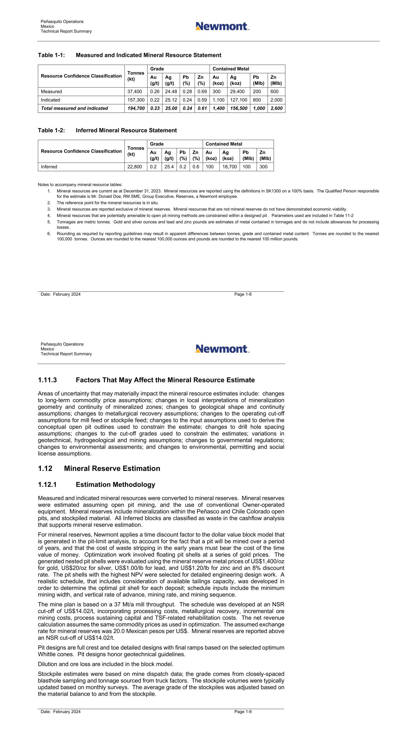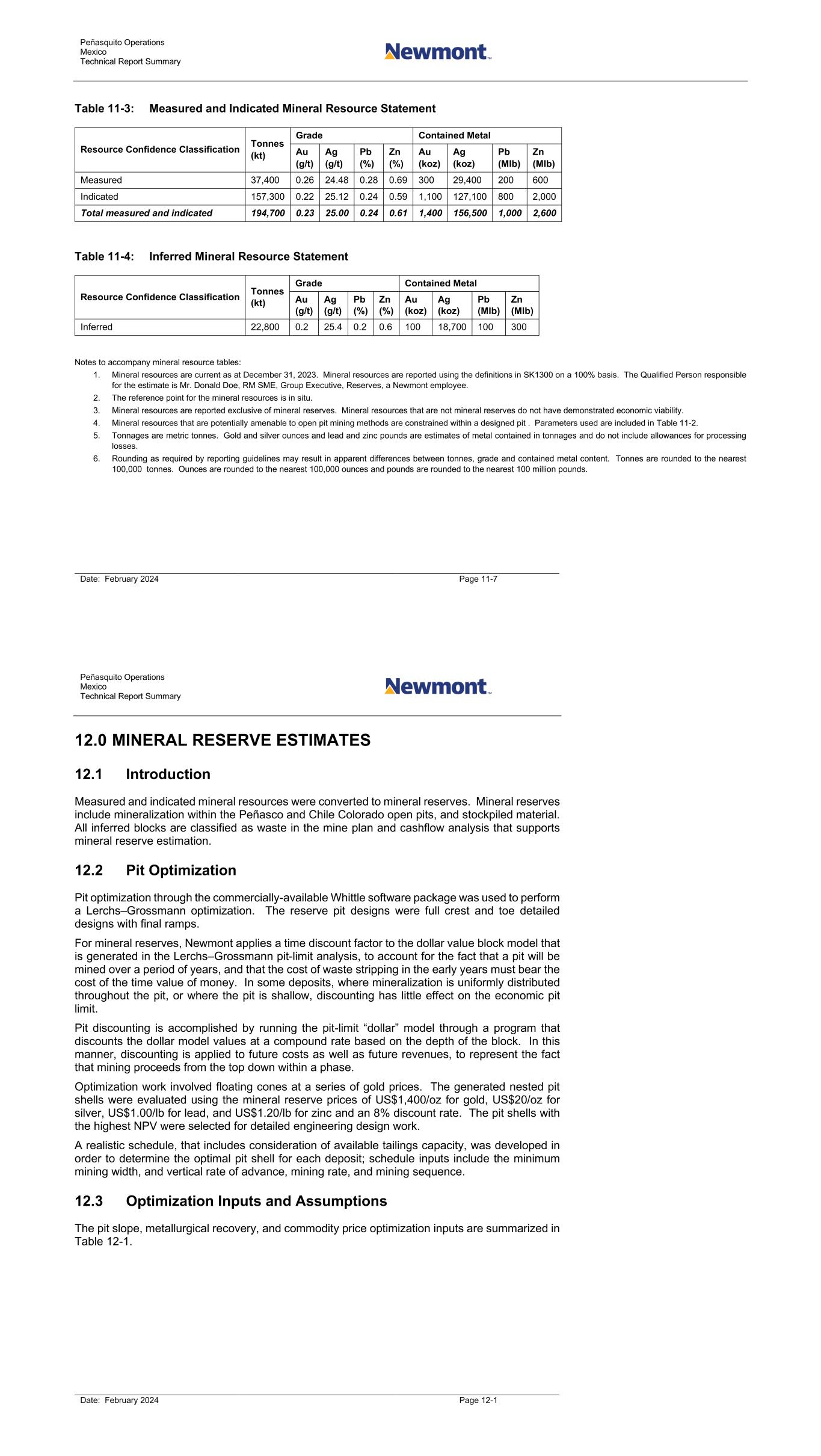 Peñasquito Operations Mexico Technical Report Summary Date: February 2024 Page 11-7 Table 11-3: Measured and Indicated Mineral Resource Statement Resource Confidence Classification Tonnes (kt) Grade Contained Metal Au (g/t) Ag (g/t) Pb (%) Zn (%) Au (koz) Ag (koz) Pb (Mlb) Zn (Mlb) Measured 37,400 0.26 24.48 0.28 0.69 300 29,400 200 600 Indicated 157,300 0.22 25.12 0.24 0.59 1,100 127,100 800 2,000 Total measured and indicated 194,700 0.23 25.00 0.24 0.61 1,400 156,500 1,000 2,600 Table 11-4: Inferred Mineral Resource Statement Resource Confidence Classification Tonnes (kt) Grade Contained Metal Au (g/t) Ag (g/t) Pb (%) Zn (%) Au (koz) Ag (koz) Pb (Mlb) Zn (Mlb) Inferred 22,800 0.2 25.4 0.2 0.6 100 18,700 100 300 Notes to accompany mineral resource tables: 1. Mineral resources are current as at December 31, 2023. Mineral resources are reported using the definitions in SK1300 on a 100% basis. The Qualified Person responsible for the estimate is Mr. Donald Doe, RM SME, Group Executive, Reserves, a Newmont employee. 2. The reference point for the mineral resources is in situ. 3. Mineral resources are reported exclusive of mineral reserves. Mineral resources that are not mineral reserves do not have demonstrated economic viability. 4. Mineral resources that are potentially amenable to open pit mining methods are constrained within a designed pit . Parameters used are included in Table 11-2. 5. Tonnages are metric tonnes. Gold and silver ounces and lead and zinc pounds are estimates of metal contained in tonnages and do not include allowances for processing losses. 6. Rounding as required by reporting guidelines may result in apparent differences between tonnes, grade and contained metal content. Tonnes are rounded to the nearest 100,000 tonnes. Ounces are rounded to the nearest 100,000 ounces and pounds are rounded to the nearest 100 million pounds. Peñasquito Operations Mexico Technical Report Summary Date: February 2024 Page 12-1 12.0 MINERAL RESERVE ESTIMATES 12.1 Introduction Measured and indicated mineral resources were converted to mineral reserves. Mineral reserves include mineralization within the Peñasco and Chile Colorado open pits, and stockpiled material. All inferred blocks are classified as waste in the mine plan and cashflow analysis that supports mineral reserve estimation. 12.2 Pit Optimization Pit optimization through the commercially-available Whittle software package was used to perform a Lerchs–Grossmann optimization. The reserve pit designs were full crest and toe detailed designs with final ramps. For mineral reserves, Newmont applies a time discount factor to the dollar value block model that is generated in the Lerchs–Grossmann pit-limit analysis, to account for the fact that a pit will be mined over a period of years, and that the cost of waste stripping in the early years must bear the cost of the time value of money. In some deposits, where mineralization is uniformly distributed throughout the pit, or where the pit is shallow, discounting has little effect on the economic pit limit. Pit discounting is accomplished by running the pit-limit “dollar” model through a program that discounts the dollar model values at a compound rate based on the depth of the block. In this manner, discounting is applied to future costs as well as future revenues, to represent the fact that mining proceeds from the top down within a phase. Optimization work involved floating cones at a series of gold prices. The generated nested pit shells were evaluated using the mineral reserve prices of US$1,400/oz for gold, US$20/oz for silver, US$1.00/lb for lead, and US$1.20/lb for zinc and an 8% discount rate. The pit shells with the highest NPV were selected for detailed engineering design work. A realistic schedule, that includes consideration of available tailings capacity, was developed in order to determine the optimal pit shell for each deposit; schedule inputs include the minimum mining width, and vertical rate of advance, mining rate, and mining sequence. 12.3 Optimization Inputs and Assumptions The pit slope, metallurgical recovery, and commodity price optimization inputs are summarized in Table 12-1.