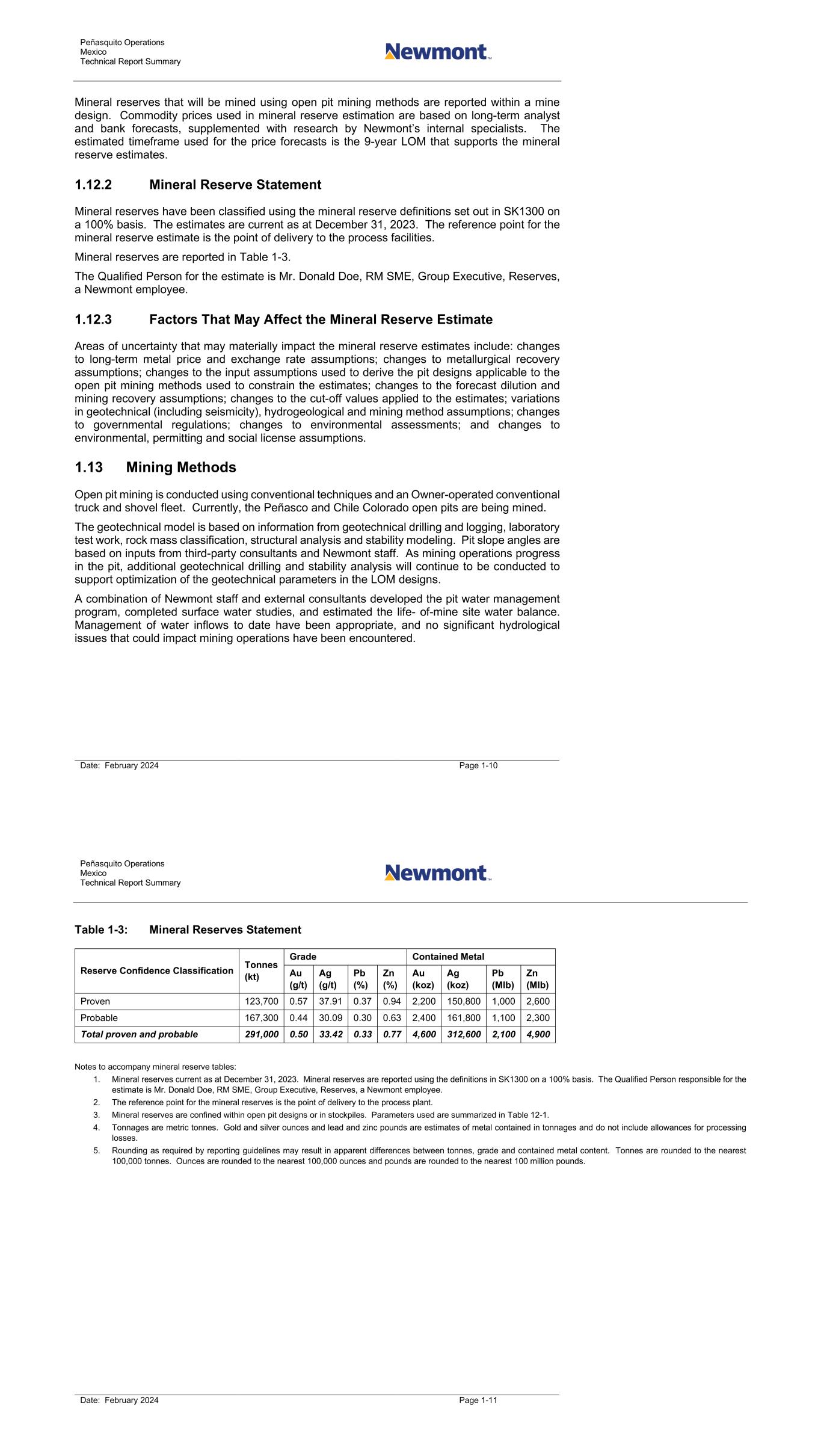 Peñasquito Operations Mexico Technical Report Summary Date: February 2024 Page 1-10 Mineral reserves that will be mined using open pit mining methods are reported within a mine design. Commodity prices used in mineral reserve estimation are based on long-term analyst and bank forecasts, supplemented with research by Newmont’s internal specialists. The estimated timeframe used for the price forecasts is the 9-year LOM that supports the mineral reserve estimates. 1.12.2 Mineral Reserve Statement Mineral reserves have been classified using the mineral reserve definitions set out in SK1300 on a 100% basis. The estimates are current as at December 31, 2023. The reference point for the mineral reserve estimate is the point of delivery to the process facilities. Mineral reserves are reported in Table 1-3. The Qualified Person for the estimate is Mr. Donald Doe, RM SME, Group Executive, Reserves, a Newmont employee. 1.12.3 Factors That May Affect the Mineral Reserve Estimate Areas of uncertainty that may materially impact the mineral reserve estimates include: changes to long-term metal price and exchange rate assumptions; changes to metallurgical recovery assumptions; changes to the input assumptions used to derive the pit designs applicable to the open pit mining methods used to constrain the estimates; changes to the forecast dilution and mining recovery assumptions; changes to the cut-off values applied to the estimates; variations in geotechnical (including seismicity), hydrogeological and mining method assumptions; changes to governmental regulations; changes to environmental assessments; and changes to environmental, permitting and social license assumptions. 1.13 Mining Methods Open pit mining is conducted using conventional techniques and an Owner-operated conventional truck and shovel fleet. Currently, the Peñasco and Chile Colorado open pits are being mined. The geotechnical model is based on information from geotechnical drilling and logging, laboratory test work, rock mass classification, structural analysis and stability modeling. Pit slope angles are based on inputs from third-party consultants and Newmont staff. As mining operations progress in the pit, additional geotechnical drilling and stability analysis will continue to be conducted to support optimization of the geotechnical parameters in the LOM designs. A combination of Newmont staff and external consultants developed the pit water management program, completed surface water studies, and estimated the life- of-mine site water balance. Management of water inflows to date have been appropriate, and no significant hydrological issues that could impact mining operations have been encountered. Peñasquito Operations Mexico Technical Report Summary Date: February 2024 Page 1-11 Table 1-3: Mineral Reserves Statement Reserve Confidence Classification Tonnes (kt) Grade Contained Metal Au (g/t) Ag (g/t) Pb (%) Zn (%) Au (koz) Ag (koz) Pb (Mlb) Zn (Mlb) Proven 123,700 0.57 37.91 0.37 0.94 2,200 150,800 1,000 2,600 Probable 167,300 0.44 30.09 0.30 0.63 2,400 161,800 1,100 2,300 Total proven and probable 291,000 0.50 33.42 0.33 0.77 4,600 312,600 2,100 4,900 Notes to accompany mineral reserve tables: 1. Mineral reserves current as at December 31, 2023. Mineral reserves are reported using the definitions in SK1300 on a 100% basis. The Qualified Person responsible for the estimate is Mr. Donald Doe, RM SME, Group Executive, Reserves, a Newmont employee. 2. The reference point for the mineral reserves is the point of delivery to the process plant. 3. Mineral reserves are confined within open pit designs or in stockpiles. Parameters used are summarized in Table 12-1. 4. Tonnages are metric tonnes. Gold and silver ounces and lead and zinc pounds are estimates of metal contained in tonnages and do not include allowances for processing losses. 5. Rounding as required by reporting guidelines may result in apparent differences between tonnes, grade and contained metal content. Tonnes are rounded to the nearest 100,000 tonnes. Ounces are rounded to the nearest 100,000 ounces and pounds are rounded to the nearest 100 million pounds.