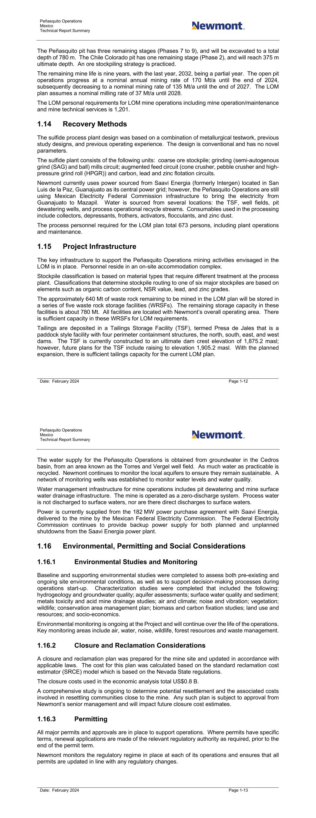 Peñasquito Operations Mexico Technical Report Summary Date: February 2024 Page 1-12 The Peñasquito pit has three remaining stages (Phases 7 to 9), and will be excavated to a total depth of 780 m. The Chile Colorado pit has one remaining stage (Phase 2), and will reach 375 m ultimate depth. An ore stockpiling strategy is practiced. The remaining mine life is nine years, with the last year, 2032, being a partial year. The open pit operations progress at a nominal annual mining rate of 170 Mt/a until the end of 2024, subsequently decreasing to a nominal mining rate of 135 Mt/a until the end of 2027. The LOM plan assumes a nominal milling rate of 37 Mt/a until 2028. The LOM personal requirements for LOM mine operations including mine operation/maintenance and mine technical services is 1,201. 1.14 Recovery Methods The sulfide process plant design was based on a combination of metallurgical testwork, previous study designs, and previous operating experience. The design is conventional and has no novel parameters. The sulfide plant consists of the following units: coarse ore stockpile; grinding (semi-autogenous grind (SAG) and ball) mills circuit; augmented feed circuit (cone crusher, pebble crusher and high- pressure grind roll (HPGR)) and carbon, lead and zinc flotation circuits. Newmont currently uses power sourced from Saavi Energia (formerly Intergen) located in San Luis de la Paz, Guanajuato as its central power grid; however, the Peñasquito Operations are still using Mexican Electricity Federal Commission infrastructure to bring the electricity from Guanajuato to Mazapil. Water is sourced from several locations: the TSF, well fields, pit dewatering wells, and process operational recycle streams. Consumables used in the processing include collectors, depressants, frothers, activators, flocculants, and zinc dust. The process personnel required for the LOM plan total 673 persons, including plant operations and maintenance. 1.15 Project Infrastructure The key infrastructure to support the Peñasquito Operations mining activities envisaged in the LOM is in place. Personnel reside in an on-site accommodation complex. Stockpile classification is based on material types that require different treatment at the process plant. Classifications that determine stockpile routing to one of six major stockpiles are based on elements such as organic carbon content, NSR value, lead, and zinc grades. The approximately 640 Mt of waste rock remaining to be mined in the LOM plan will be stored in a series of five waste rock storage facilities (WRSFs). The remaining storage capacity in these facilities is about 780 Mt. All facilities are located with Newmont’s overall operating area. There is sufficient capacity in these WRSFs for LOM requirements. Tailings are deposited in a Tailings Storage Facility (TSF), termed Presa de Jales that is a paddock style facility with four perimeter containment structures, the north, south, east, and west dams. The TSF is currently constructed to an ultimate dam crest elevation of 1,875.2 masl; however, future plans for the TSF include raising to elevation 1,905.2 masl. With the planned expansion, there is sufficient tailings capacity for the current LOM plan. Peñasquito Operations Mexico Technical Report Summary Date: February 2024 Page 1-13 The water supply for the Peñasquito Operations is obtained from groundwater in the Cedros basin, from an area known as the Torres and Vergel well field. As much water as practicable is recycled. Newmont continues to monitor the local aquifers to ensure they remain sustainable. A network of monitoring wells was established to monitor water levels and water quality. Water management infrastructure for mine operations includes pit dewatering and mine surface water drainage infrastructure. The mine is operated as a zero-discharge system. Process water is not discharged to surface waters, nor are there direct discharges to surface waters. Power is currently supplied from the 182 MW power purchase agreement with Saavi Energia, delivered to the mine by the Mexican Federal Electricity Commission. The Federal Electricity Commission continues to provide backup power supply for both planned and unplanned shutdowns from the Saavi Energia power plant. 1.16 Environmental, Permitting and Social Considerations 1.16.1 Environmental Studies and Monitoring Baseline and supporting environmental studies were completed to assess both pre-existing and ongoing site environmental conditions, as well as to support decision-making processes during operations start-up. Characterization studies were completed that included the following: hydrogeology and groundwater quality; aquifer assessments; surface water quality and sediment; metals toxicity and acid mine drainage studies; air and climate; noise and vibration; vegetation; wildlife; conservation area management plan; biomass and carbon fixation studies; land use and resources; and socio-economics. Environmental monitoring is ongoing at the Project and will continue over the life of the operations. Key monitoring areas include air, water, noise, wildlife, forest resources and waste management. 1.16.2 Closure and Reclamation Considerations A closure and reclamation plan was prepared for the mine site and updated in accordance with applicable laws. The cost for this plan was calculated based on the standard reclamation cost estimator (SRCE) model which is based on the Nevada State regulations. The closure costs used in the economic analysis total US$0.8 B. A comprehensive study is ongoing to determine potential resettlement and the associated costs involved in resettling communities close to the mine. Any such plan is subject to approval from Newmont’s senior management and will impact future closure cost estimates. 1.16.3 Permitting All major permits and approvals are in place to support operations. Where permits have specific terms, renewal applications are made of the relevant regulatory authority as requ