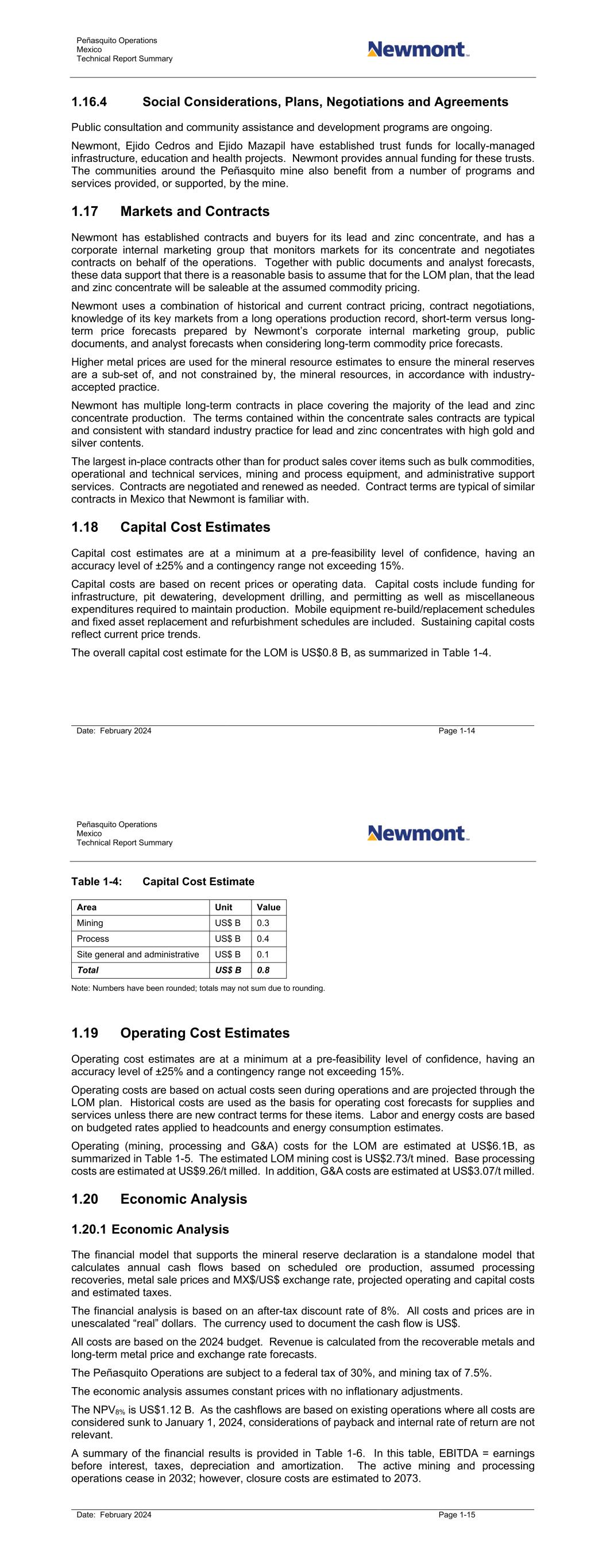 Peñasquito Operations Mexico Technical Report Summary Date: February 2024 Page 1-14 1.16.4 Social Considerations, Plans, Negotiations and Agreements Public consultation and community assistance and development programs are ongoing. Newmont, Ejido Cedros and Ejido Mazapil have established trust funds for locally-managed infrastructure, education and health projects. Newmont provides annual funding for these trusts. The communities around the Peñasquito mine also benefit from a number of programs and services provided, or supported, by the mine. 1.17 Markets and Contracts Newmont has established contracts and buyers for its lead and zinc concentrate, and has a corporate internal marketing group that monitors markets for its concentrate and negotiates contracts on behalf of the operations. Together with public documents and analyst forecasts, these data support that there is a reasonable basis to assume that for the LOM plan, that the lead and zinc concentrate will be saleable at the assumed commodity pricing. Newmont uses a combination of historical and current contract pricing, contract negotiations, knowledge of its key markets from a long operations production record, short-term versus long- term price forecasts prepared by Newmont’s corporate internal marketing group, public documents, and analyst forecasts when considering long-term commodity price forecasts. Higher metal prices are used for the mineral resource estimates to ensure the mineral reserves are a sub-set of, and not constrained by, the mineral resources, in accordance with industry- accepted practice. Newmont has multiple long-term contracts in place covering the majority of the lead and zinc concentrate production. The terms contained within the concentrate sales contracts are typical and consistent with standard industry practice for lead and zinc concentrates with high gold and silver contents. The largest in-place contracts other than for product sales cover items such as bulk commodities, operational and technical services, mining and process equipment, and administrative support services. Contracts are negotiated and renewed as needed. Contract terms are typical of similar contracts in Mexico that Newmont is familiar with. 1.18 Capital Cost Estimates Capital cost estimates are at a minimum at a pre-feasibility level of confidence, having an accuracy level of ±25% and a contingency range not exceeding 15%. Capital costs are based on recent prices or operating data. Capital costs include funding for infrastructure, pit dewatering, development drilling, and permitting as well as miscellaneous expenditures required to maintain production. Mobile equipment re-build/replacement schedules and fixed asset replacement and refurbishment schedules are included. Sustaining capital costs reflect current price trends. The overall capital cost estimate for the LOM is US$0.8 B, as summarized in Table 1-4. Peñasquito Operations Mexico Technical Report Summary Date: February 2024 Page 1-15 Table 1-4: Capital Cost Estimate Area Unit Value Mining US$ B 0.3 Process US$ B 0.4 Site general and administrative US$ B 0.1 Total US$ B 0.8 Note: Numbers have been rounded; totals may not sum due to rounding. 1.19 Operating Cost Estimates Operating cost estimates are at a minimum at a pre-feasibility level of confidence, having an accuracy level of ±25% and a contingency range not exceeding 15%. Operating costs are based on actual costs seen during operations and are projected through the LOM plan. Historical costs are used as the basis for operating cost forecasts for supplies and services unless there are new contract terms for these items. Labor and energy costs are based on budgeted rates applied to headcounts and energy consumption estimates. Operating (mining, processing and G&A) costs for the LOM are estimated at US$6.1B, as summarized in Table 1-5. The estimated LOM mining cost is US$2.73/t mined. Base processing costs are estimated at US$9.26/t milled. In addition, G&A costs are estimated at US$3.07/t milled. 1.20 Economic Analysis 1.20.1 Economic Analysis The financial model that supports the mineral reserve declaration is a standalone model that calculates annual cash flows based on scheduled ore production, assumed processing recoveries, metal sale prices and MX$/US$ exchange rate, projected operating and capital costs and estimated taxes. The financial analysis is based on an after-tax discount rate of 8%. All costs and prices are in unescalated “real” dollars. The currency used to document the cash flow is US$. All costs are based on the 2024 budget. Revenue is calculated from the recoverable metals and long-term metal price and exchange rate forecasts. The Peñasquito Operations are subject to a federal tax of 30%, and mining tax of 7.5%. The economic analysis assumes constant prices with no inflationary adjustments. The NPV8% is US$1.12 B. As the cashflows are based on existing operations where all costs are considered sunk to January 1, 2024, considerations of payback and internal rate of return are not relevant. A summary of the financial results is provided in Table 1-6. In this table, EBITDA = earnings before interest, taxes, depreciation and amortization. The active mining and processing operations cease in 2032; however, closure costs are estimated to 2073.