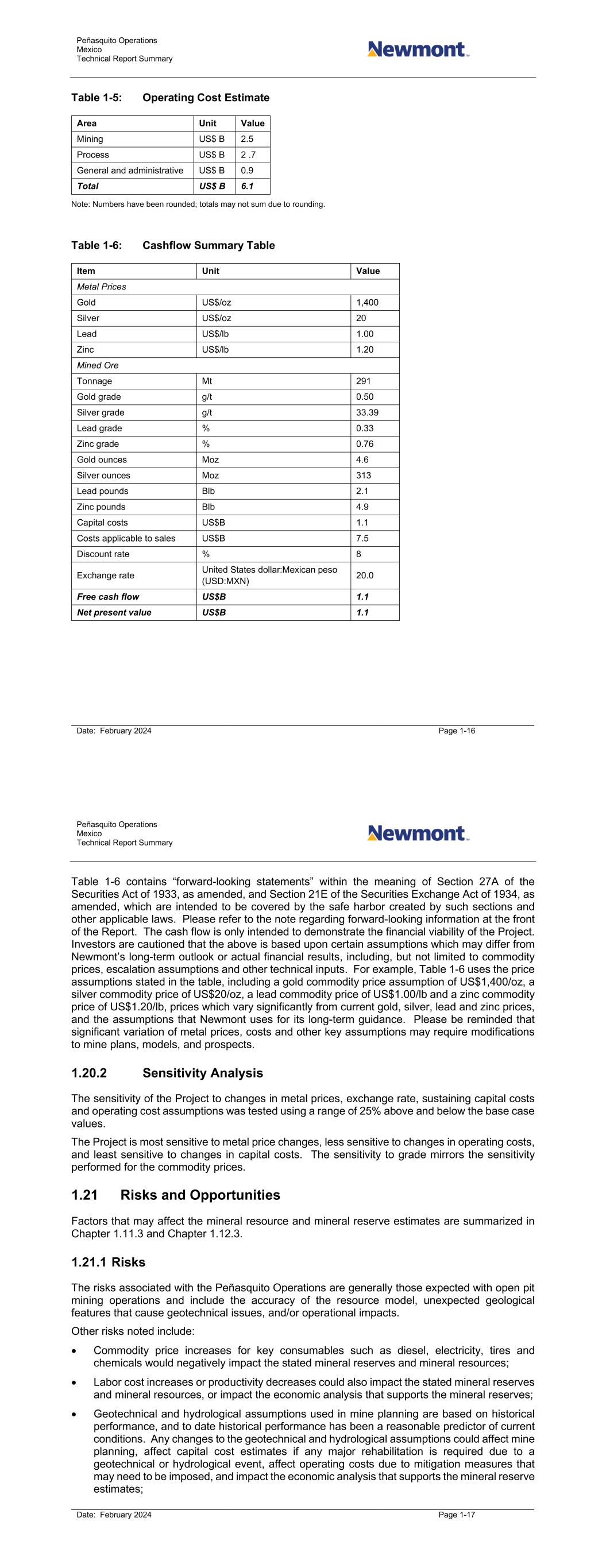 Peñasquito Operations Mexico Technical Report Summary Date: February 2024 Page 1-16 Table 1-5: Operating Cost Estimate Area Unit Value Mining US$ B 2.5 Process US$ B 2 .7 General and administrative US$ B 0.9 Total US$ B 6.1 Note: Numbers have been rounded; totals may not sum due to rounding. Table 1-6: Cashflow Summary Table Item Unit Value Metal Prices Gold US$/oz 1,400 Silver US$/oz 20 Lead US$/lb 1.00 Zinc US$/lb 1.20 Mined Ore Tonnage Mt 291 Gold grade g/t 0.50 Silver grade g/t 33.39 Lead grade % 0.33 Zinc grade % 0.76 Gold ounces Moz 4.6 Silver ounces Moz 313 Lead pounds Blb 2.1 Zinc pounds Blb 4.9 Capital costs US$B 1.1 Costs applicable to sales US$B 7.5 Discount rate % 8 Exchange rate United States dollar:Mexican peso (USD:MXN) 20.0 Free cash flow US$B 1.1 Net present value US$B 1.1 Peñasquito Operations Mexico Technical Report Summary Date: February 2024 Page 1-17 Table 1-6 contains “forward-looking statements” within the meaning of Section 27A of the Securities Act of 1933, as amended, and Section 21E of the Securities Exchange Act of 1934, as amended, which are intended to be covered by the safe harbor created by such sections and other applicable laws. Please refer to the note regarding forward-looking information at the front of the Report. The cash flow is only intended to demonstrate the financial viability of the Project. Investors are cautioned that the above is based upon certain assumptions which may differ from Newmont’s long-term outlook or actual financial results, including, but not limited to commodity prices, escalation assumptions and other technical inputs. For example, Table 1-6 uses the price assumptions stated in the table, including a gold commodity price assumption of US$1,400/oz, a silver commodity price of US$20/oz, a lead commodity price of US$1.00/lb and a zinc commodity price of US$1.20/lb, prices which vary significantly from current gold, silver, lead and zinc prices, and the assumptions that Newmont uses for its long-term guidance. Please be reminded that significant variation of metal prices, costs and other key assumptions may require modifications to mine plans, models, and prospects. 1.20.2 Sensitivity Analysis The sensitivity of the Project to changes in metal prices, exchange rate, sustaining capital costs and operating cost assumptions was tested using a range of 25% above and below the base case values. The Project is most sensitive to metal price changes, less sensitive to changes in operating costs, and least sensitive to changes in capital costs. The sensitivity to grade mirrors the sensitivity performed for the commodity prices. 1.21 Risks and Opportunities Factors that may affect the mineral resource and mineral reserve estimates are summarized in Chapter 1.11.3 and Chapter 1.12.3. 1.21.1 Risks The risks associated with the Peñasquito Operations are generally those expected with open pit mining operations and include the accuracy of the resource model, unexpected geological features that cause geotechnical issues, and/or operational impacts. Other risks noted include: • Commodity price increases for key consumables such as diesel, electricity, tires and chemicals would negatively impact the stated mineral reserves and mineral resources; • Labor cost increases or productivity decreases could also impact the stated mineral reserves and mineral resources, or impact the economic analysis that supports the mineral reserves; • Geotechnical and hydrological assumptions used in mine planning are based on historical performance, and to date historical performance has been a reasonable predictor of current conditions. Any changes to the geotechnical and hydrological assumptions could affect mine planning, affect capital cost estimates if any major rehabilitation is required due to a geotechnical or hydrological event, affect operating costs due to mitigation measures that may need to be imposed, and impact the economic analysis that supports the mineral reserve estimates;