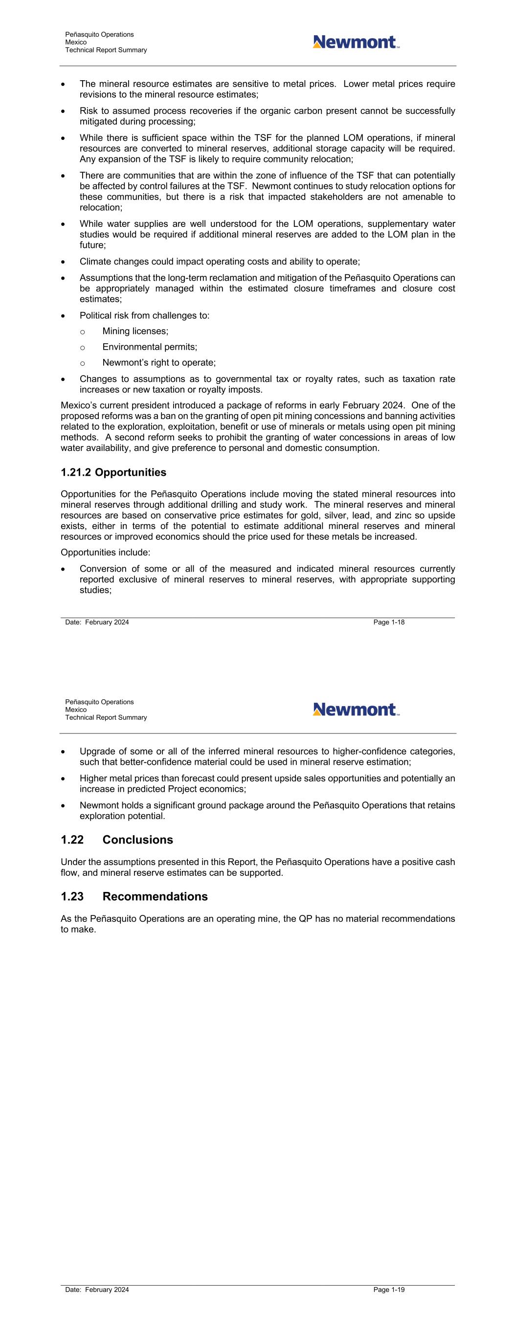 Peñasquito Operations Mexico Technical Report Summary Date: February 2024 Page 1-18 • The mineral resource estimates are sensitive to metal prices. Lower metal prices require revisions to the mineral resource estimates; • Risk to assumed process recoveries if the organic carbon present cannot be successfully mitigated during processing; • While there is sufficient space within the TSF for the planned LOM operations, if mineral resources are converted to mineral reserves, additional storage capacity will be required. Any expansion of the TSF is likely to require community relocation; • There are communities that are within the zone of influence of the TSF that can potentially be affected by control failures at the TSF. Newmont continues to study relocation options for these communities, but there is a risk that impacted stakeholders are not amenable to relocation; • While water supplies are well understood for the LOM operations, supplementary water studies would be required if additional mineral reserves are added to the LOM plan in the future; • Climate changes could impact operating costs and ability to operate; • Assumptions that the long-term reclamation and mitigation of the Peñasquito Operations can be appropriately managed within the estimated closure timeframes and closure cost estimates; • Political risk from challenges to: o Mining licenses; o Environmental permits; o Newmont’s right to operate; • Changes to assumptions as to governmental tax or royalty rates, such as taxation rate increases or new taxation or royalty imposts. Mexico’s current president introduced a package of reforms in early February 2024. One of the proposed reforms was a ban on the granting of open pit mining concessions and banning activities related to the exploration, exploitation, benefit or use of minerals or metals using open pit mining methods. A second reform seeks to prohibit the granting of water concessions in areas of low water availability, and give preference to personal and domestic consumption. 1.21.2 Opportunities Opportunities for the Peñasquito Operations include moving the stated mineral resources into mineral reserves through additional drilling and study work. The mineral reserves and mineral resources are based on conservative price estimates for gold, silver, lead, and zinc so upside exists, either in terms of the potential to estimate additional mineral reserves and mineral resources or improved economics should the price used for these metals be increased. Opportunities include: • Conversion of some or all of the measured and indicated mineral resources currently reported exclusive of mineral reserves to mineral reserves, with appropriate supporting studies; Peñasquito Operations Mexico Technical Report Summary Date: February 2024 Page 1-19 • Upgrade of some or all of the inferred mineral resources to higher-confidence categories, such that better-confidence material could be used in mineral reserve estimation; • Higher metal prices than forecast could present upside sales opportunities and potentially an increase in predicted Project economics; • Newmont holds a significant ground package around the Peñasquito Operations that retains exploration potential. 1.22 Conclusions Under the assumptions presented in this Report, the Peñasquito Operations have a positive cash flow, and mineral reserve estimates can be supported. 1.23 Recommendations As the Peñasquito Operations are an operating mine, the QP has no material recommendations to make.