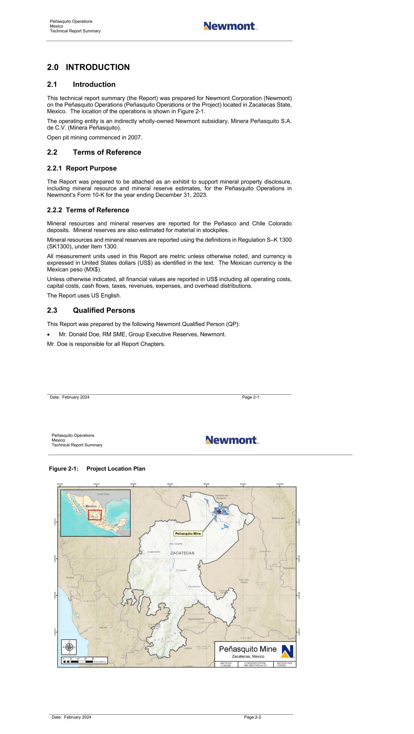 Peñasquito Operations Mexico Technical Report Summary Date: February 2024 Page 2-1 2.0 INTRODUCTION 2.1 Introduction This technical report summary (the Report) was prepared for Newmont Corporation (Newmont) on the Peñasquito Operations (Peñasquito Operations or the Project) located in Zacatecas State, Mexico. The location of the operations is shown in Figure 2-1. The operating entity is an indirectly wholly-owned Newmont subsidiary, Minera Peñasquito S.A. de C.V. (Minera Peñasquito). Open pit mining commenced in 2007. 2.2 Terms of Reference 2.2.1 Report Purpose The Report was prepared to be attached as an exhibit to support mineral property disclosure, including mineral resource and mineral reserve estimates, for the Peñasquito Operations in Newmont’s Form 10-K for the year ending December 31, 2023. 2.2.2 Terms of Reference Mineral resources and mineral reserves are reported for the Peñasco and Chile Colorado deposits. Mineral reserves are also estimated for material in stockpiles. Mineral resources and mineral reserves are reported using the definitions in Regulation S–K 1300 (SK1300), under Item 1300. All measurement units used in this Report are metric unless otherwise noted, and currency is expressed in United States dollars (US$) as identified in the text. The Mexican currency is the Mexican peso (MX$). Unless otherwise indicated, all financial values are reported in US$ including all operating costs, capital costs, cash flows, taxes, revenues, expenses, and overhead distributions. The Report uses US English. 2.3 Qualified Persons This Report was prepared by the following Newmont Qualified Person (QP): • Mr. Donald Doe, RM SME, Group Executive Reserves, Newmont. Mr. Doe is responsible for all Report Chapters. Peñasquito Operations Mexico Technical Report Summary Date: February 2024 Page 2-2 Figure 2-1: Project Location Plan