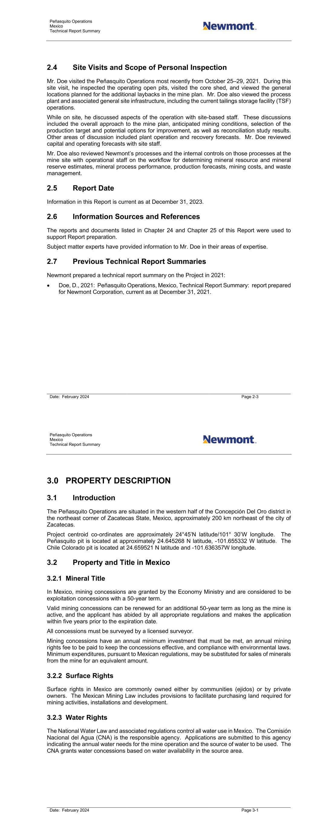 Peñasquito Operations Mexico Technical Report Summary Date: February 2024 Page 2-3 2.4 Site Visits and Scope of Personal Inspection Mr. Doe visited the Peñasquito Operations most recently from October 25–29, 2021. During this site visit, he inspected the operating open pits, visited the core shed, and viewed the general locations planned for the additional laybacks in the mine plan. Mr. Doe also viewed the process plant and associated general site infrastructure, including the current tailings storage facility (TSF) operations. While on site, he discussed aspects of the operation with site-based staff. These discussions included the overall approach to the mine plan, anticipated mining conditions, selection of the production target and potential options for improvement, as well as reconciliation study results. Other areas of discussion included plant operation and recovery forecasts. Mr. Doe reviewed capital and operating forecasts with site staff. Mr. Doe also reviewed Newmont’s processes and the internal controls on those processes at the mine site with operational staff on the workflow for determining mineral resource and mineral reserve estimates, mineral process performance, production forecasts, mining costs, and waste management. 2.5 Report Date Information in this Report is current as at December 31, 2023. 2.6 Information Sources and References The reports and documents listed in Chapter 24 and Chapter 25 of this Report were used to support Report preparation. Subject matter experts have provided information to Mr. Doe in their areas of expertise. 2.7 Previous Technical Report Summaries Newmont prepared a technical report summary on the Project in 2021: • Doe, D., 2021: Peñasquito Operations, Mexico, Technical Report Summary: report prepared for Newmont Corporation, current as at December 31, 2021. Peñasquito Operations Mexico Technical Report Summary Date: February 2024 Page 3-1 3.0 PROPERTY DESCRIPTION 3.1 Introduction The Peñasquito Operations are situated in the western half of the Concepción Del Oro district in the northeast corner of Zacatecas State, Mexico, approximately 200 km northeast of the city of Zacatecas. Project centroid co-ordinates are approximately 24°45’N latitude/101° 30’W longitude. The Peñasquito pit is located at approximately 24.645268 N latitude, -101.655332 W latitude. The Chile Colorado pit is located at 24.659521 N latitude and -101.636357W longitude. 3.2 Property and Title in Mexico 3.2.1 Mineral Title In Mexico, mining concessions are granted by the Economy Ministry and are considered to be exploitation concessions with a 50-year term. Valid mining concessions can be renewed for an additional 50-year term as long as the mine is active, and the applicant has abided by all appropriate regulations and makes the application within five years prior to the expiration date. All concessions must be surveyed by a licensed surveyor. Mining concessions have an annual minimum investment that must be met, an annual mining rights fee to be paid to keep the concessions effective, and compliance with environmental laws. Minimum expenditures, pursuant to Mexican regulations, may be substituted for sales of minerals from the mine for an equivalent amount. 3.2.2 Surface Rights Surface rights in Mexico are commonly owned either by communities (ejidos) or by private owners. The Mexican Mining Law includes provisions to facilitate purchasing land required for mining activities, installations and development. 3.2.3 Water Rights The National Water Law and associated regulations control all water use in Mexico. The Comisión Nacional del Agua (CNA) is the responsible agency. Applications are submitted to this agency indicating the annual water needs for the mine operation and the source of water to be used. The CNA grants water concessions based on water availability in the source area.