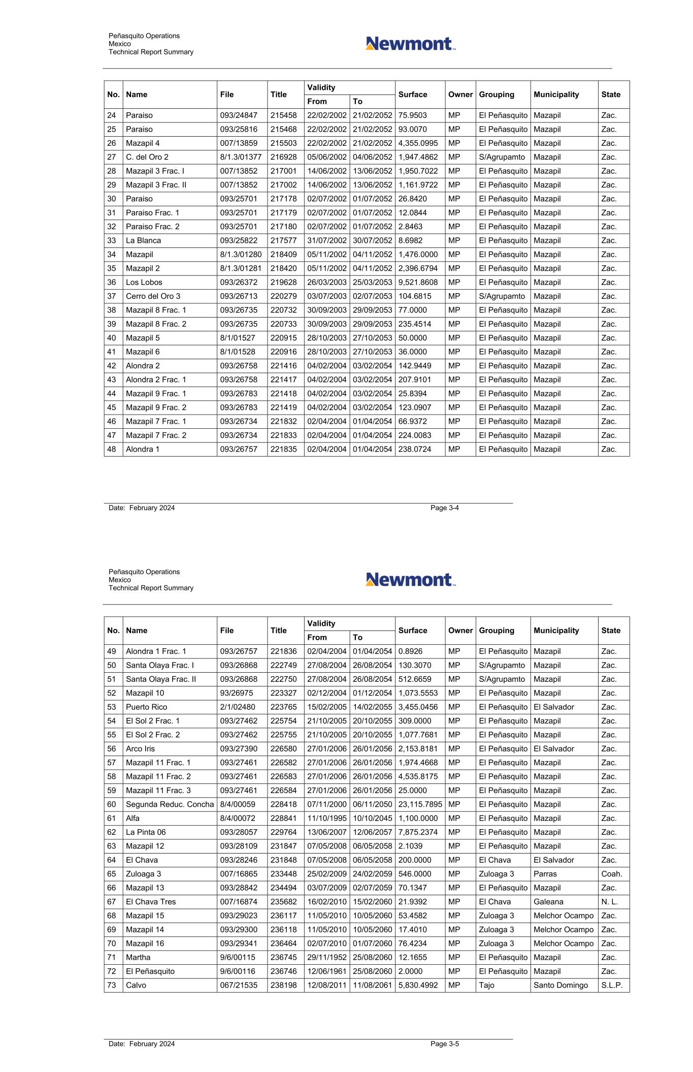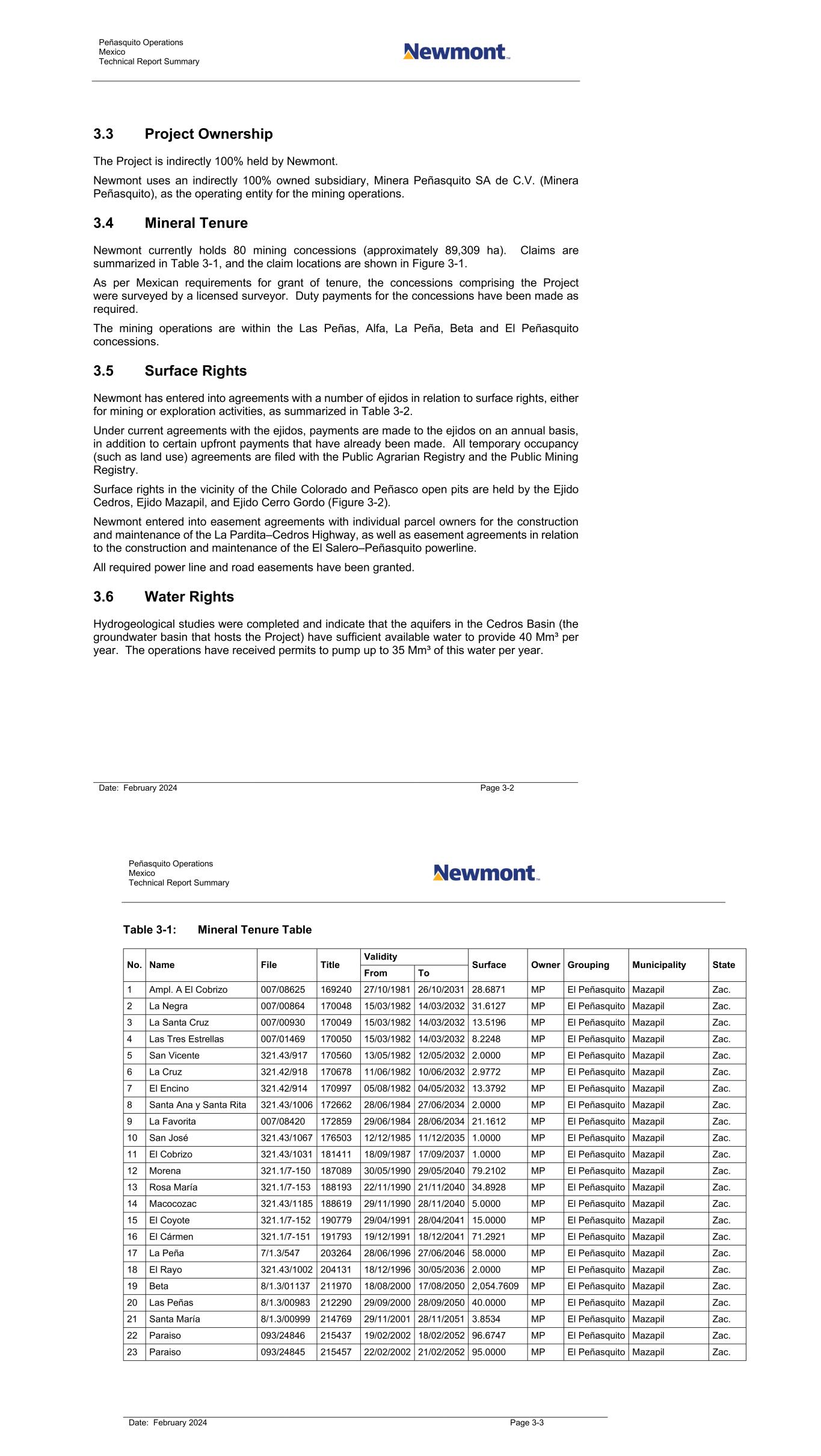 Peñasquito Operations Mexico Technical Report Summary Date: February 2024 Page 3-2 3.3 Project Ownership The Project is indirectly 100% held by Newmont. Newmont uses an indirectly 100% owned subsidiary, Minera Peñasquito SA de C.V. (Minera Peñasquito), as the operating entity for the mining operations. 3.4 Mineral Tenure Newmont currently holds 80 mining concessions (approximately 89,309 ha). Claims are summarized in Table 3-1, and the claim locations are shown in Figure 3-1. As per Mexican requirements for grant of tenure, the concessions comprising the Project were surveyed by a licensed surveyor. Duty payments for the concessions have been made as required. The mining operations are within the Las Peñas, Alfa, La Peña, Beta and El Peñasquito concessions. 3.5 Surface Rights Newmont has entered into agreements with a number of ejidos in relation to surface rights, either for mining or exploration activities, as summarized in Table 3-2. Under current agreements with the ejidos, payments are made to the ejidos on an annual basis, in addition to certain upfront payments that have already been made. All temporary occupancy (such as land use) agreements are filed with the Public Agrarian Registry and the Public Mining Registry. Surface rights in the vicinity of the Chile Colorado and Peñasco open pits are held by the Ejido Cedros, Ejido Mazapil, and Ejido Cerro Gordo (Figure 3-2). Newmont entered into easement agreements with individual parcel owners for the construction and maintenance of the La Pardita–Cedros Highway, as well as easement agreements in relation to the construction and maintenance of the El Salero–Peñasquito powerline. All required power line and road easements have been granted. 3.6 Water Rights Hydrogeological studies were completed and indicate that the aquifers in the Cedros Basin (the groundwater basin that hosts the Project) have sufficient available water to provide 40 Mm³ per year. The operations have received permits to pump up to 35 Mm³ of this water per year. Peñasquito Operations Mexico Technical Report Summary Date: February 2024 Page 3-3 Table 3-1: Mineral Tenure Table No. Name File Title Validity Surface Owner Grouping Municipality State From To 1 Ampl. A El Cobrizo 007/08625 169240 27/10/1981 26/10/2031 28.6871 MP El Peñasquito Mazapil Zac. 2 La Negra 007/00864 170048 15/03/1982 14/03/2032 31.6127 MP El Peñasquito Mazapil Zac. 3 La Santa Cruz 007/00930 170049 15/03/1982 14/03/2032 13.5196 MP El Peñasquito Mazapil Zac. 4 Las Tres Estrellas 007/01469 170050 15/03/1982 14/03/2032 8.2248 MP El Peñasquito Mazapil Zac. 5 San Vicente 321.43/917 170560 13/05/1982 12/05/2032 2.0000 MP El Peñasquito Mazapil Zac. 6 La Cruz 321.42/918 170678 11/06/1982 10/06/2032 2.9772 MP El Peñasquito Mazapil Zac. 7 El Encino 321.42/914 170997 05/08/1982 04/05/2032 13.3792 MP El Peñasquito Mazapil Zac. 8 Santa Ana y Santa Rita 321.43/1006 172662 28/06/1984 27/06/2034 2.0000 MP El Peñasquito Mazapil Zac. 9 La Favorita 007/08420 172859 29/06/1984 28/06/2034 21.1612 MP El Peñasquito Mazapil Zac. 10 San José 321.43/1067 176503 12/12/1985 11/12/2035 1.0000 MP El Peñasquito Mazapil Zac. 11 El Cobrizo 321.43/1031 181411 18/09/1987 17/09/2037 1.0000 MP El Peñasquito Mazapil Zac. 12 Morena 321.1/7-150 187089 30/05/1990 29/05/2040 79.2102 MP El Peñasquito Mazapil Zac. 13 Rosa María 321.1/7-153 188193 22/11/1990 21/11/2040 34.8928 MP El Peñasquito Mazapil Zac. 14 Macocozac 321.43/1185 188619 29/11/1990 28/11/2040 5.0000 MP El Peñasquito Mazapil Zac. 15 El Coyote 321.1/7-152 190779 29/04/1991 28/04/2041 15.0000 MP El Peñasquito Mazapil Zac. 16 El Cármen 321.1/7-151 191793 19/12/1991 18/12/2041 71.2921 MP El Peñasquito Mazapil Zac. 17 La Peña 7/1.3/547 203264 28/06/1996 27/06/2046 58.0000 MP El Peñasquito Mazapil Zac. 18 El Rayo 321.43/1002 204131 18/12/1996 30/05/2036 2.0000 MP El Peñasquito Mazapil Zac. 19 Beta 8/1.3/01137 211970 18/08/2000 17/08/2050 2,054.7609 MP El Peñasquito Mazapil Zac. 20 Las Peñas 8/1.3/00983 212290 29/09/2000 28/09/2050 40.0000 MP El Peñasquito Mazapil Zac. 21 Santa María 8/1.3/00999 214769 29/11/2001 28/11/2051 3.8534 MP El Peñasquito Mazapil Zac. 22 Paraiso 093/24846 215437 19/02/2002 18/02/2052 96.6747 MP El Peñasquito Mazapil Zac. 23 Paraiso 093/24845 215457 22/02/2002 21/02/2052 95.0000 MP El Peñasquito Mazapil Zac.