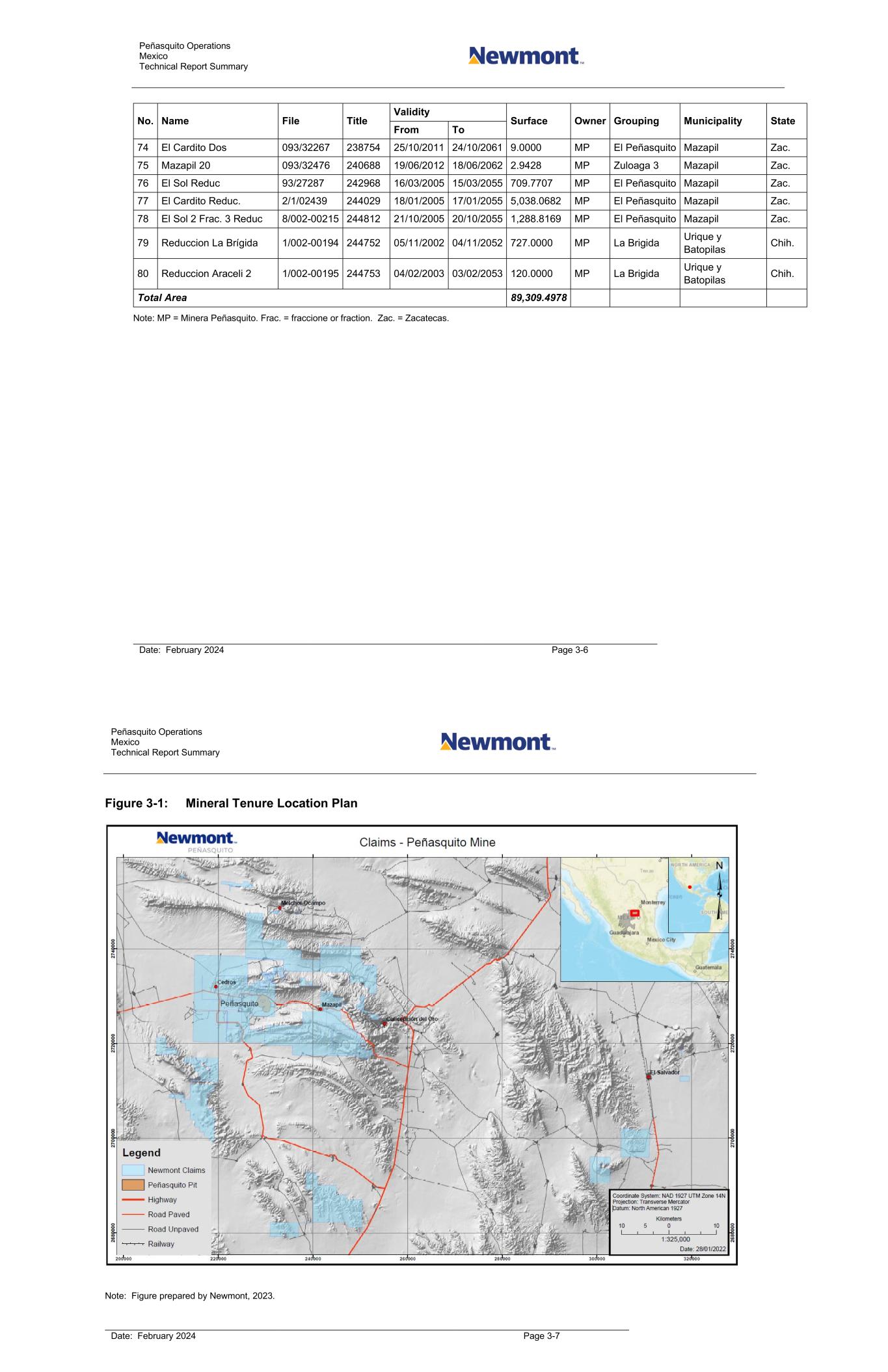 Peñasquito Operations Mexico Technical Report Summary Date: February 2024 Page 3-6 No. Name File Title Validity Surface Owner Grouping Municipality State From To 74 El Cardito Dos 093/32267 238754 25/10/2011 24/10/2061 9.0000 MP El Peñasquito Mazapil Zac. 75 Mazapil 20 093/32476 240688 19/06/2012 18/06/2062 2.9428 MP Zuloaga 3 Mazapil Zac. 76 El Sol Reduc 93/27287 242968 16/03/2005 15/03/2055 709.7707 MP El Peñasquito Mazapil Zac. 77 El Cardito Reduc. 2/1/02439 244029 18/01/2005 17/01/2055 5,038.0682 MP El Peñasquito Mazapil Zac. 78 El Sol 2 Frac. 3 Reduc 8/002-00215 244812 21/10/2005 20/10/2055 1,288.8169 MP El Peñasquito Mazapil Zac. 79 Reduccion La Brígida 1/002-00194 244752 05/11/2002 04/11/2052 727.0000 MP La Brigida Urique y Batopilas Chih. 80 Reduccion Araceli 2 1/002-00195 244753 04/02/2003 03/02/2053 120.0000 MP La Brigida Urique y Batopilas Chih. Total Area 89,309.4978 Note: MP = Minera Peñasquito. Frac. = fraccione or fraction. Zac. = Zacatecas. Peñasquito Operations Mexico Technical Report Summary Date: February 2024 Page 3-7 Figure 3-1: Mineral Tenure Location Plan Note: Figure prepared by Newmont, 2023.
