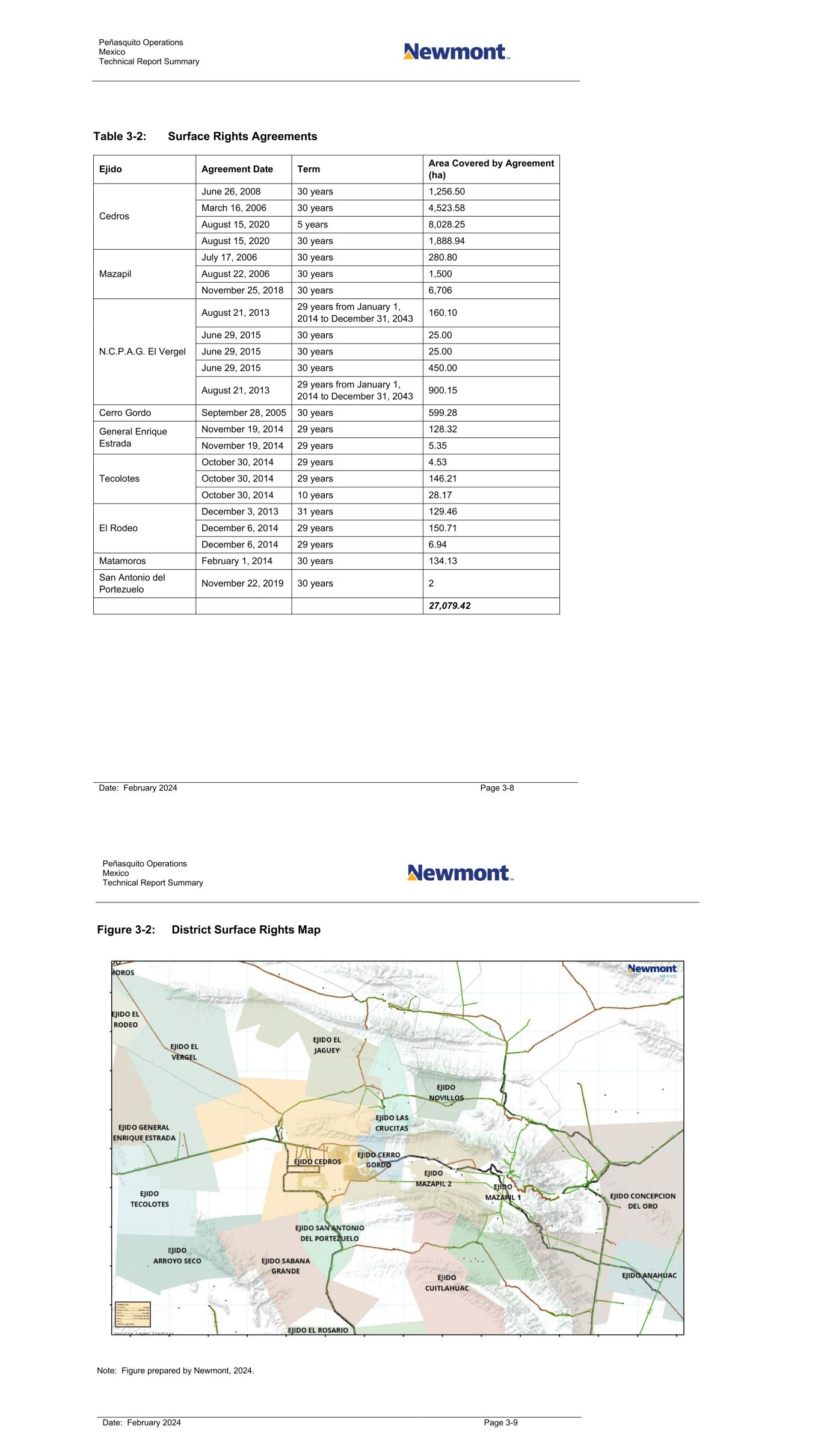 Peñasquito Operations Mexico Technical Report Summary Date: February 2024 Page 3-8 Table 3-2: Surface Rights Agreements Ejido Agreement Date Term Area Covered by Agreement (ha) Cedros June 26, 2008 30 years 1,256.50 March 16, 2006 30 years 4,523.58 August 15, 2020 5 years 8,028.25 August 15, 2020 30 years 1,888.94 Mazapil July 17, 2006 30 years 280.80 August 22, 2006 30 years 1,500 November 25, 2018 30 years 6,706 N.C.P.A.G. El Vergel August 21, 2013 29 years from January 1, 2014 to December 31, 2043 160.10 June 29, 2015 30 years 25.00 June 29, 2015 30 years 25.00 June 29, 2015 30 years 450.00 August 21, 2013 29 years from January 1, 2014 to December 31, 2043 900.15 Cerro Gordo September 28, 2005 30 years 599.28 General Enrique Estrada November 19, 2014 29 years 128.32 November 19, 2014 29 years 5.35 Tecolotes October 30, 2014 29 years 4.53 October 30, 2014 29 years 146.21 October 30, 2014 10 years 28.17 El Rodeo December 3, 2013 31 years 129.46 December 6, 2014 29 years 150.71 December 6, 2014 29 years 6.94 Matamoros February 1, 2014 30 years 134.13 San Antonio del Portezuelo November 22, 2019 30 years 2 27,079.42 Peñasquito Operations Mexico Technical Report Summary Date: February 2024 Page 3-9 Figure 3-2: District Surface Rights Map Note: Figure prepared by Newmont, 2024.