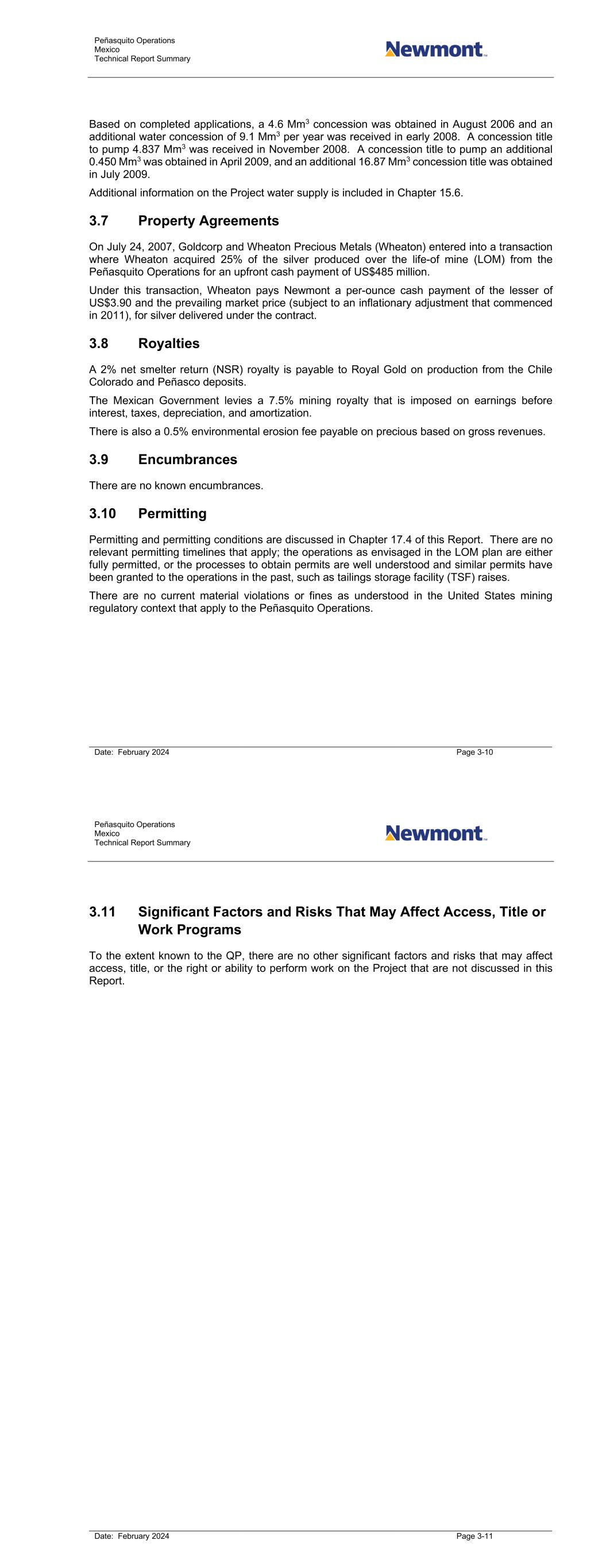 Peñasquito Operations Mexico Technical Report Summary Date: February 2024 Page 3-10 Based on completed applications, a 4.6 Mm3 concession was obtained in August 2006 and an additional water concession of 9.1 Mm3 per year was received in early 2008. A concession title to pump 4.837 Mm3 was received in November 2008. A concession title to pump an additional 0.450 Mm3 was obtained in April 2009, and an additional 16.87 Mm3 concession title was obtained in July 2009. Additional information on the Project water supply is included in Chapter 15.6. 3.7 Property Agreements On July 24, 2007, Goldcorp and Wheaton Precious Metals (Wheaton) entered into a transaction where Wheaton acquired 25% of the silver produced over the life-of mine (LOM) from the Peñasquito Operations for an upfront cash payment of US$485 million. Under this transaction, Wheaton pays Newmont a per-ounce cash payment of the lesser of US$3.90 and the prevailing market price (subject to an inflationary adjustment that commenced in 2011), for silver delivered under the contract. 3.8 Royalties A 2% net smelter return (NSR) royalty is payable to Royal Gold on production from the Chile Colorado and Peñasco deposits. The Mexican Government levies a 7.5% mining royalty that is imposed on earnings before interest, taxes, depreciation, and amortization. There is also a 0.5% environmental erosion fee payable on precious based on gross revenues. 3.9 Encumbrances There are no known encumbrances. 3.10 Permitting Permitting and permitting conditions are discussed in Chapter 17.4 of this Report. There are no relevant permitting timelines that apply; the operations as envisaged in the LOM plan are either fully permitted, or the processes to obtain permits are well understood and similar permits have been granted to the operations in the past, such as tailings storage facility (TSF) raises. There are no current material violations or fines as understood in the United States mining regulatory context that apply to the Peñasquito Operations. Peñasquito Operations Mexico Technical Report Summary Date: February 2024 Page 3-11 3.11 Significant Factors and Risks That May Affect Access, Title or Work Programs To the extent known to the QP, there are no other significant factors and risks that may affect access, title, or the right or ability to perform work on the Project that are not discussed in this Report.